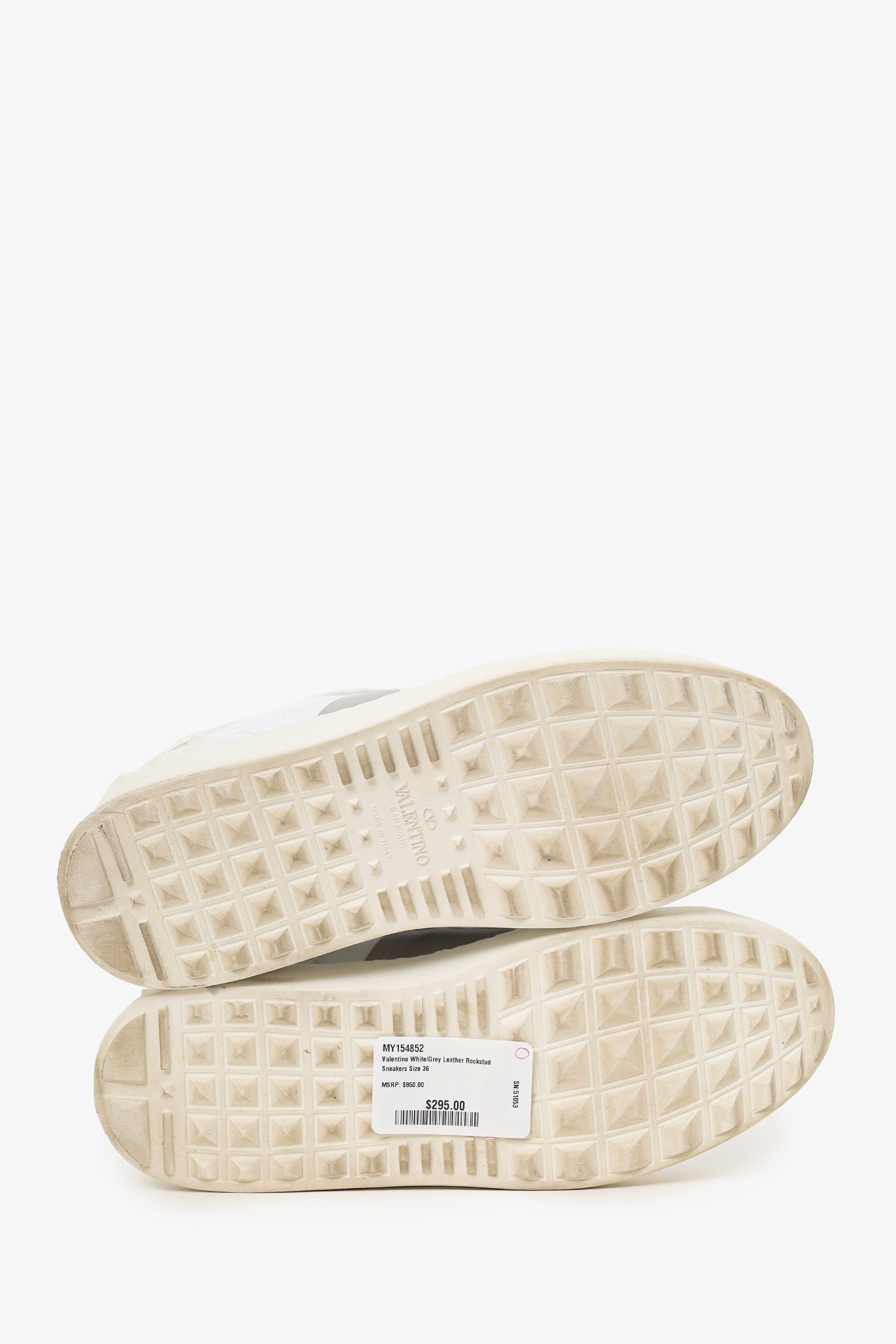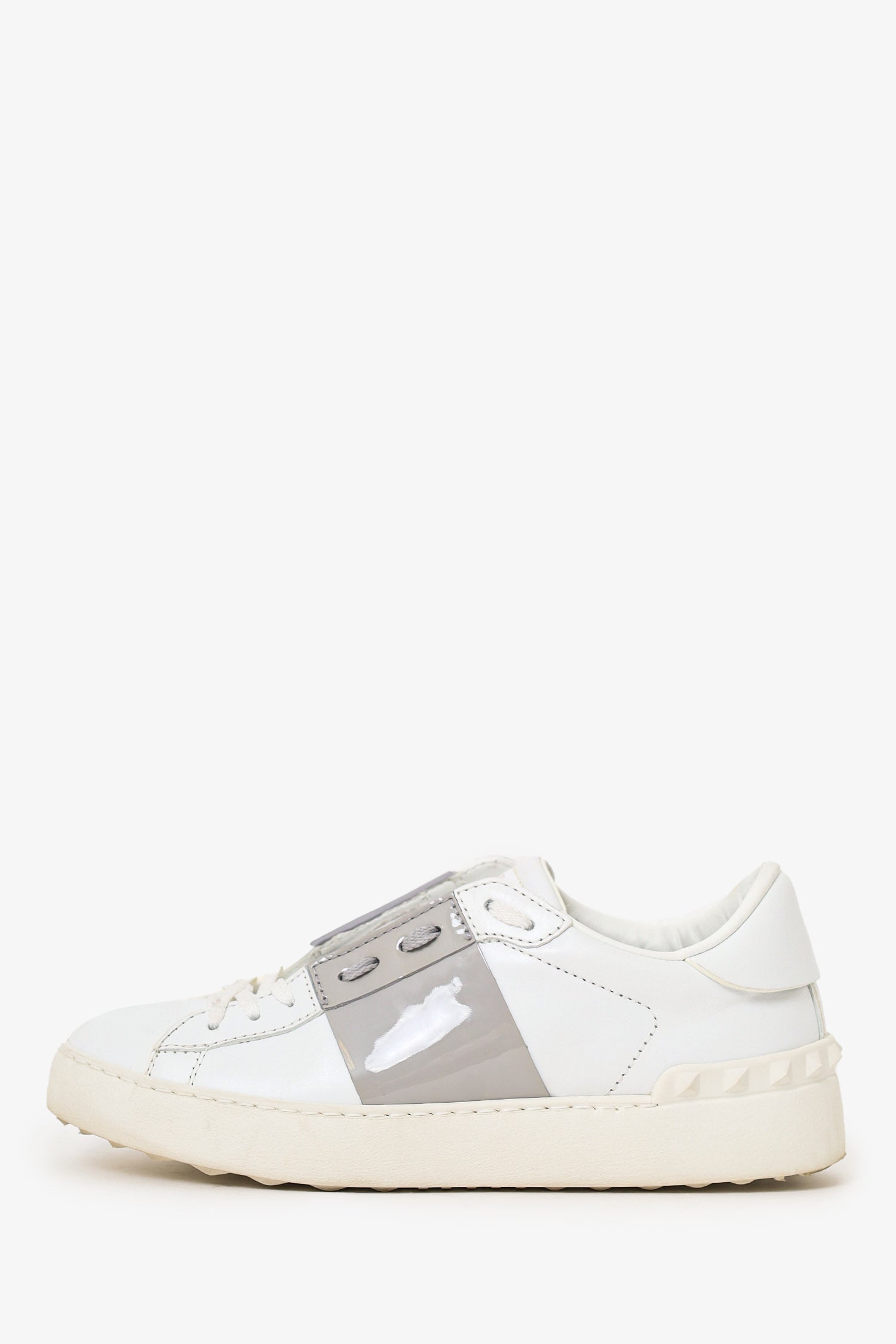 Refresh availabilityValentino White/Grey Leather Rockstud Sneakers. Slip-on. Round-toe. Partially-hidden lace-up closure at top. Stud detailing on rear. Tonal stitching.