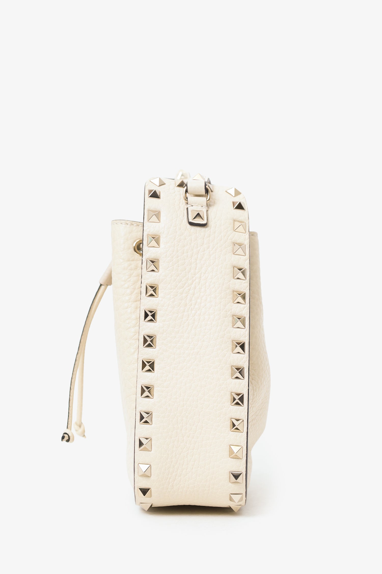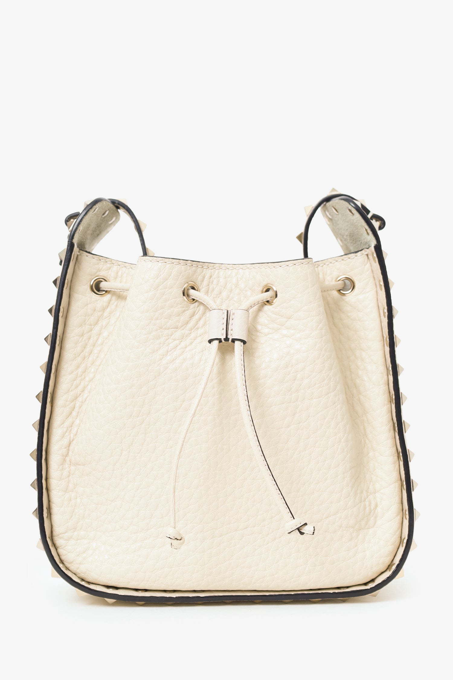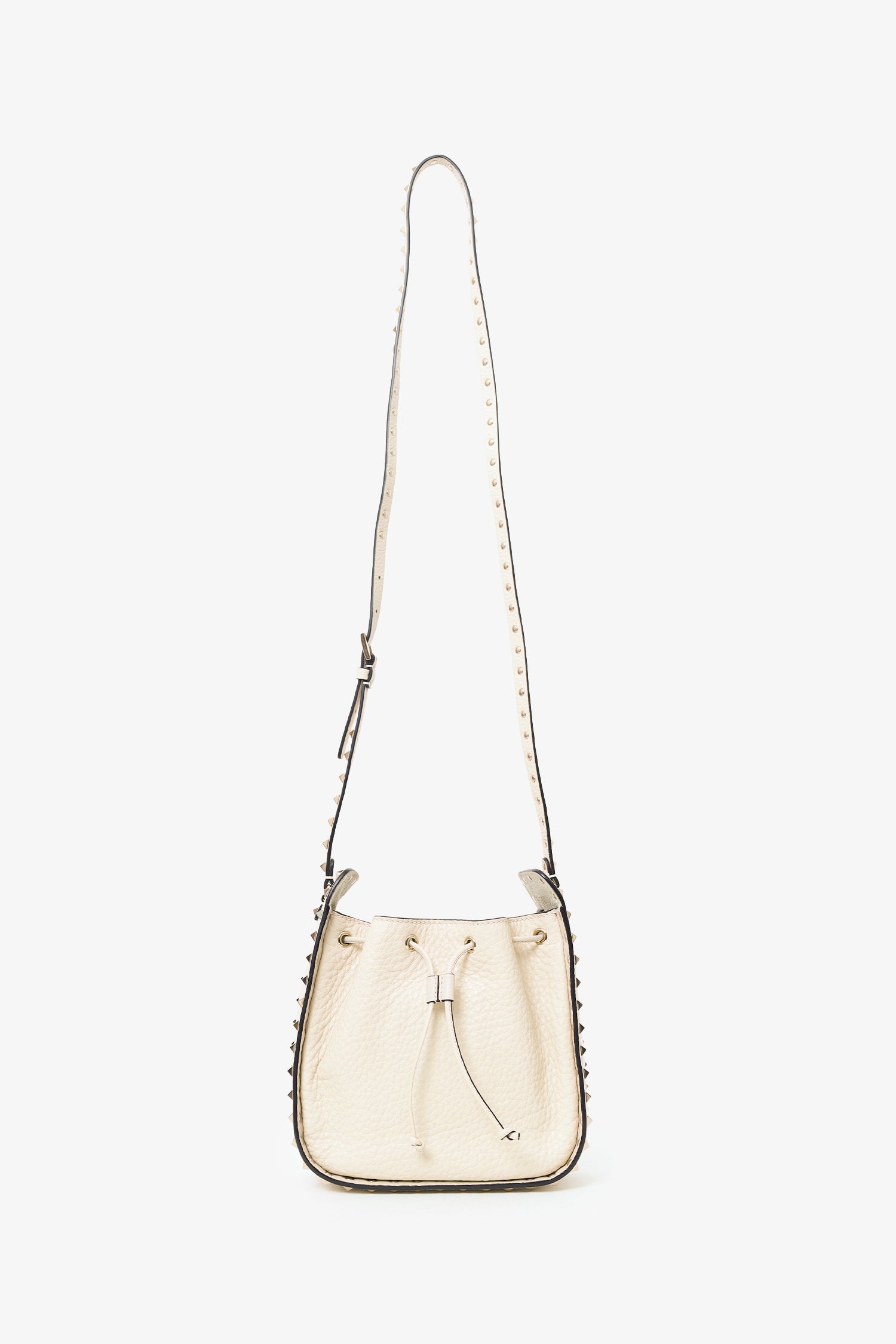 Refresh availabilityValentino White Leather Rockstud Bucket Bag. Top cinching drawcord. Leather crossbody with adjustable buckle closure. Suede-lined interior. 2 interior pockets; 1 slip and 1 zip. Silver-tone hardware. Tonal stitching.
