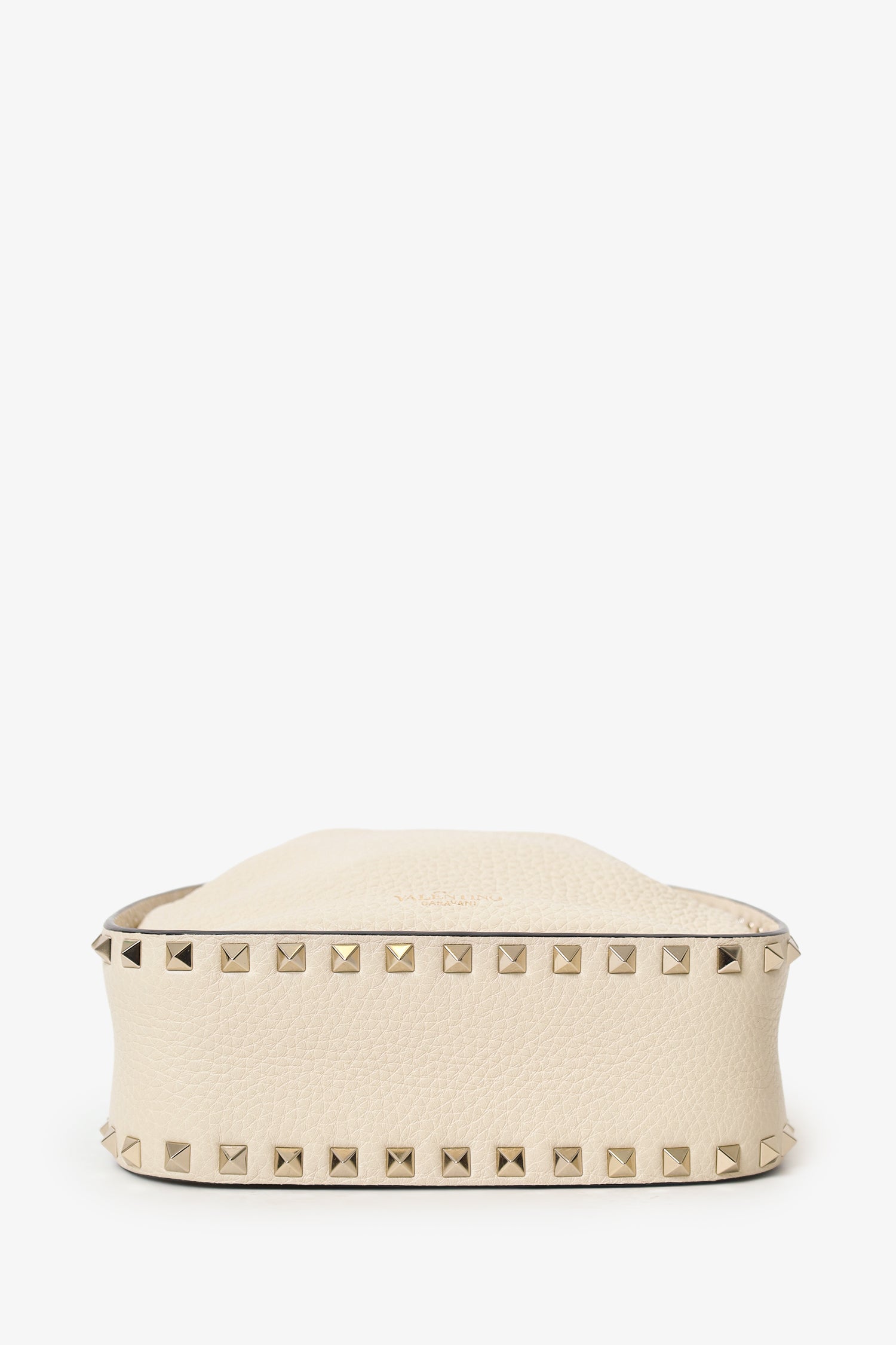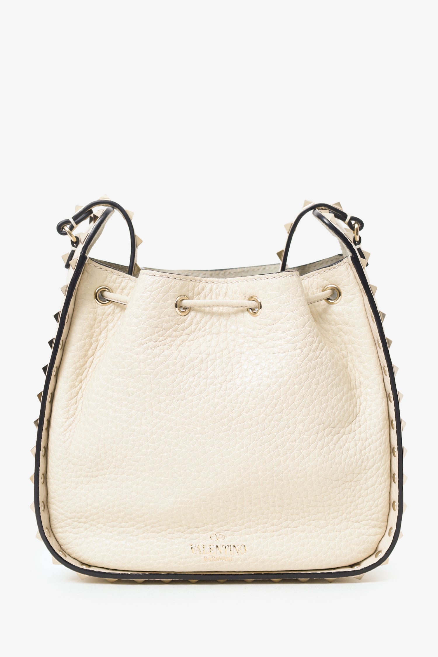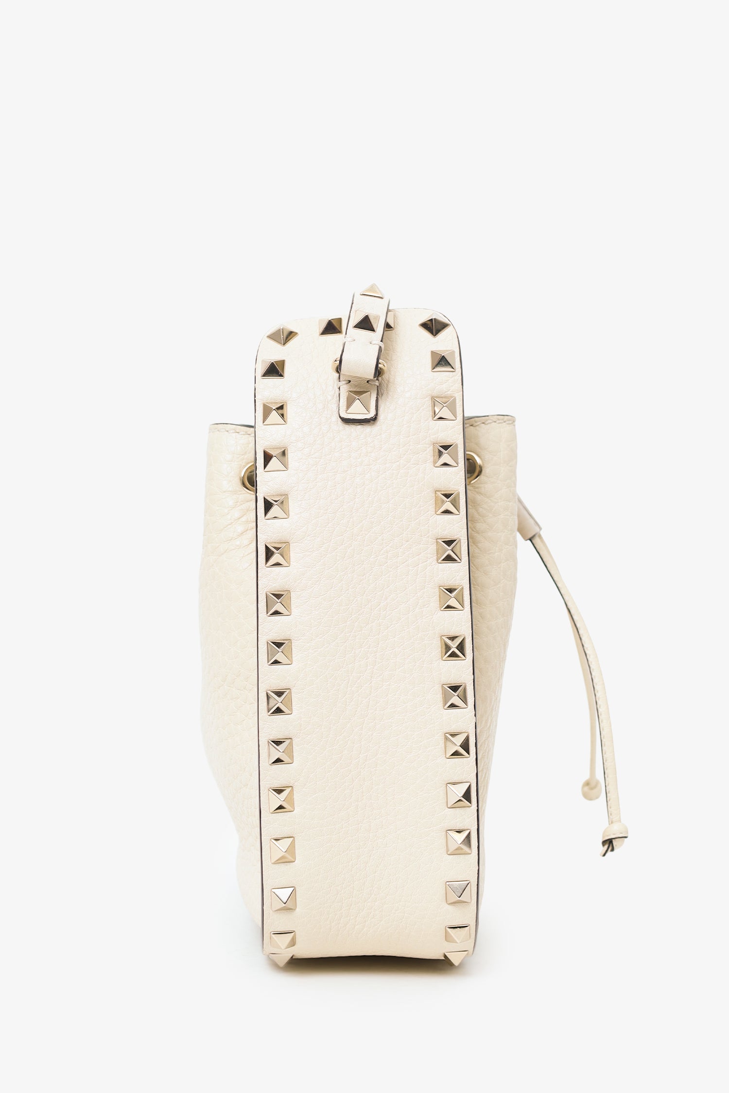 Refresh availabilityValentino White Leather Rockstud Bucket Bag. Top cinching drawcord. Leather crossbody with adjustable buckle closure. Suede-lined interior. 2 interior pockets; 1 slip and 1 zip. Silver-tone hardware. Tonal stitching.