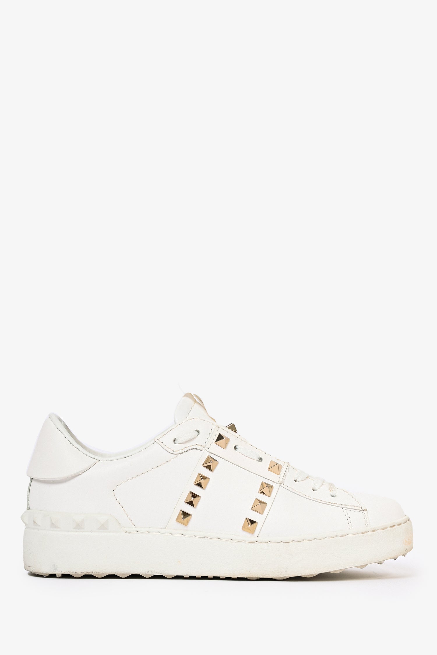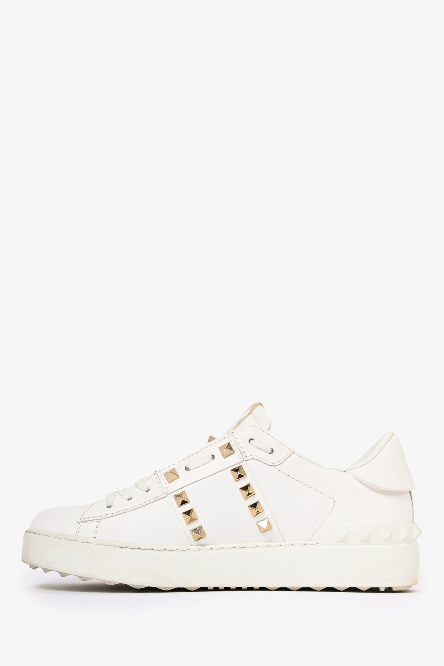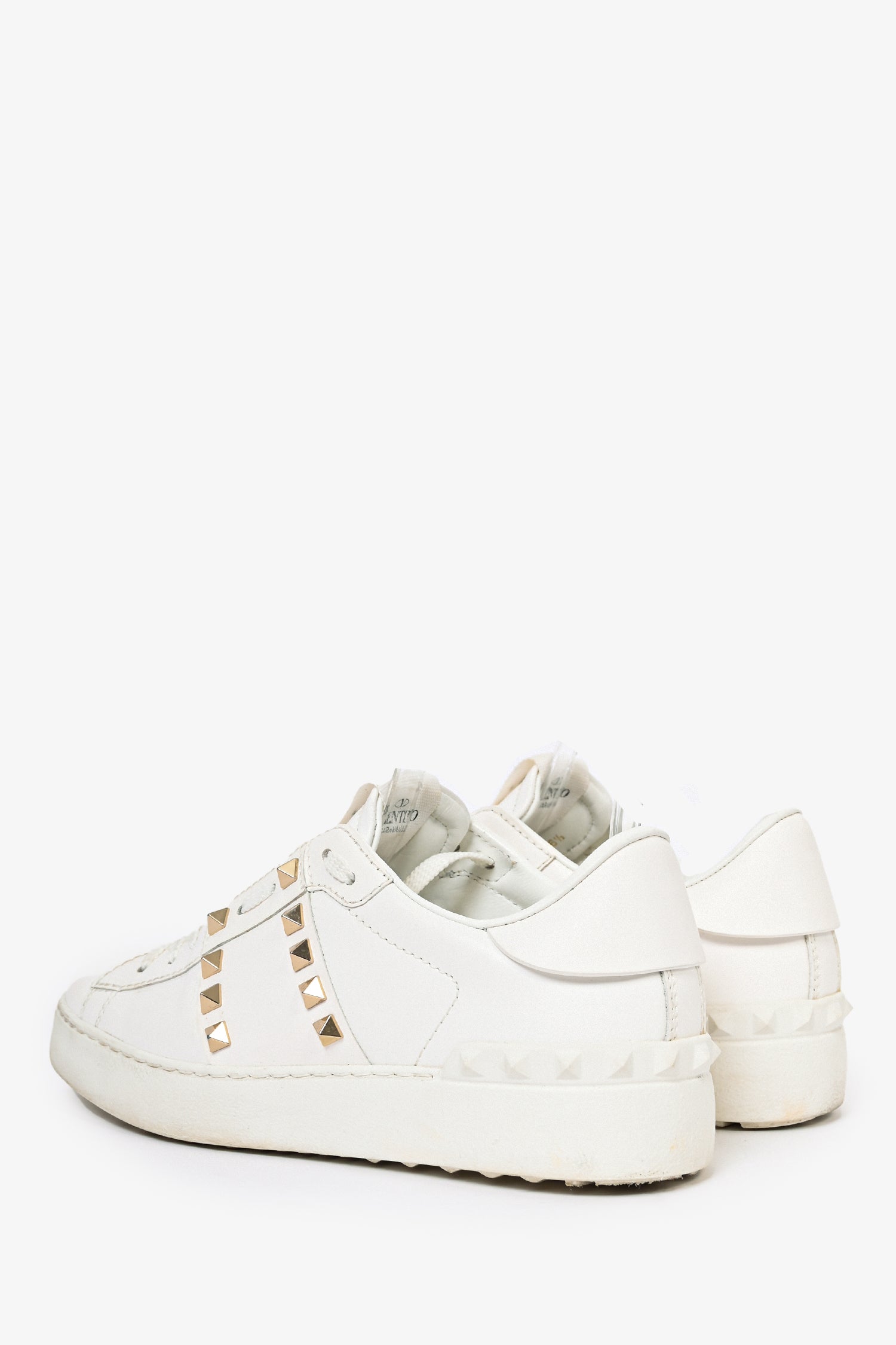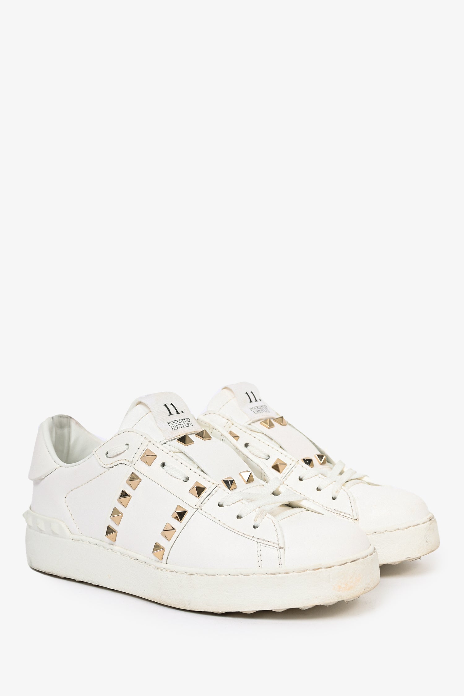 Refresh availabilityValentino White Leather Rockstud Sneakers. Round toe. Lace-up closure. Gold-tone triangular studs. Leather lined interior. Rubber sole with triangular detailing. Tonal stitching.