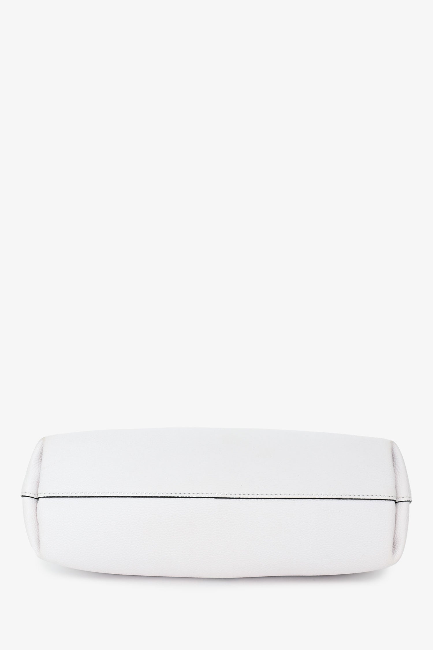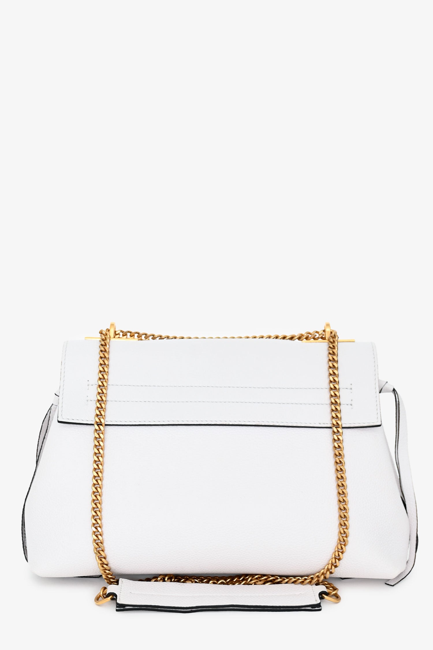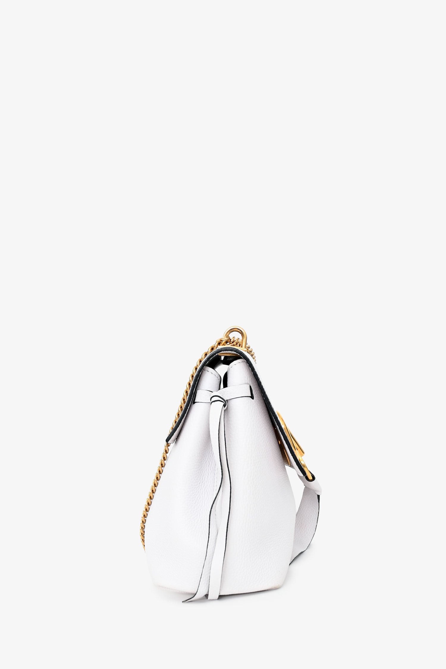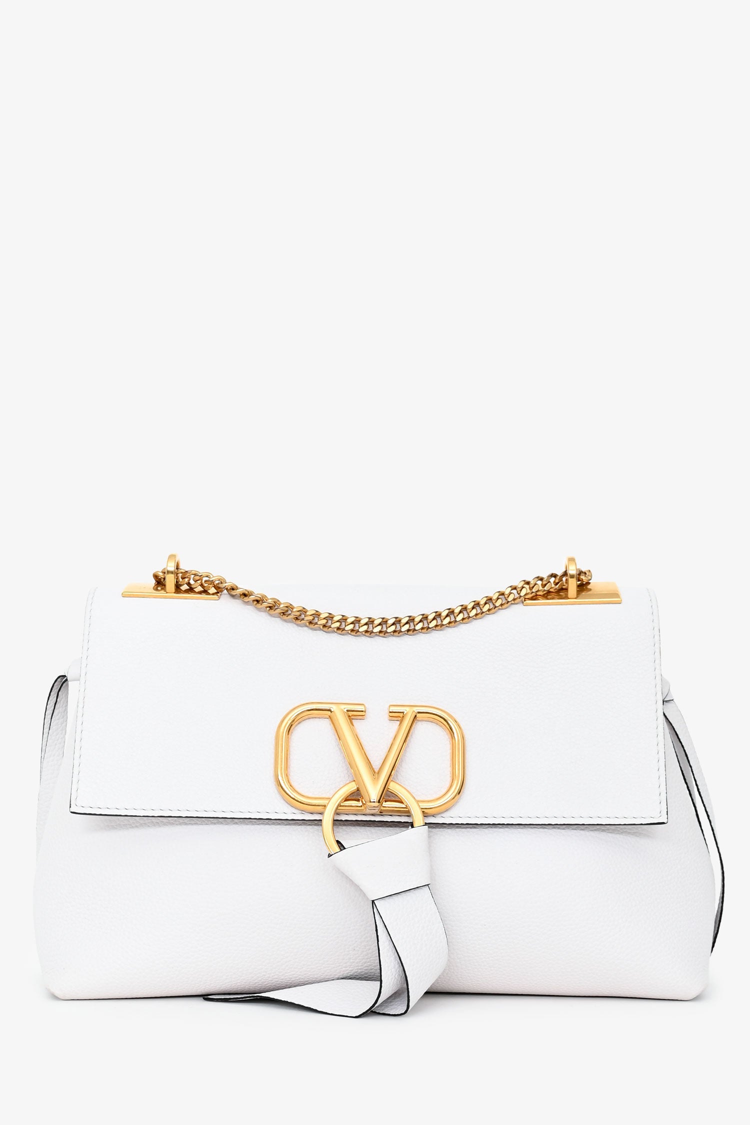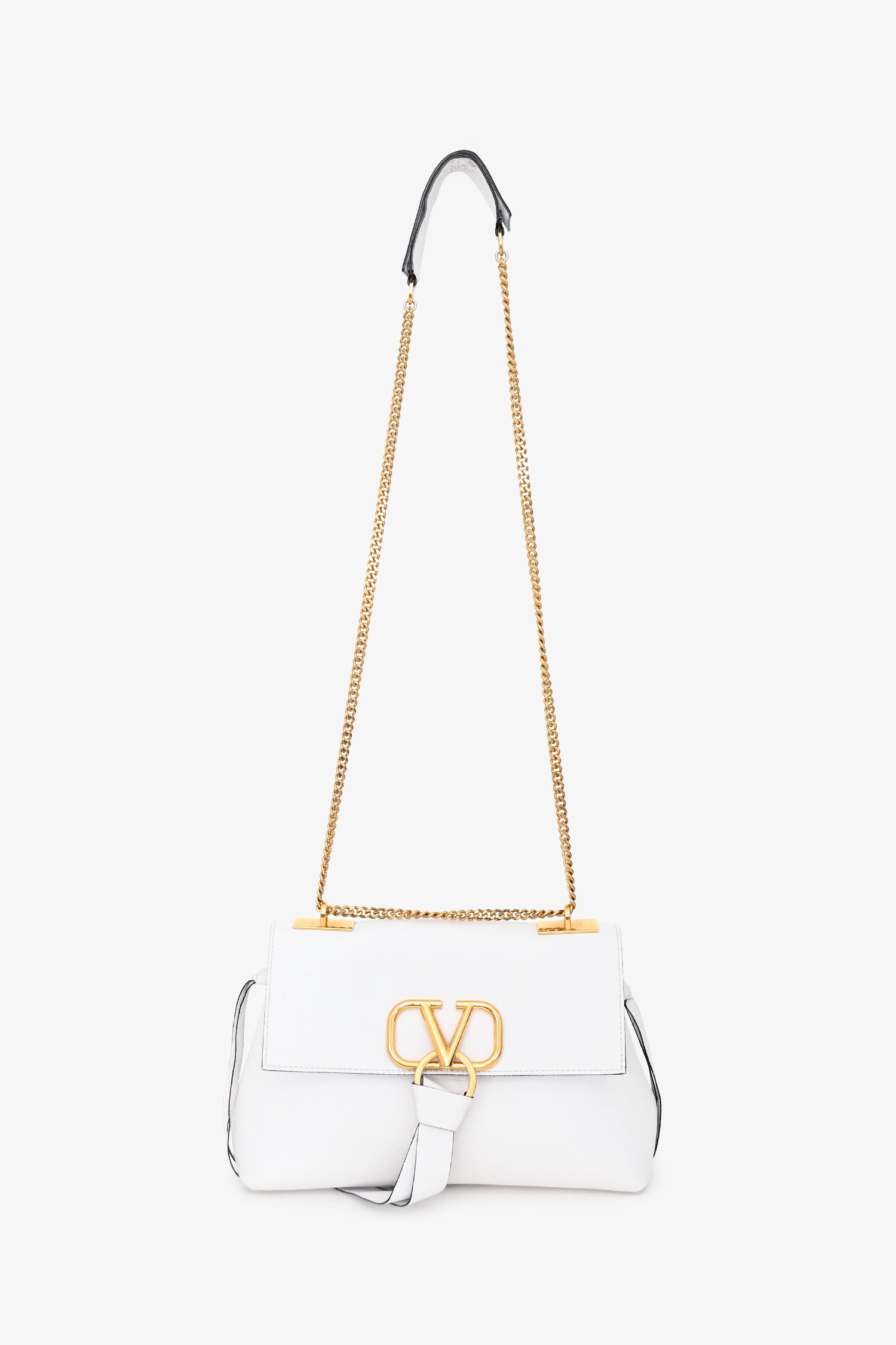 Refresh availabilityValentino White Leather VRing Shoulder Bag. Front flap closure with lock clasp. Chain link shoulder strap with leather shoulder detail. Side leather tie detailing. 1 interior slip pocket; 1 interior zip pocket. Gold-tone hardware. Tonal stitching.