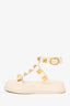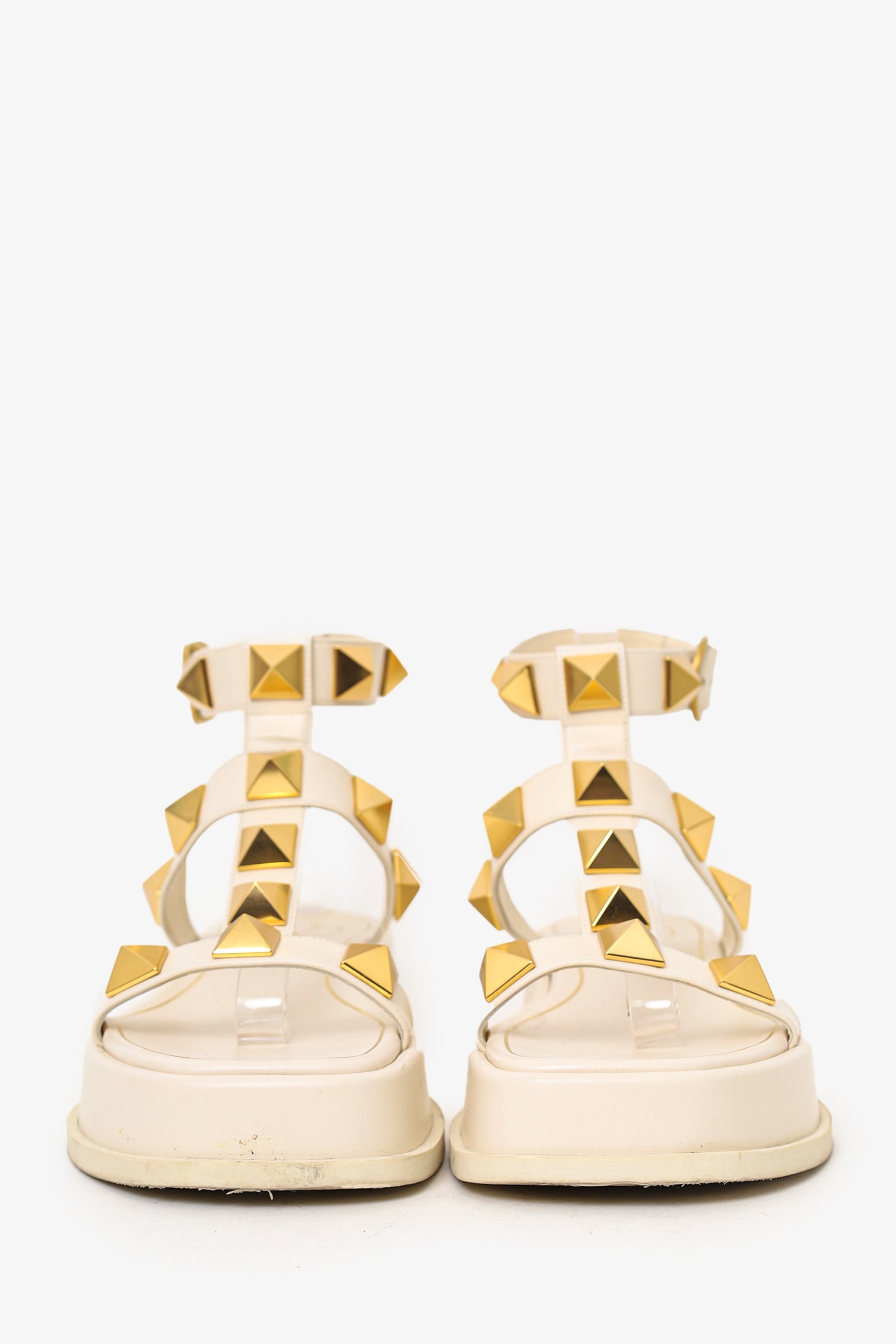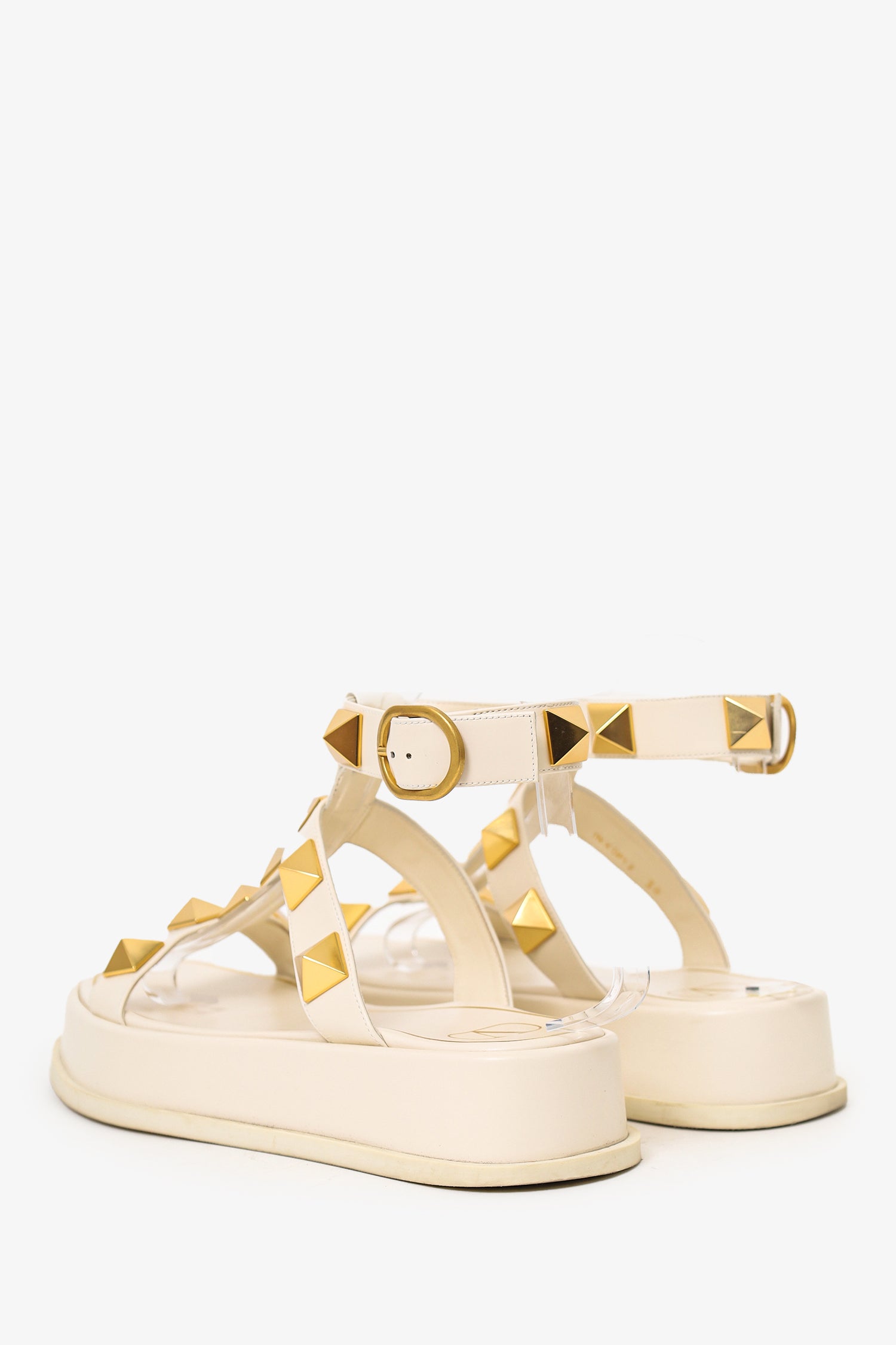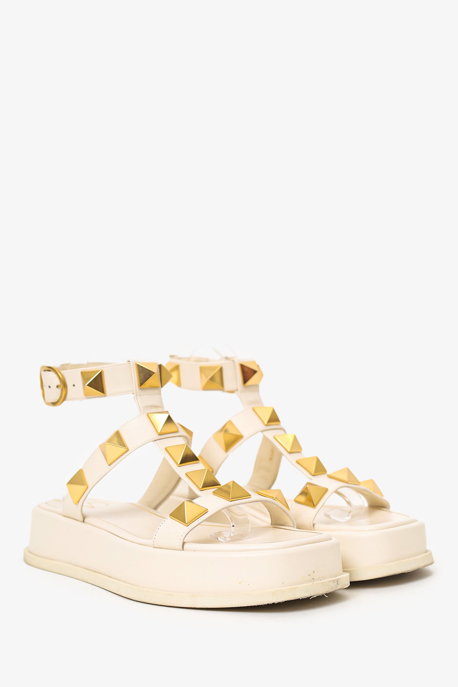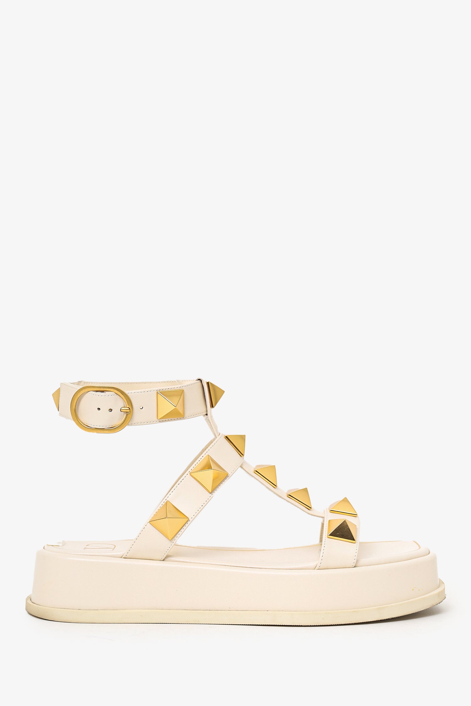 Refresh availabilityValentino White Rockstud Platform Sandals. Open square toe. Adjustable ankle strap with pull-through buckle strap. Gold-tone hardware. Tonal stitching.