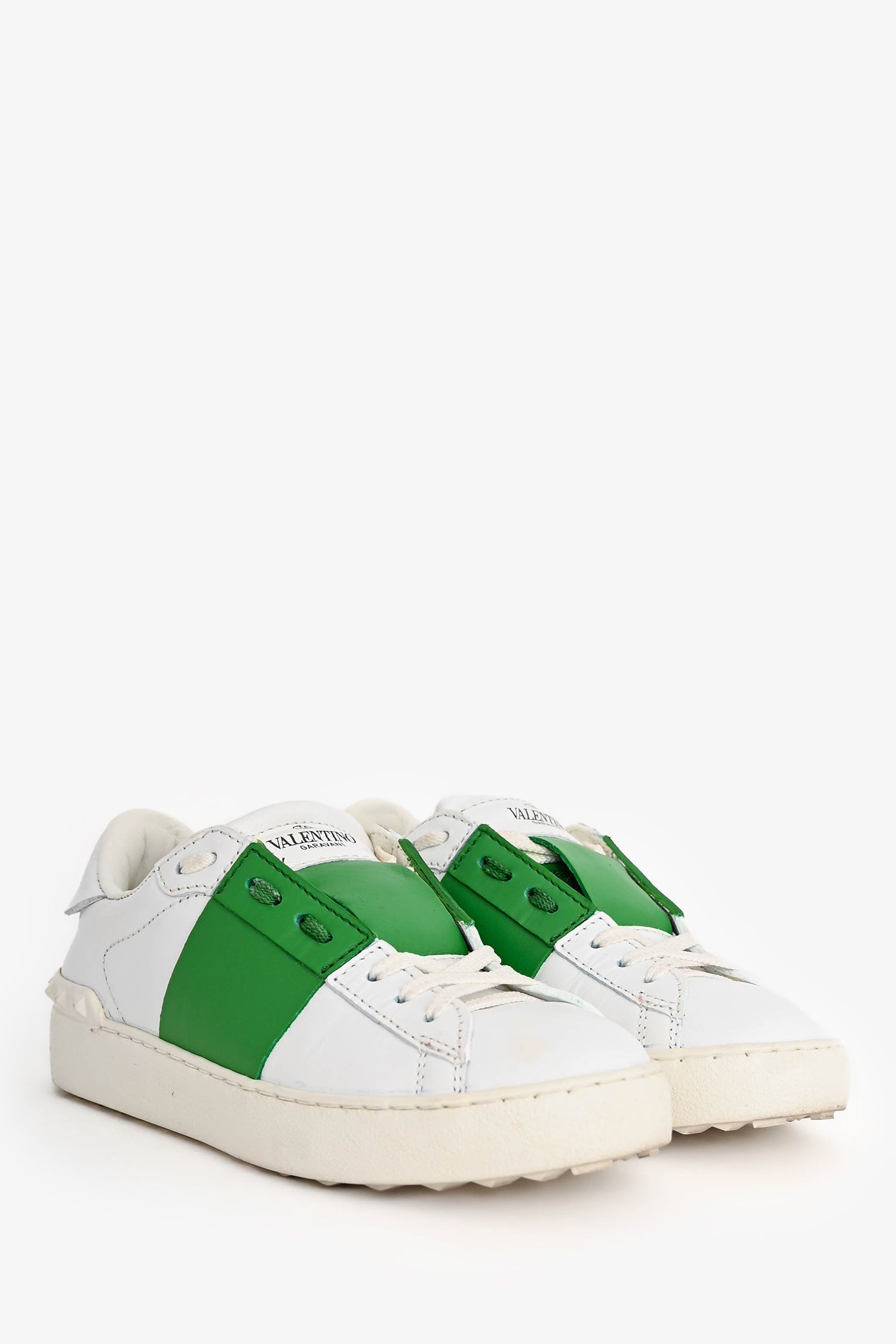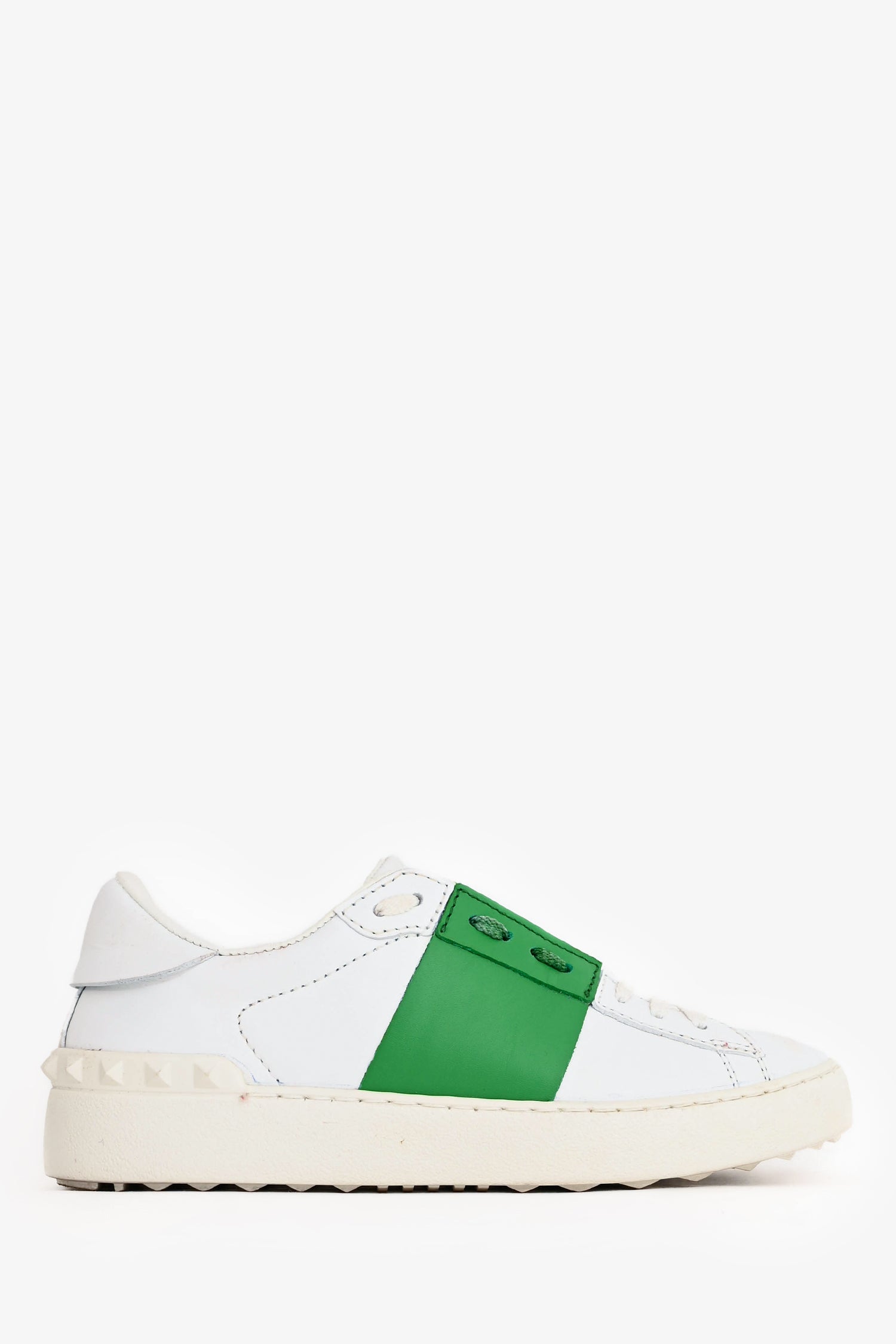 Refresh availabilityValentino White/Green Leather Rockstud Sneakers. Round toe. Slip-on. Lace-up closure. Tonal stud detailing at the rear.