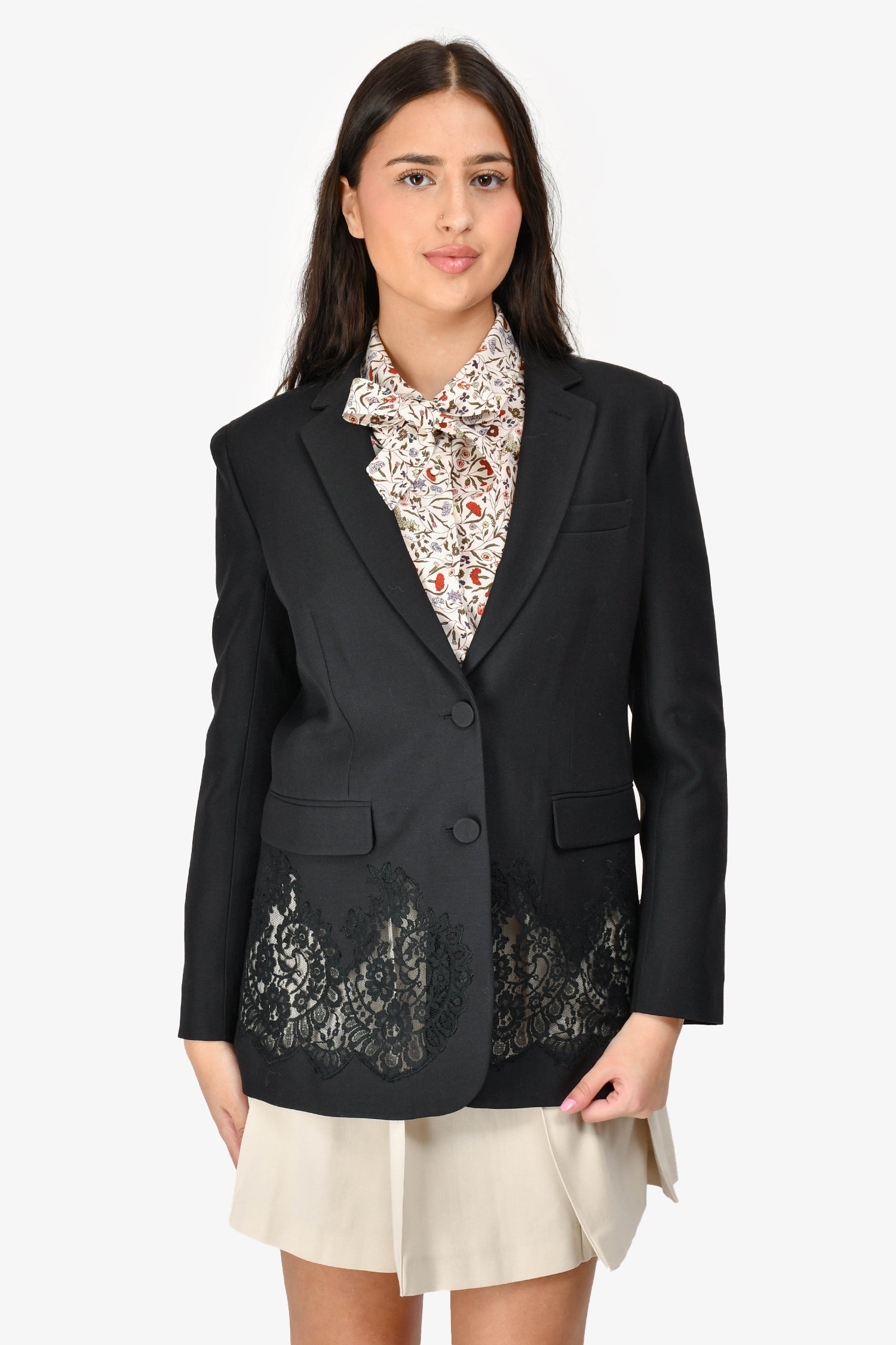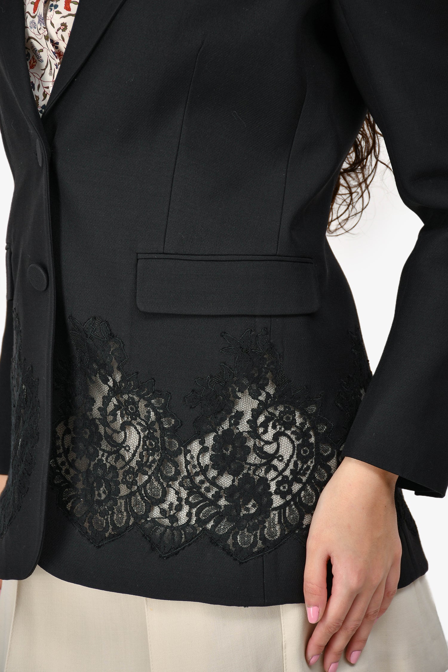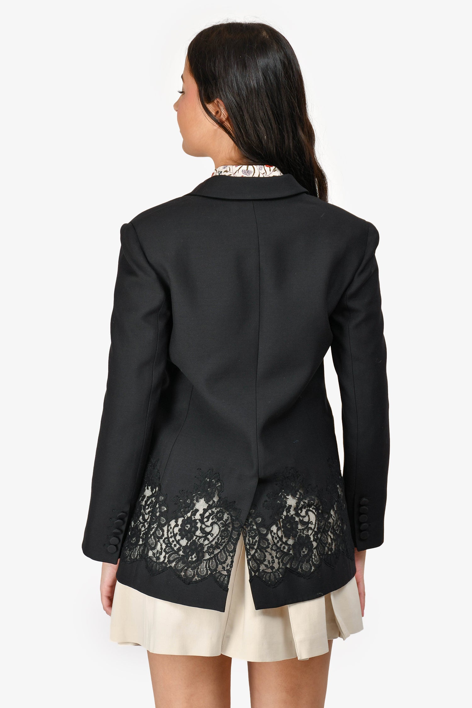 Refresh availabilityValentino Wool/Silk Black Lace Detail Blazer Jacket. Button-up front closure. Button closure and detail on the cuffs. Lined interior. Lace detail on the bottom. Single front slip pocket and two faux pockets. Tonal stitching.