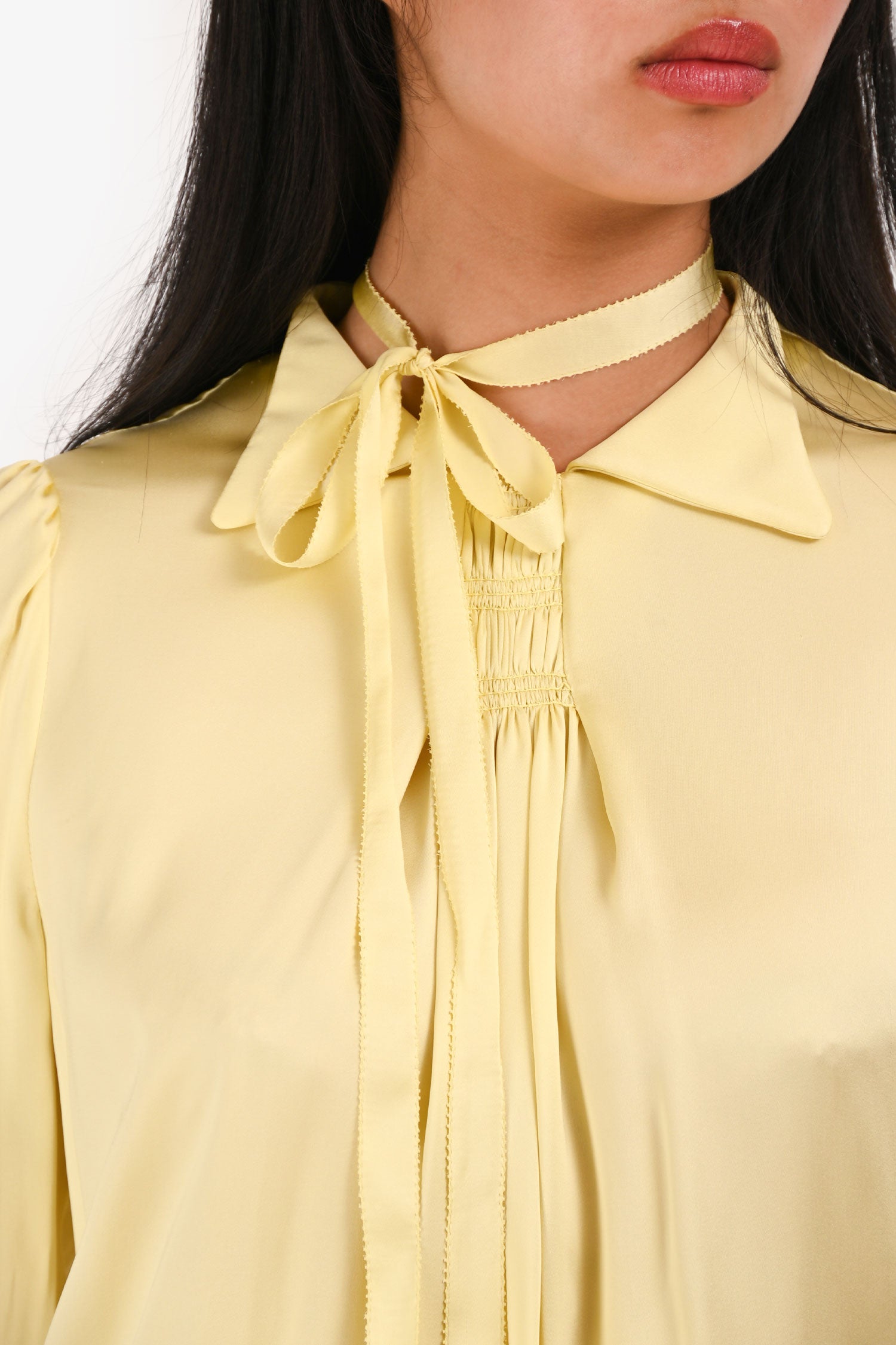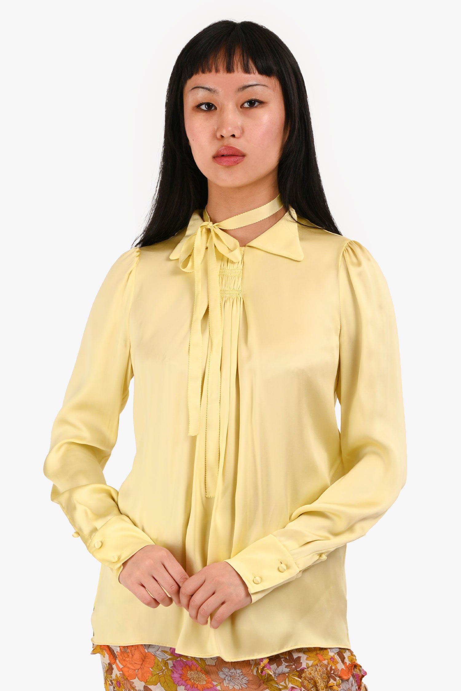 Refresh availabilityValentino Yellow Silk Long Sleeve Blouse. Rear button closure at the neck. Neck-tie detail. Button closure at cuffs. Tonal stitching.