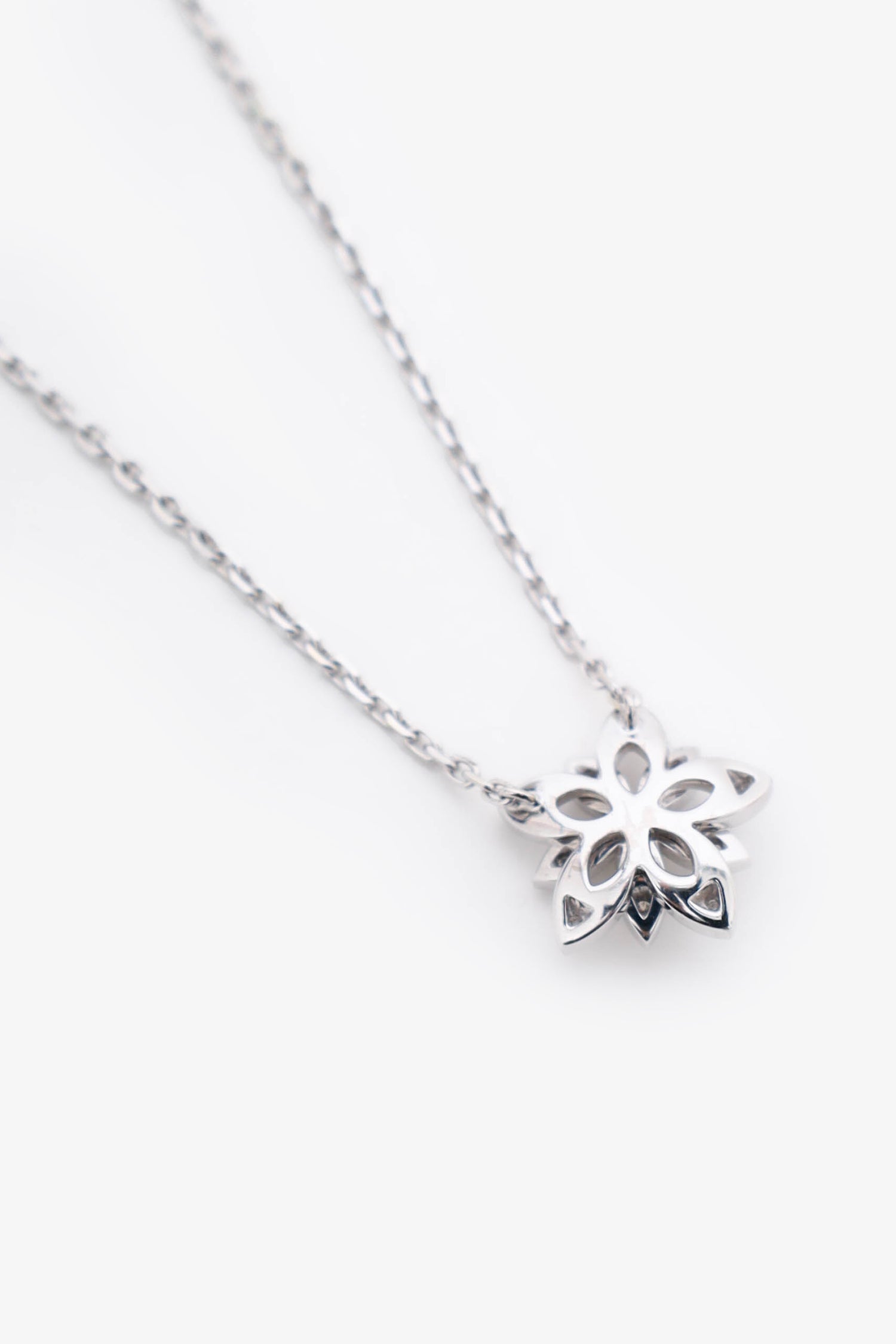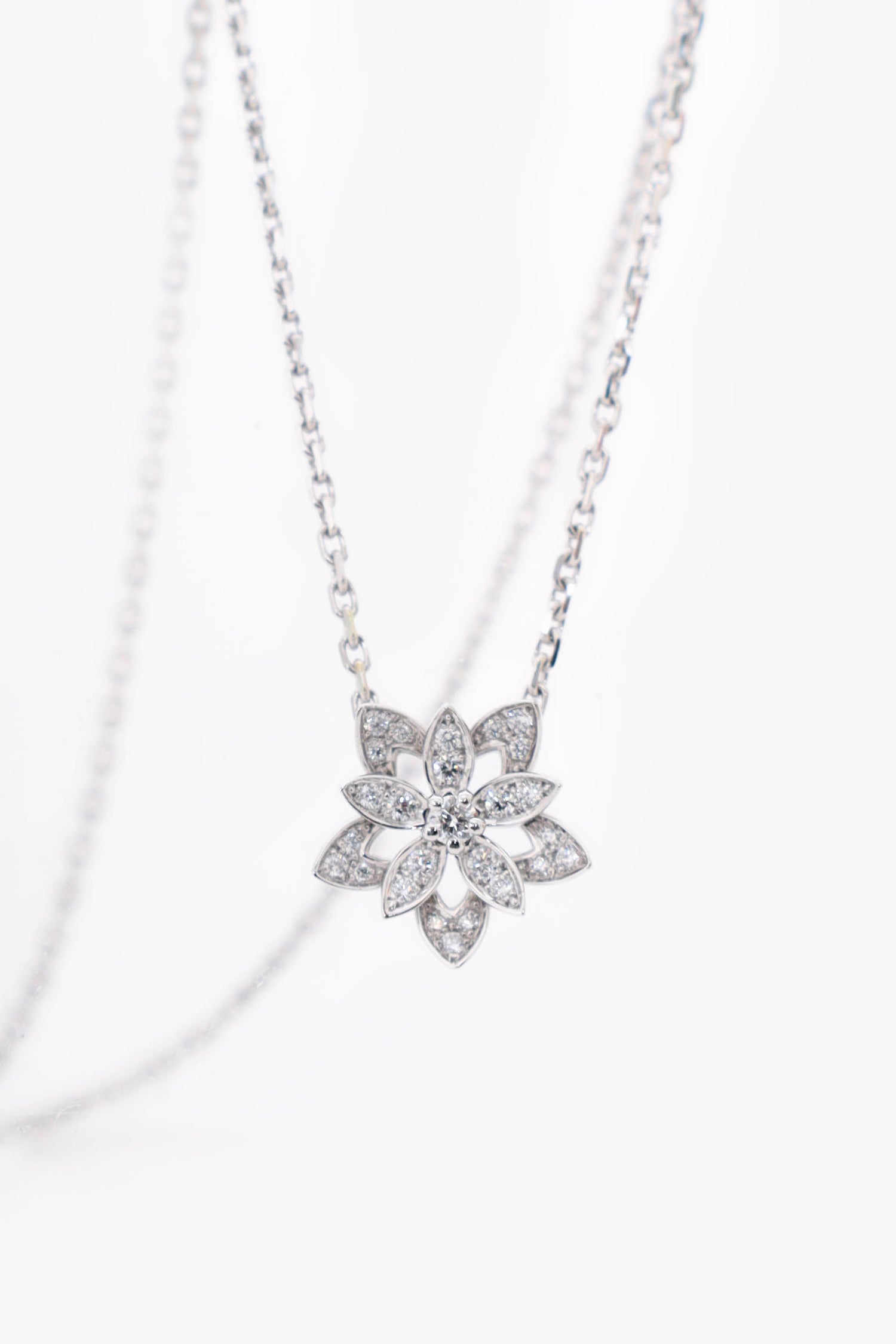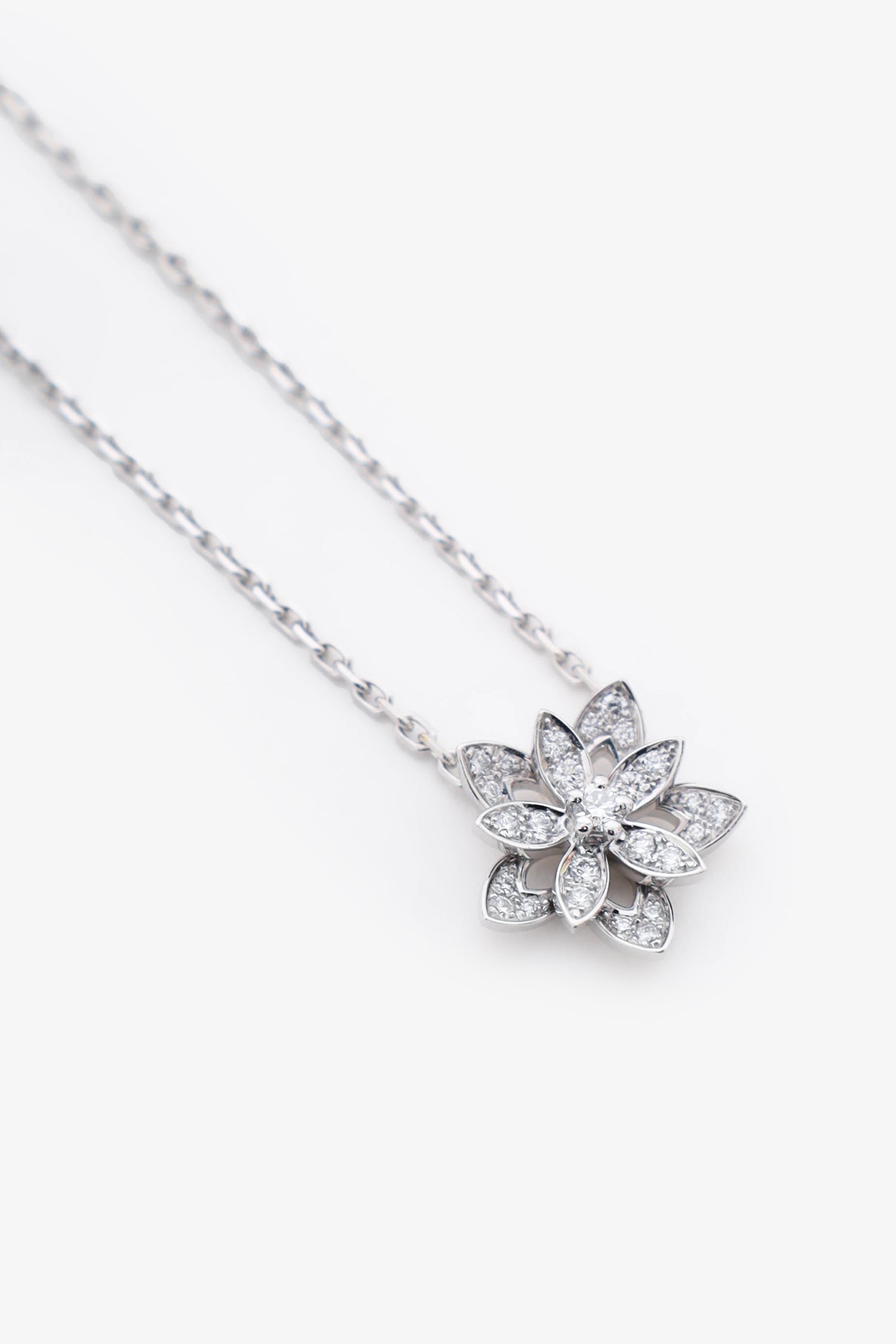 Refresh availabilityVan Cleef & Arpels 18K White Gold Diamond 'Lotus Openwork' Mini Pendant Necklace. Lobster clasp closure with 2 adjustable rings.