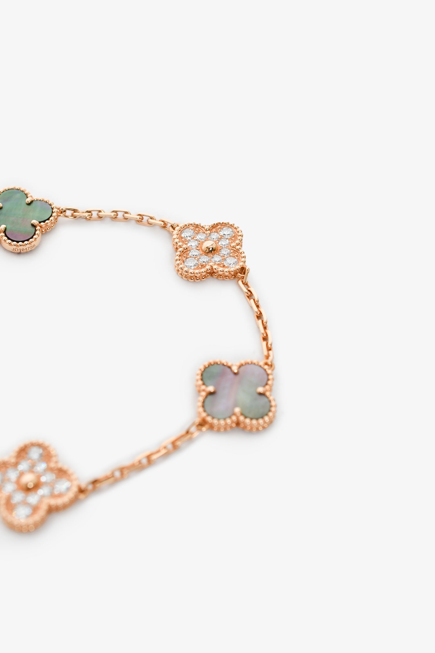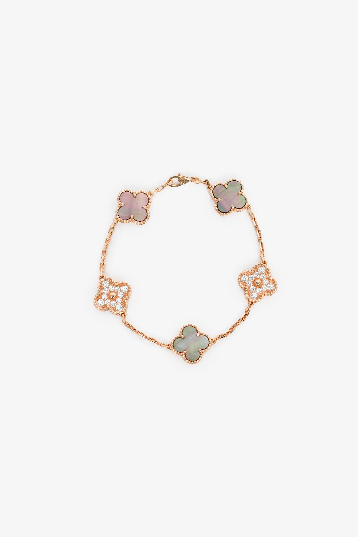 Refresh availabilityVan Cleef & Arpels 2022 18K Rose Gold/Diamond/Mother of Pearl 5 Motif Bracelet. 18K Rose Gold. 5 motifs. Mother of Pearl Stone. Pave diamonds. Lobster clasp closure.