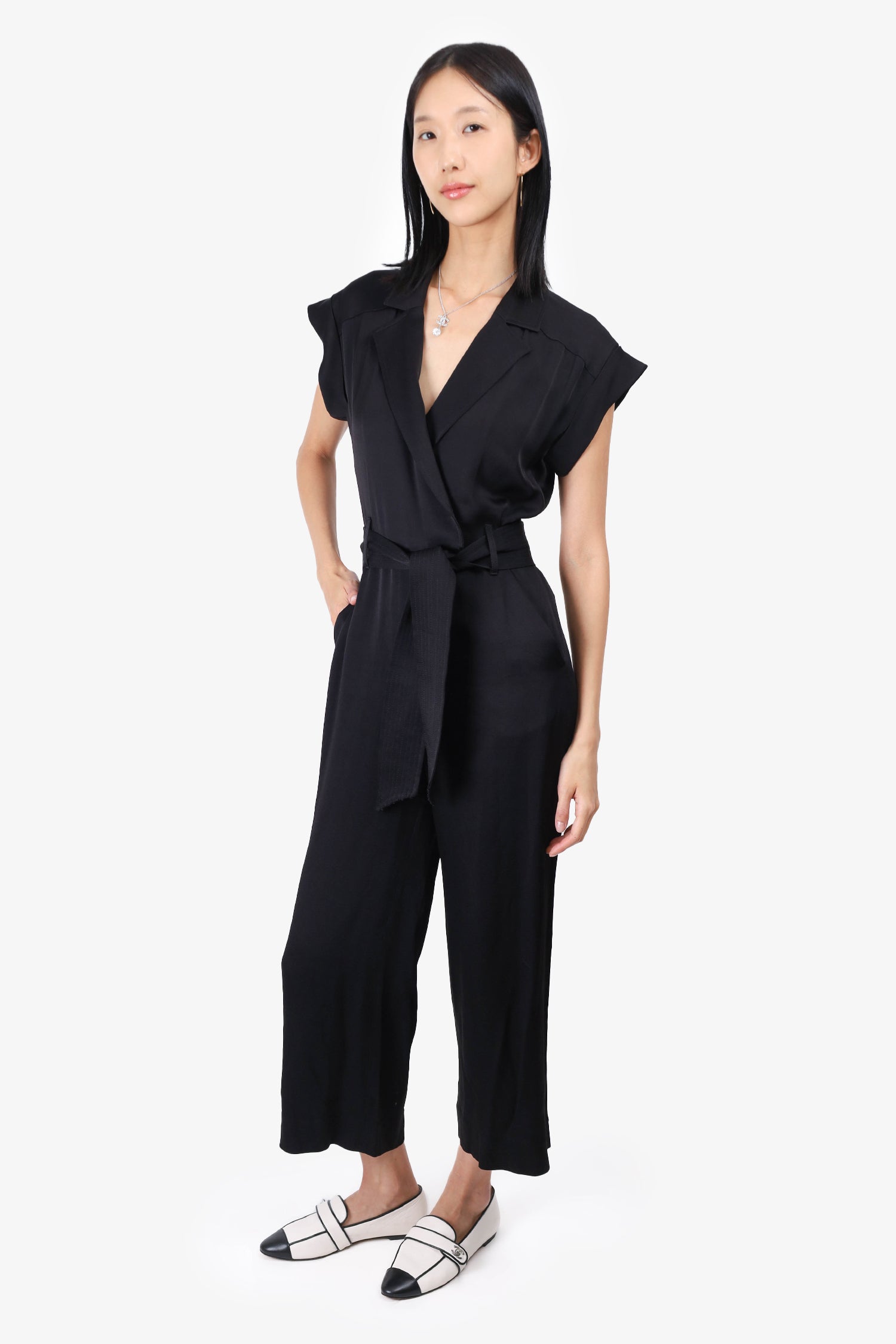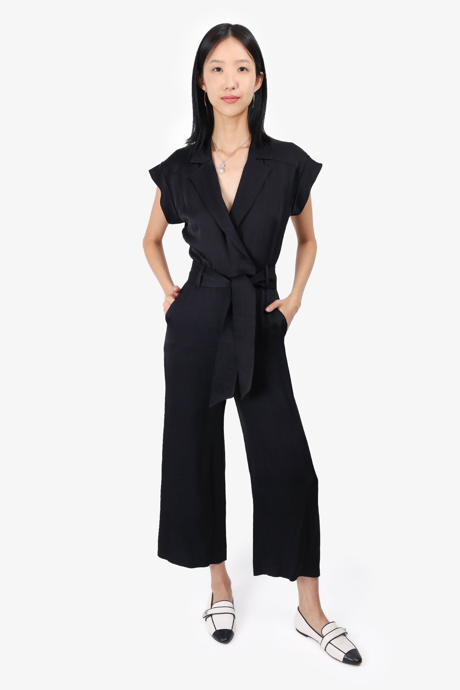 Refresh availabilityVeronica Beard Black Satin Sleeveless Belted Jumpsuit. Collared v-neckline with double hook closure. Zip closure on front. Removable tie-up band around waist. 2 slip pockets on back. Tonal stitching. Unlined.