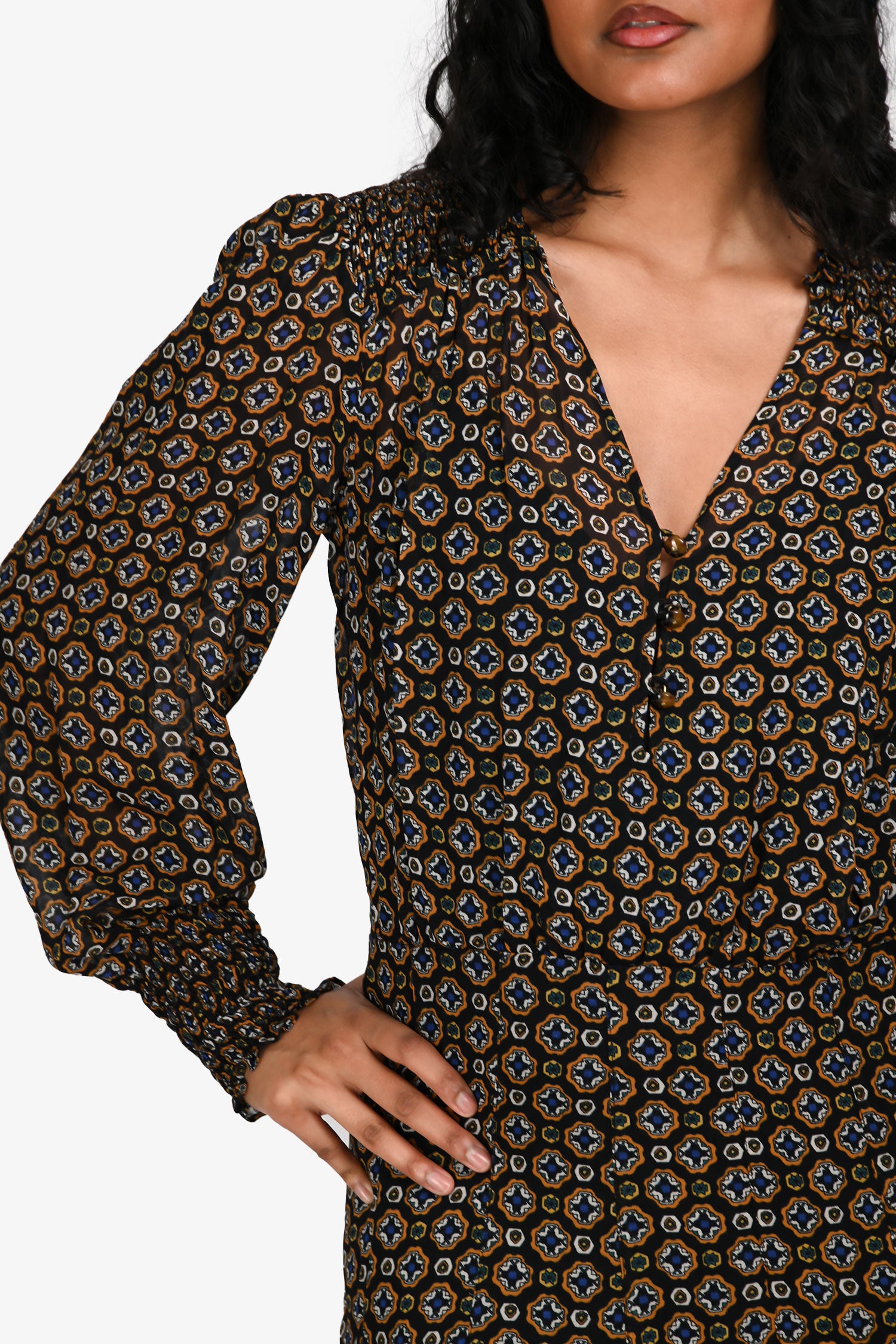 Refresh availabilityVeronica Beard Black/Multicolour Patterned Dress. V-neckline. Front button-up closure. Elasticized cuffs. Lined interior. Tonal stitching.