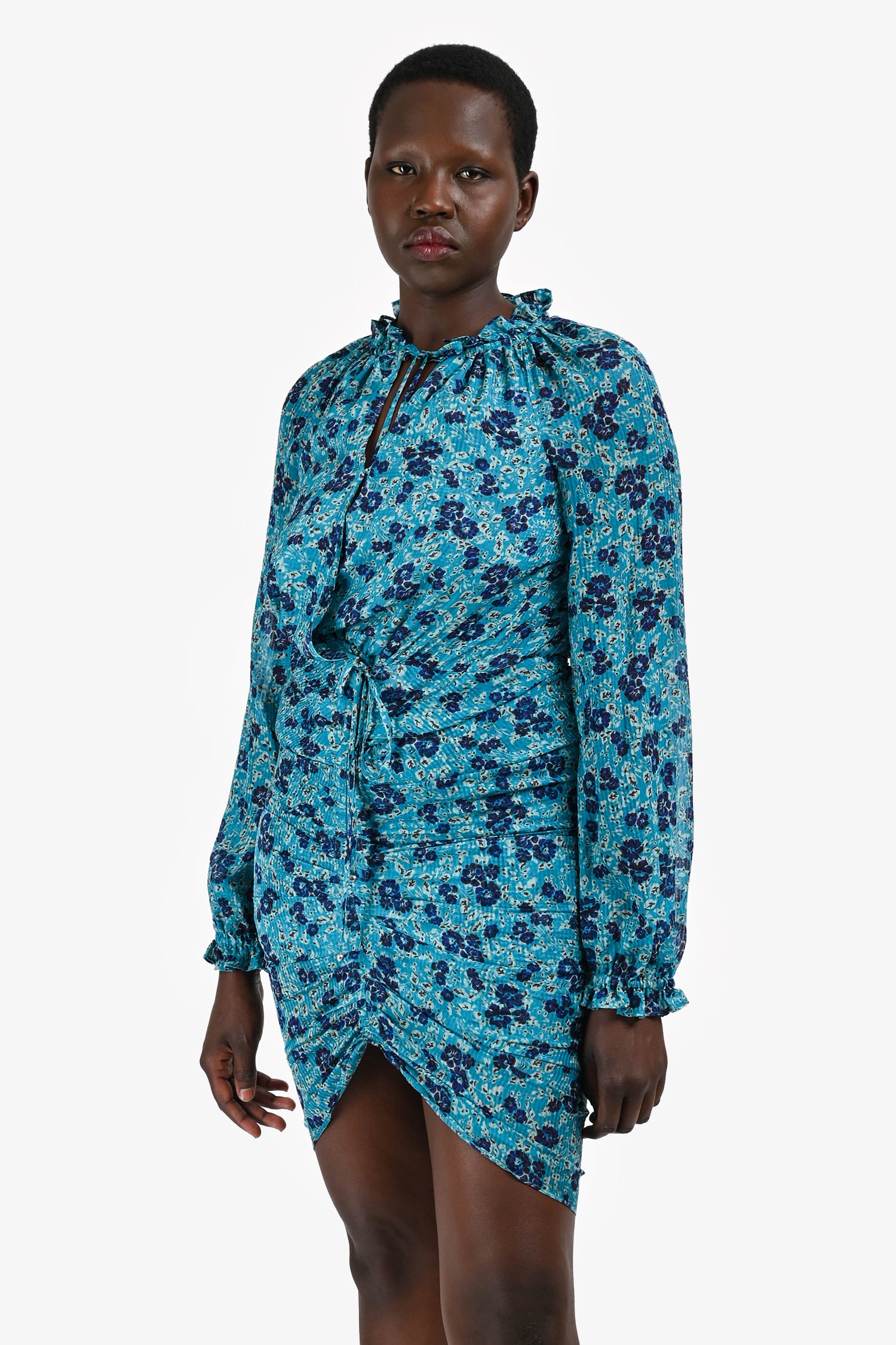Refresh availabilityVeronica Beard Blue Floral Long Sleeve Mini Dress. V-neckline. Front tie closure and hook-and-loop closure. Long sleeves with elasticized cuffs. Concealed front side zip closure. Tonal stitching.