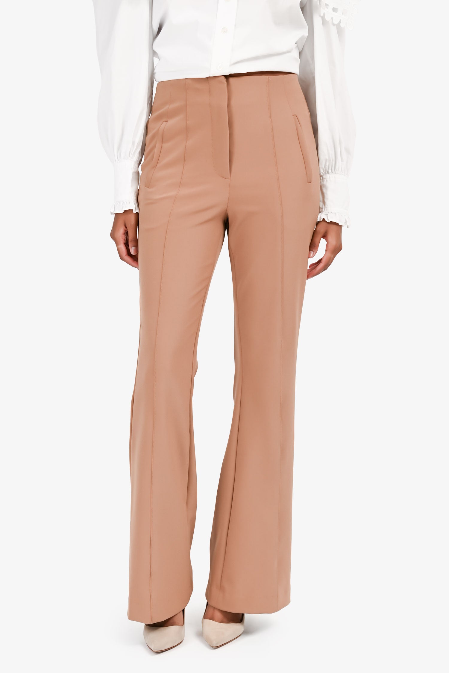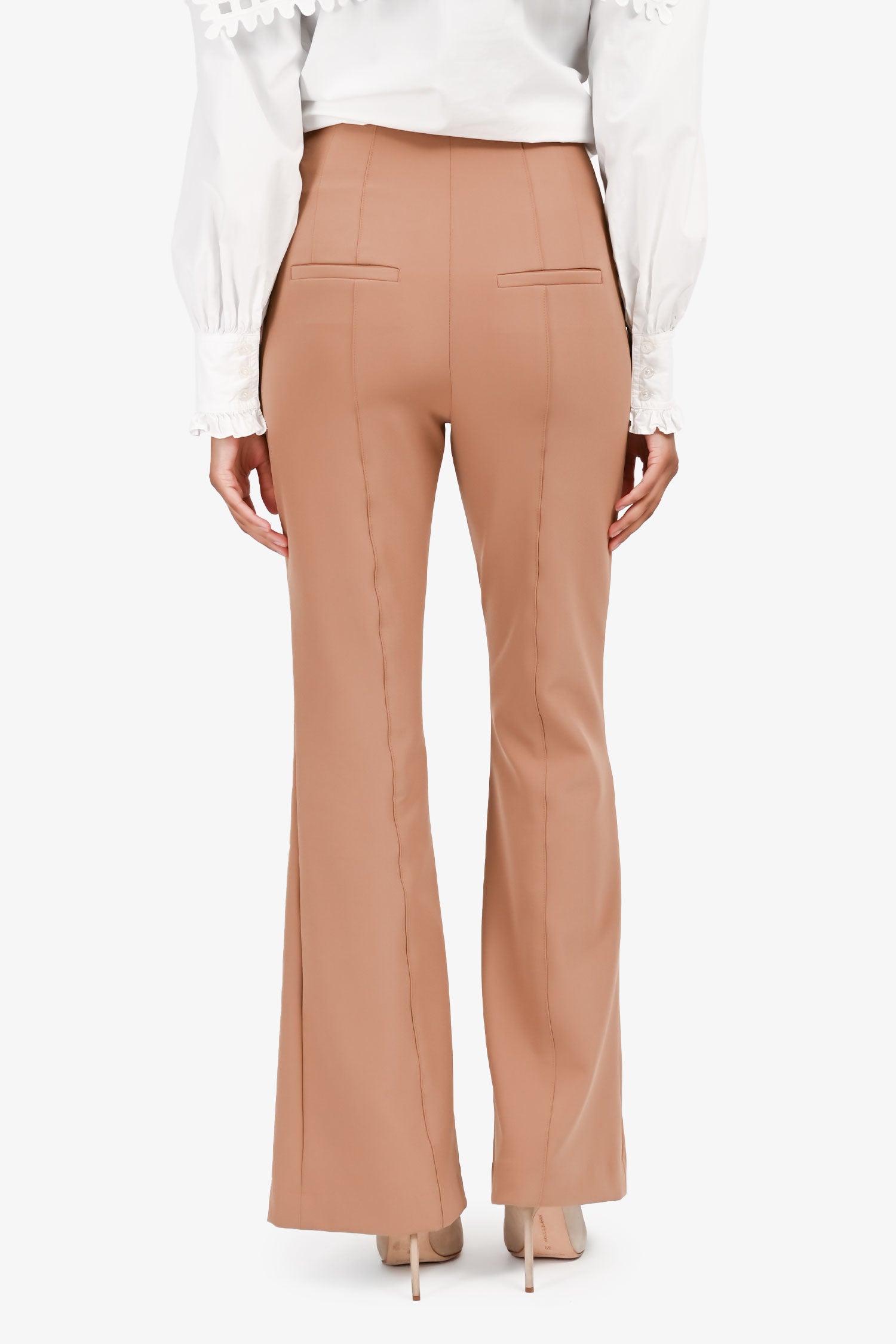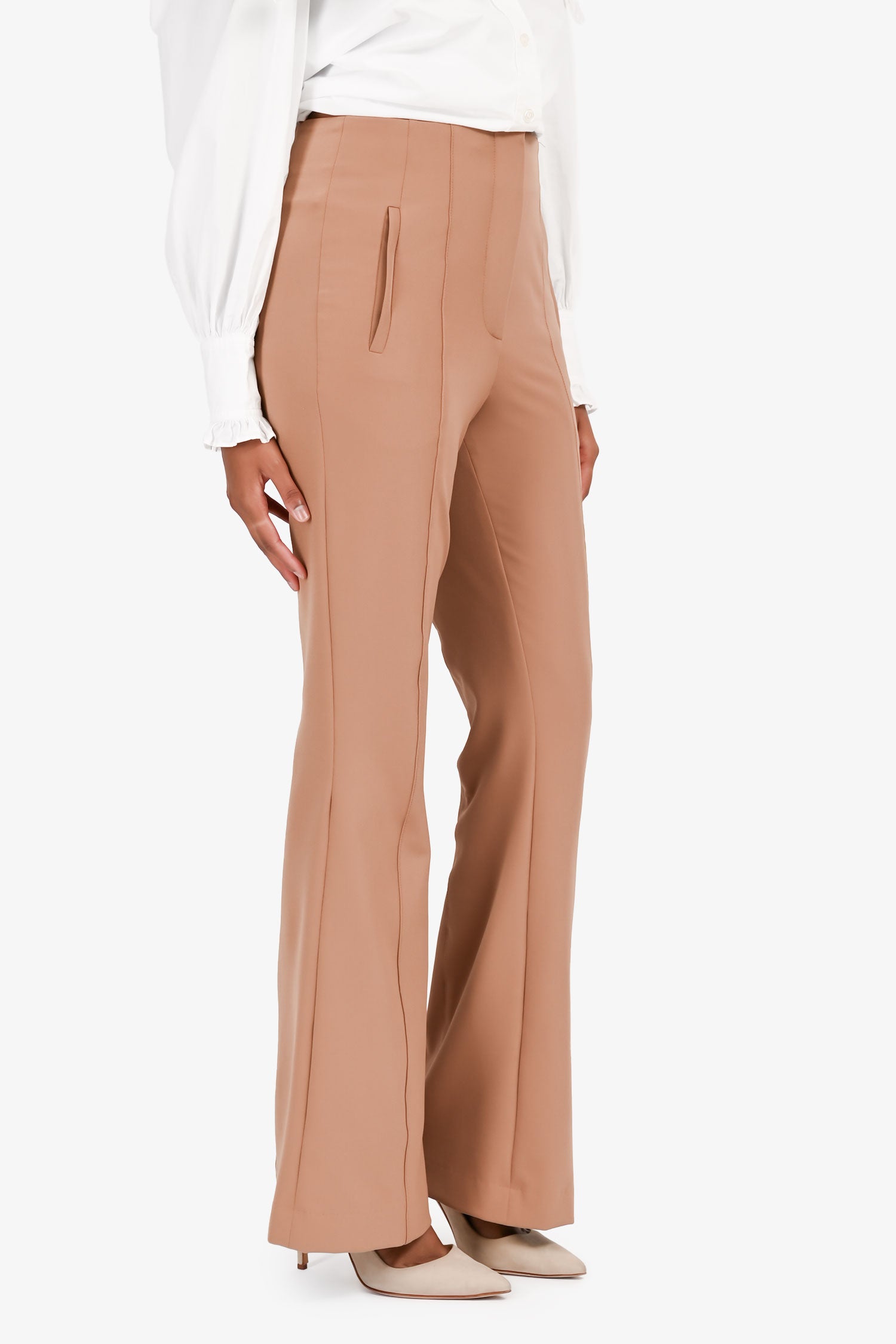 Refresh availabilityVeronica Beard Brown Flared Trousers. Front zip and top latch closures. 4 pockets; 2 hand and 2 back. Unlined. Tonal stitching.
