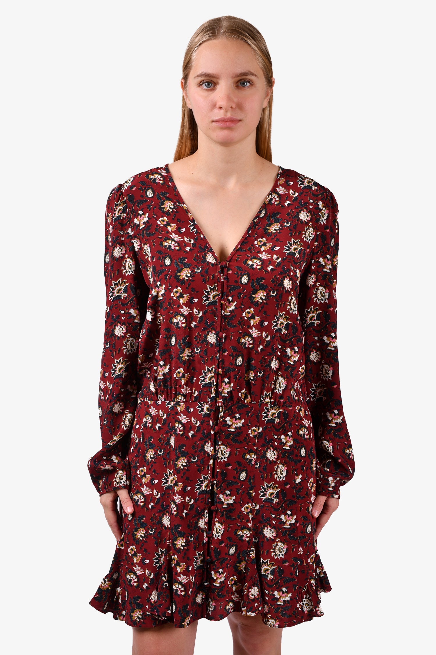 Refresh availabilityVeronica Beard Burgundy Printed Silk Buttoned Dress. Half-lined. Tonal stitching.