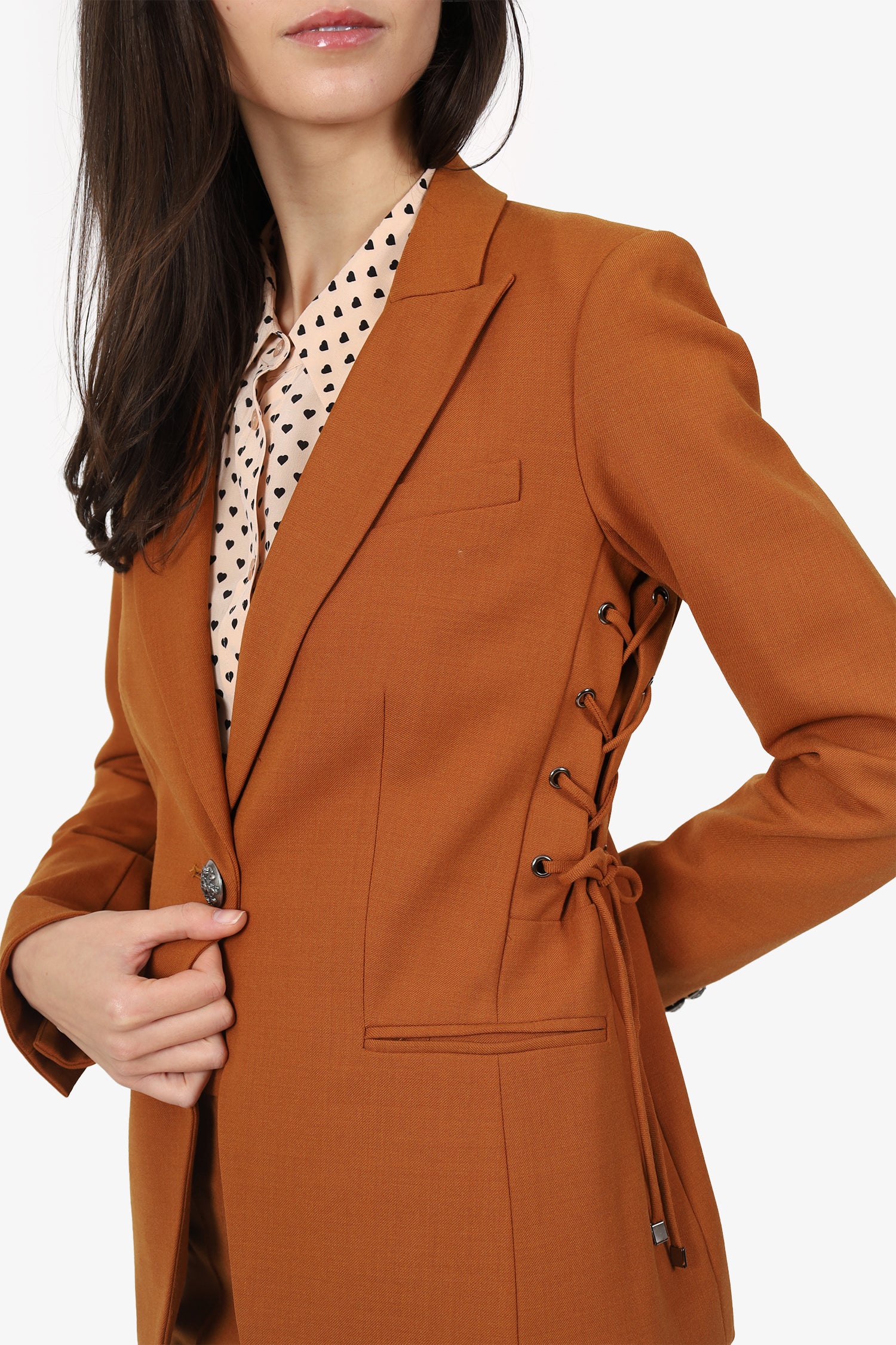 Refresh availabilityVeronica Beard Burnt Orange Wool Lace Up Detail Blazer + Pants. Blazer; Pull-on. Peak lapel. Padding to shoulders. Front button-up closure. Side tie-up closure. Sleeve cuffs with button-up closure. 2 exterior side slip pockets. Single rear vent. Lined interior. Gunmetal-tone hardware. Tonal stitching. Pants; Slip-on. Front zip with button and hook-up closure. Waistband belt-loops. 2 exterior rear slip pockets. Ankle tie-up closure. Gunmetal-tone hardware. Tonal stitching.