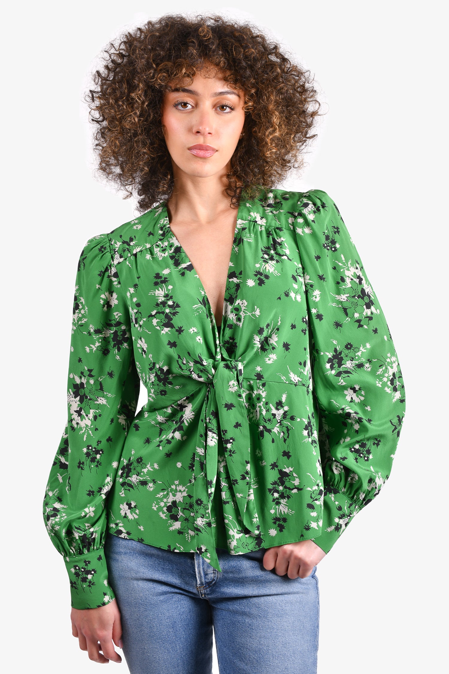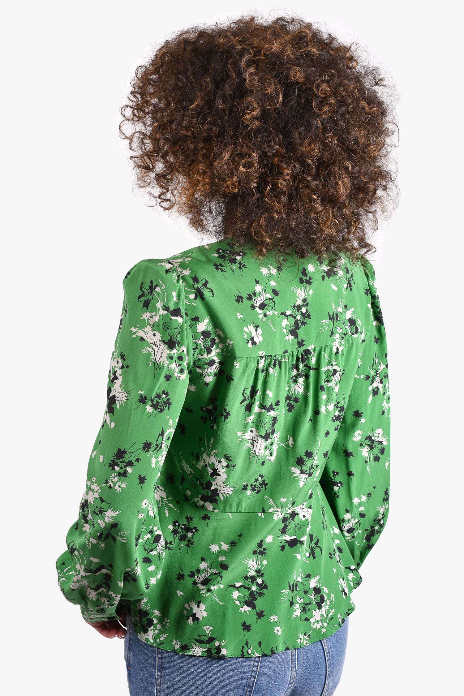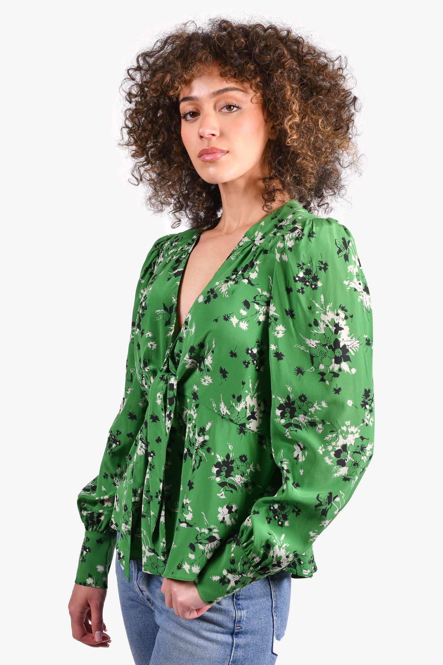 Refresh availabilityVeronica Beard Green/White Floral Blouse. V-neck with hook closure. Button closure on the cuffs. Tonal stitching.