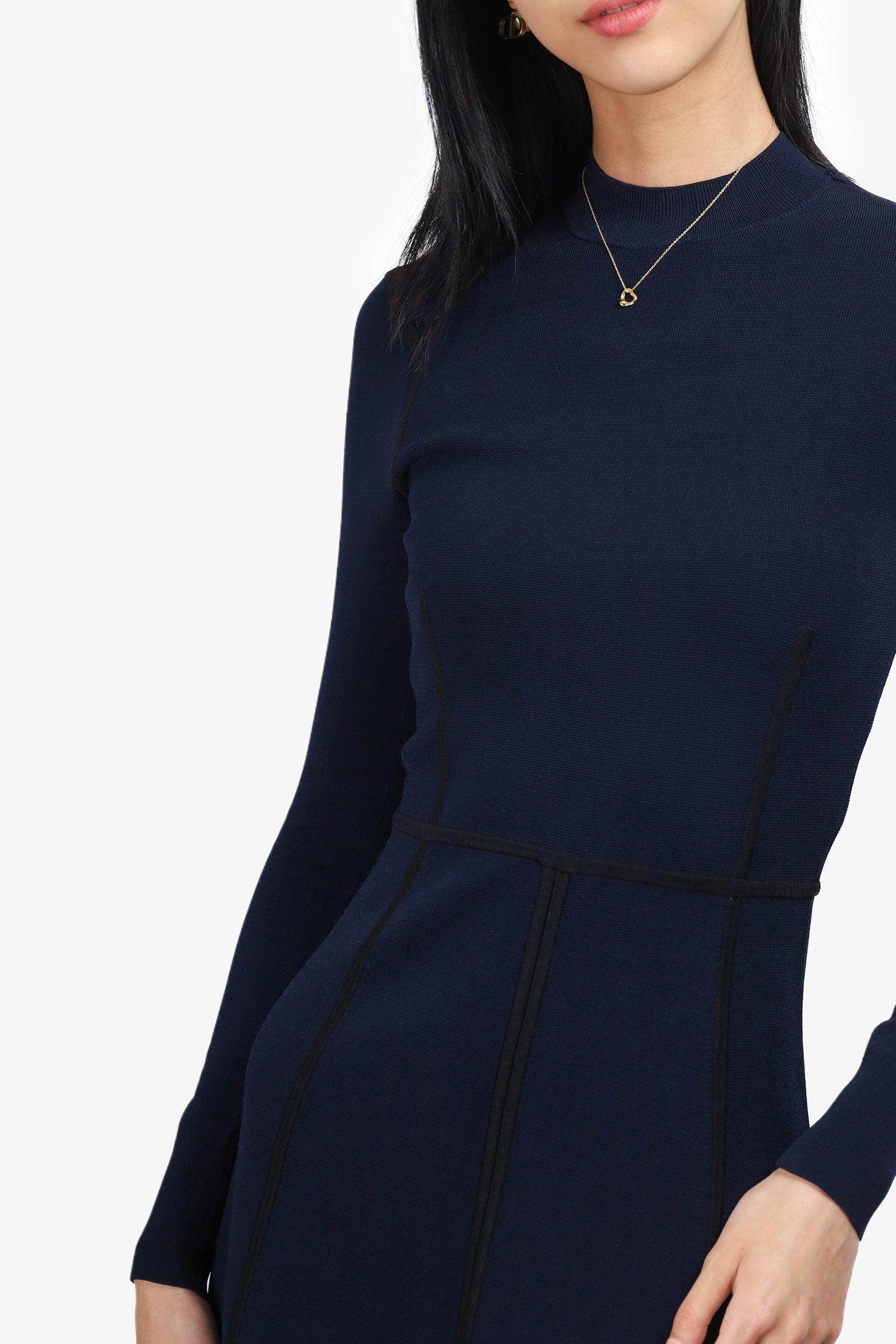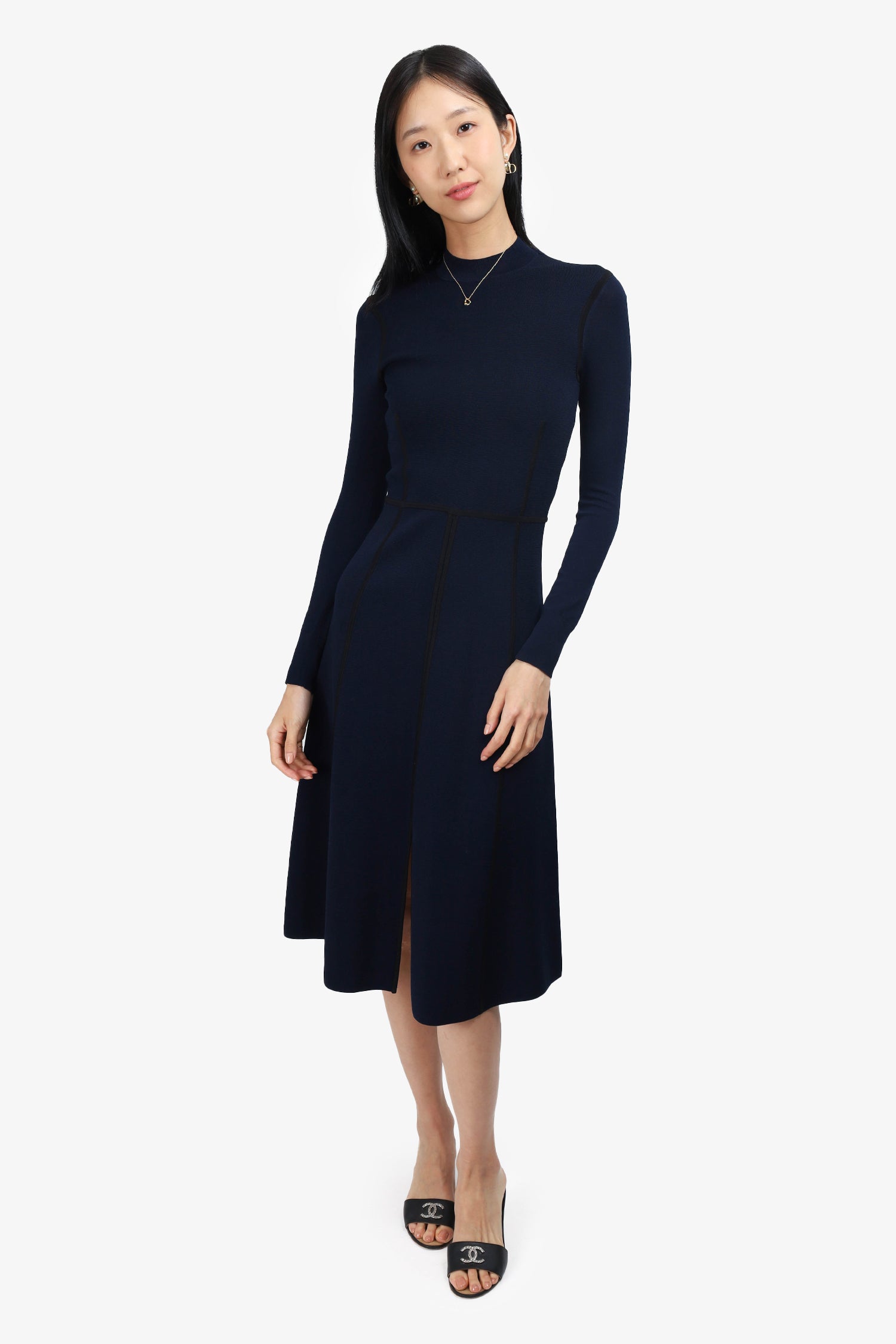 Refresh availabilityVeronica Beard Navy/Black Long Sleeve Mock Neck Midi Dress. Pull-on. Ribbed trimmings. Rear zip closure. Black contrast stitch detailing. Front centre slit. Unlined. Contrast stitching.