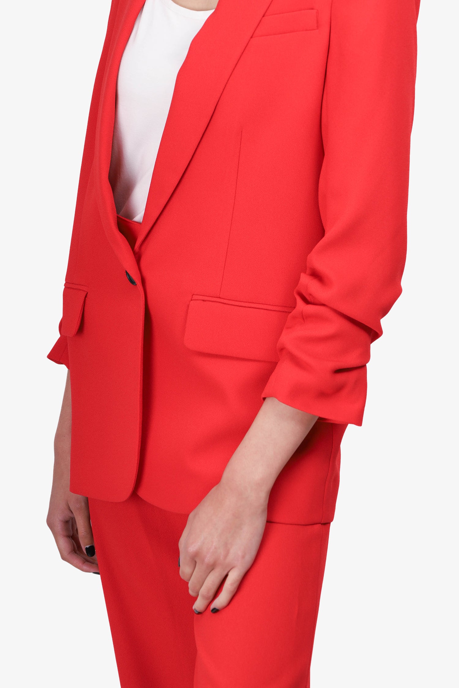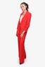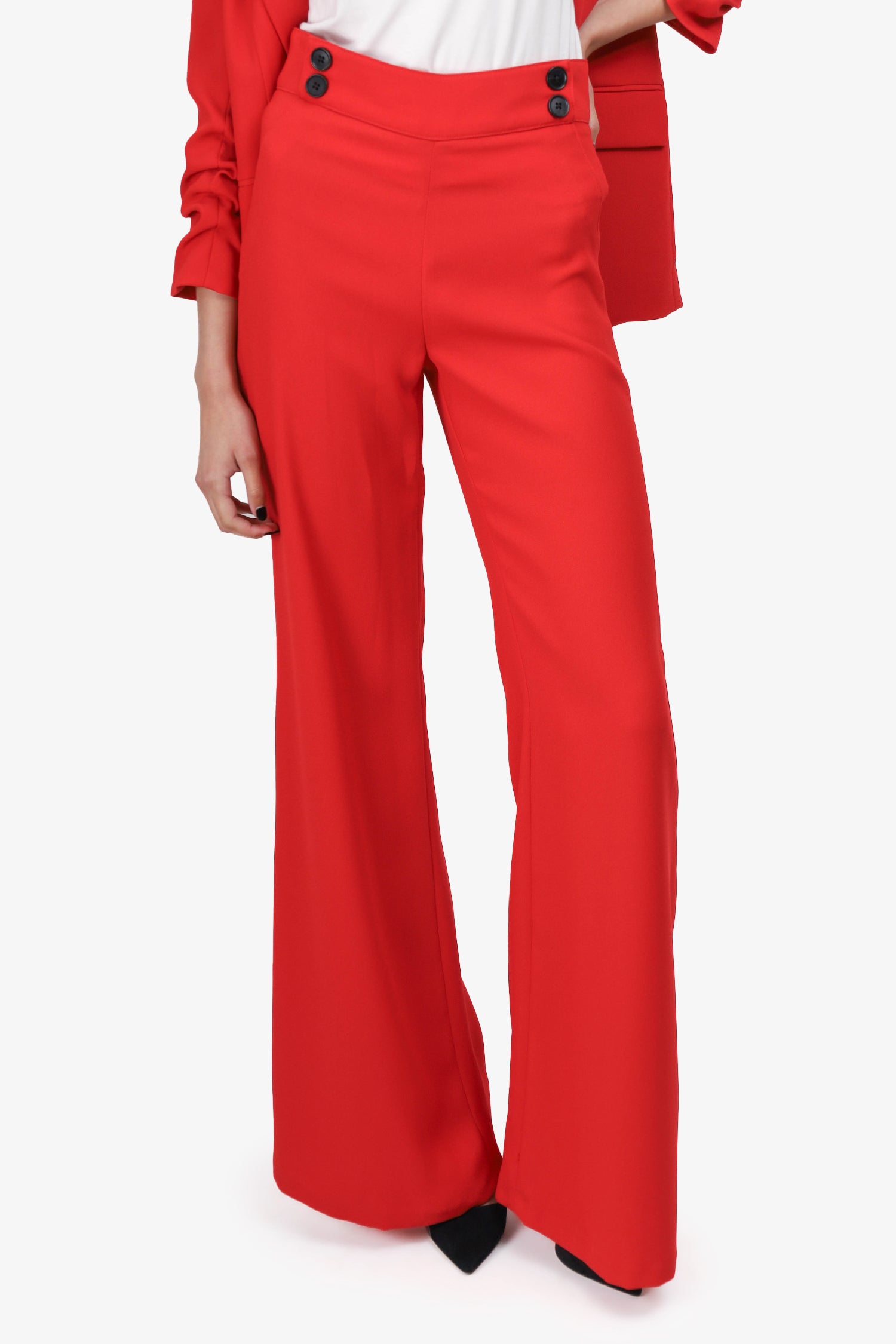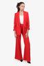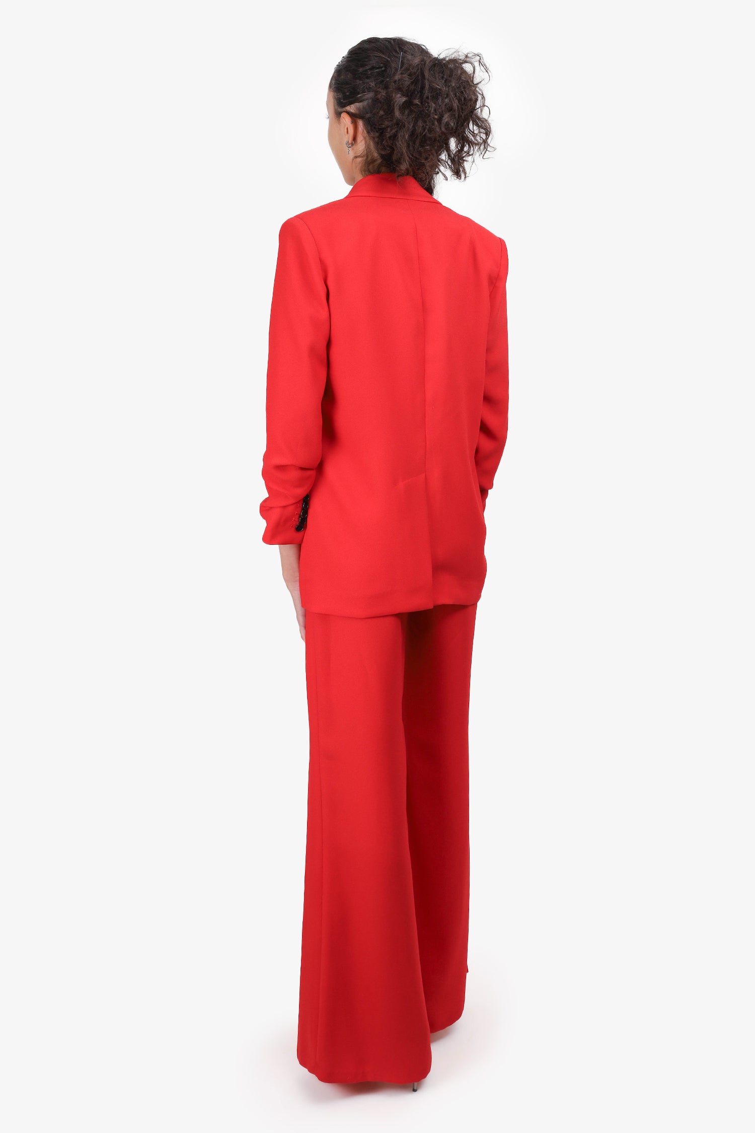 Refresh availabilityVeronica Beard Orange/Red Blazer & Pant Set. Blazer; Collared v-neckline. Single front button-up closure. 3 front pockets, 2 with fold-over flap. Button-up closure on sleeve hems. Intentional back slit on bottom hem. Pants; Rear zip and hook closure. Button-up details on front waistline. 2 rear slip pockets. Both pieces are unlined with tonal stitching.