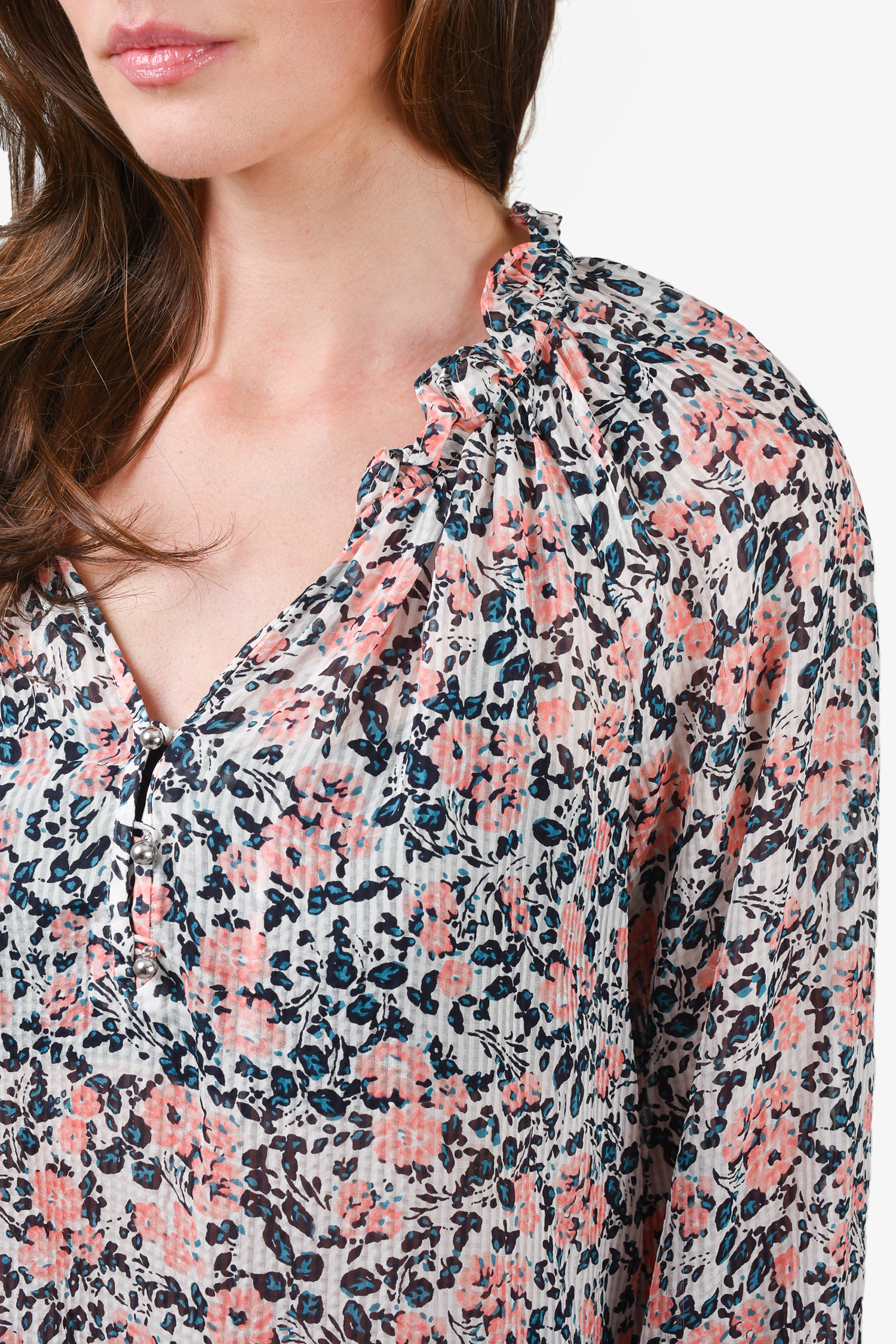 Refresh availabilityVeronica Beard Pink/Blue Floral Printed Silk Blouse. Front button-up closure. Tonal stitching.