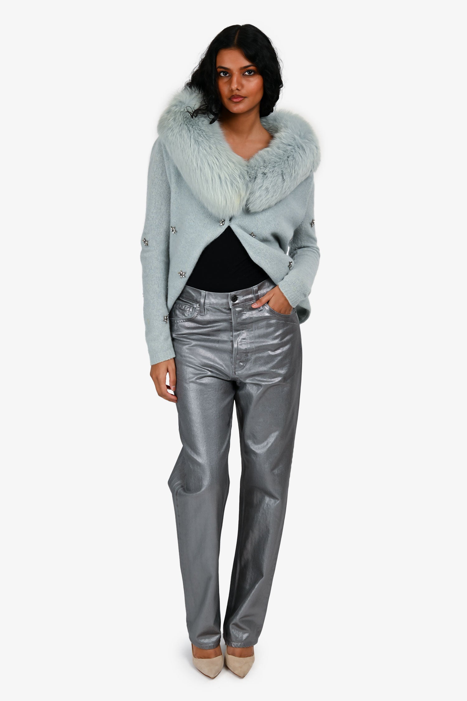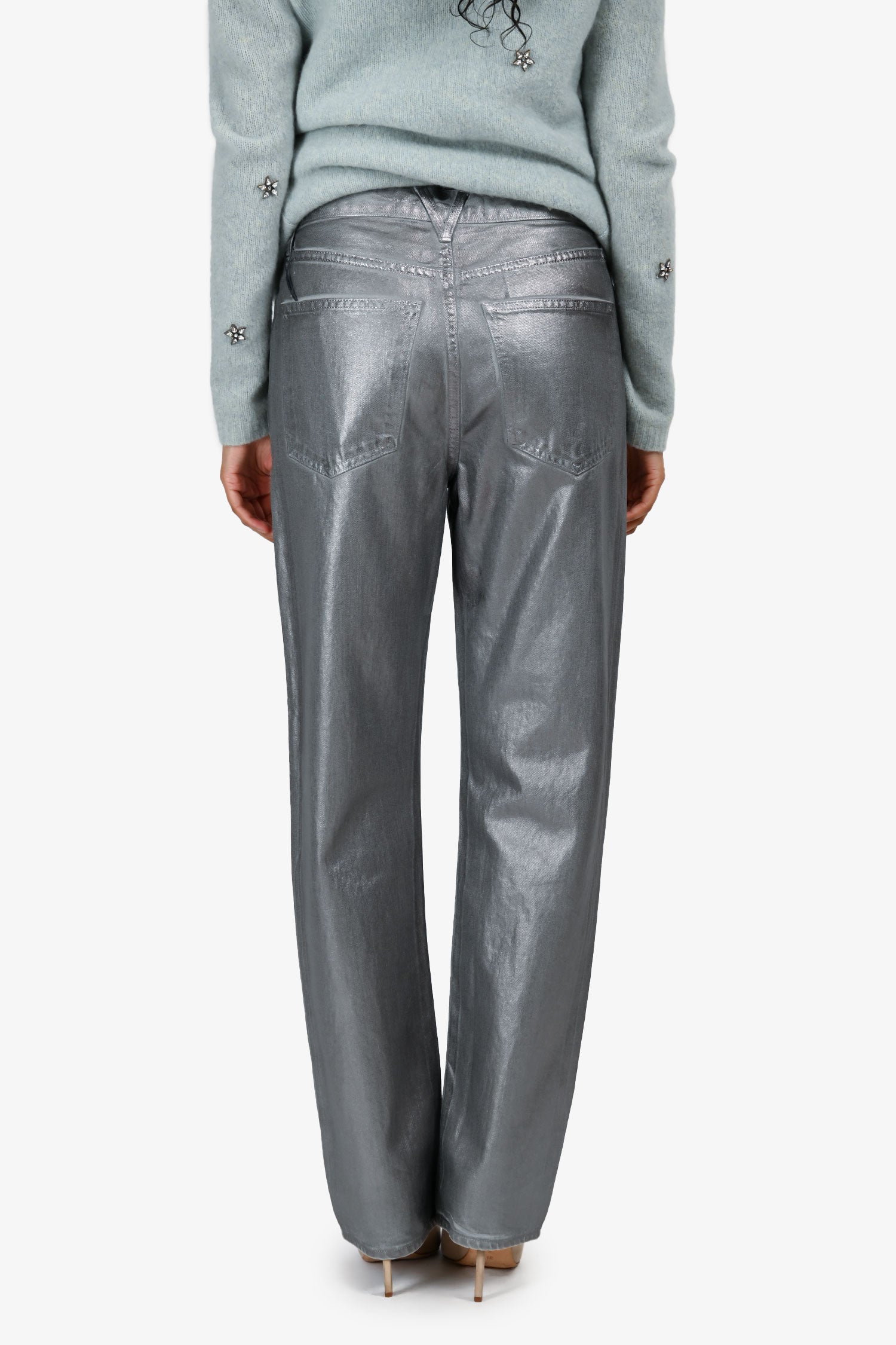 Refresh availabilityVeronica Beard Silver Coated 'Daniela' Jeans. Slip-on. Front button-up closure. Belt loops at the waist. Classic 5-pocket style. Silver-tone hardware. Tonal stitching.