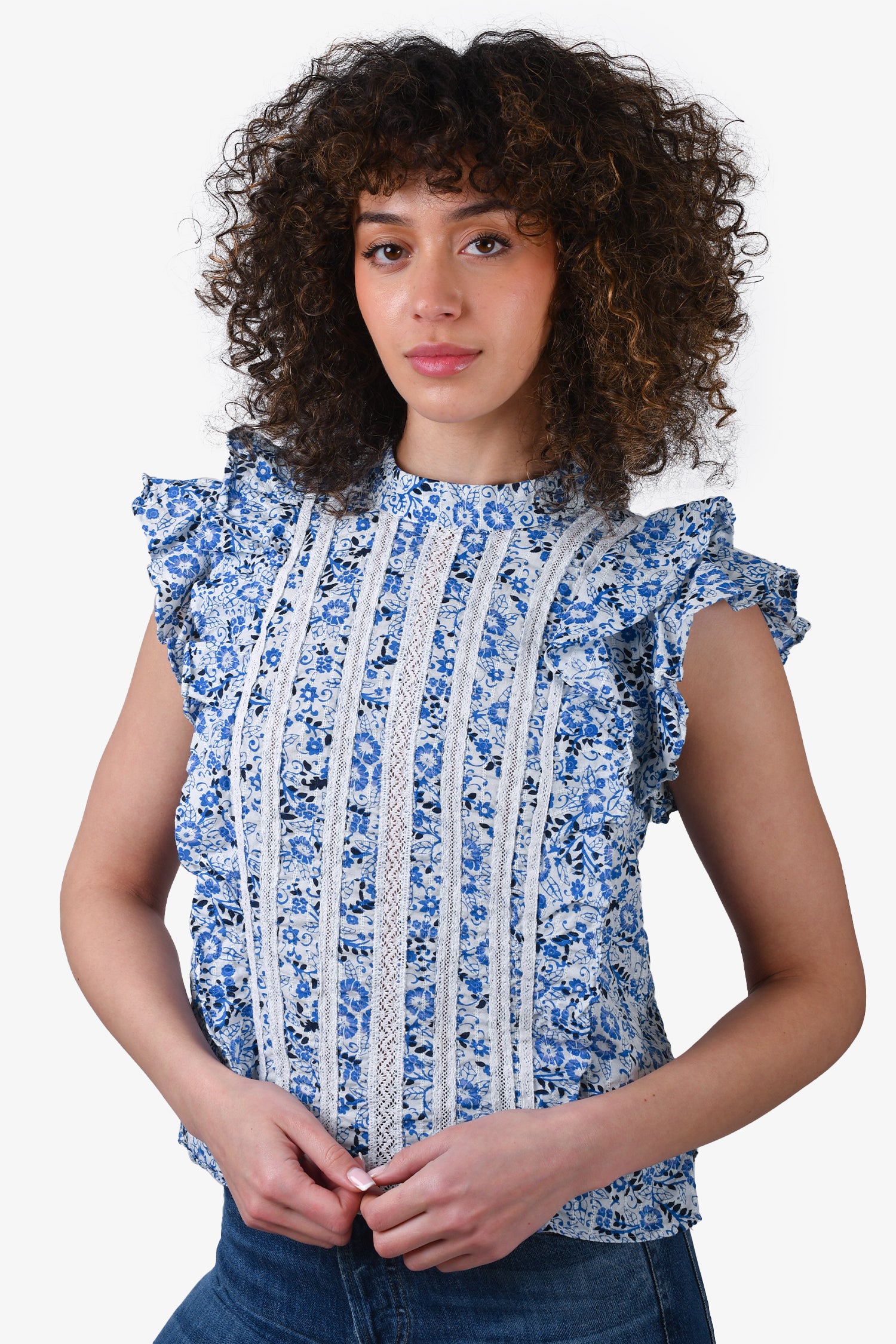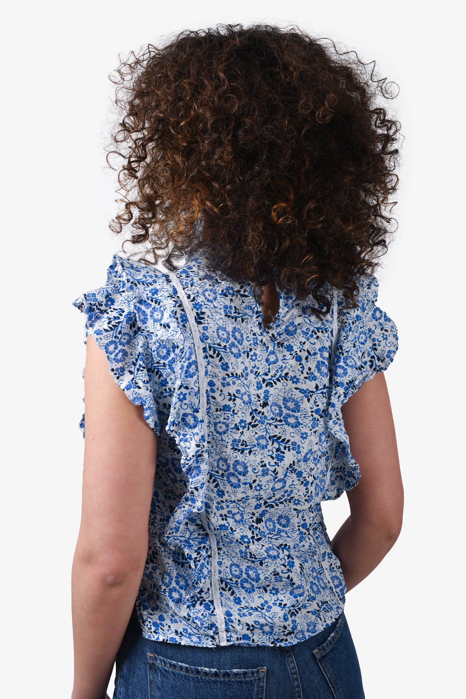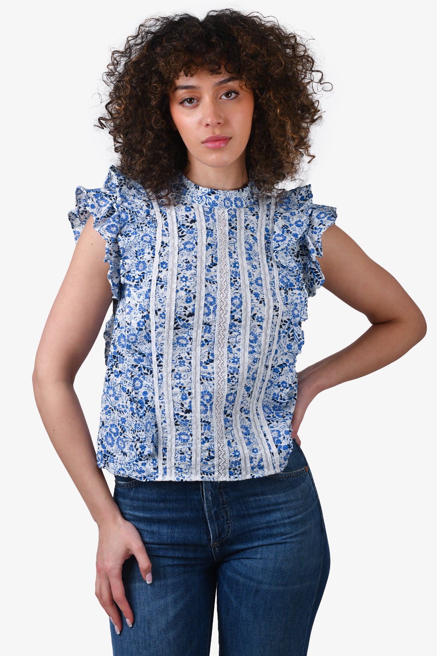 Refresh availabilityVeronica Beard White/Blue Floral Printed Ruffle Top. Unlined. Button closure on backside. Tonal stitching.