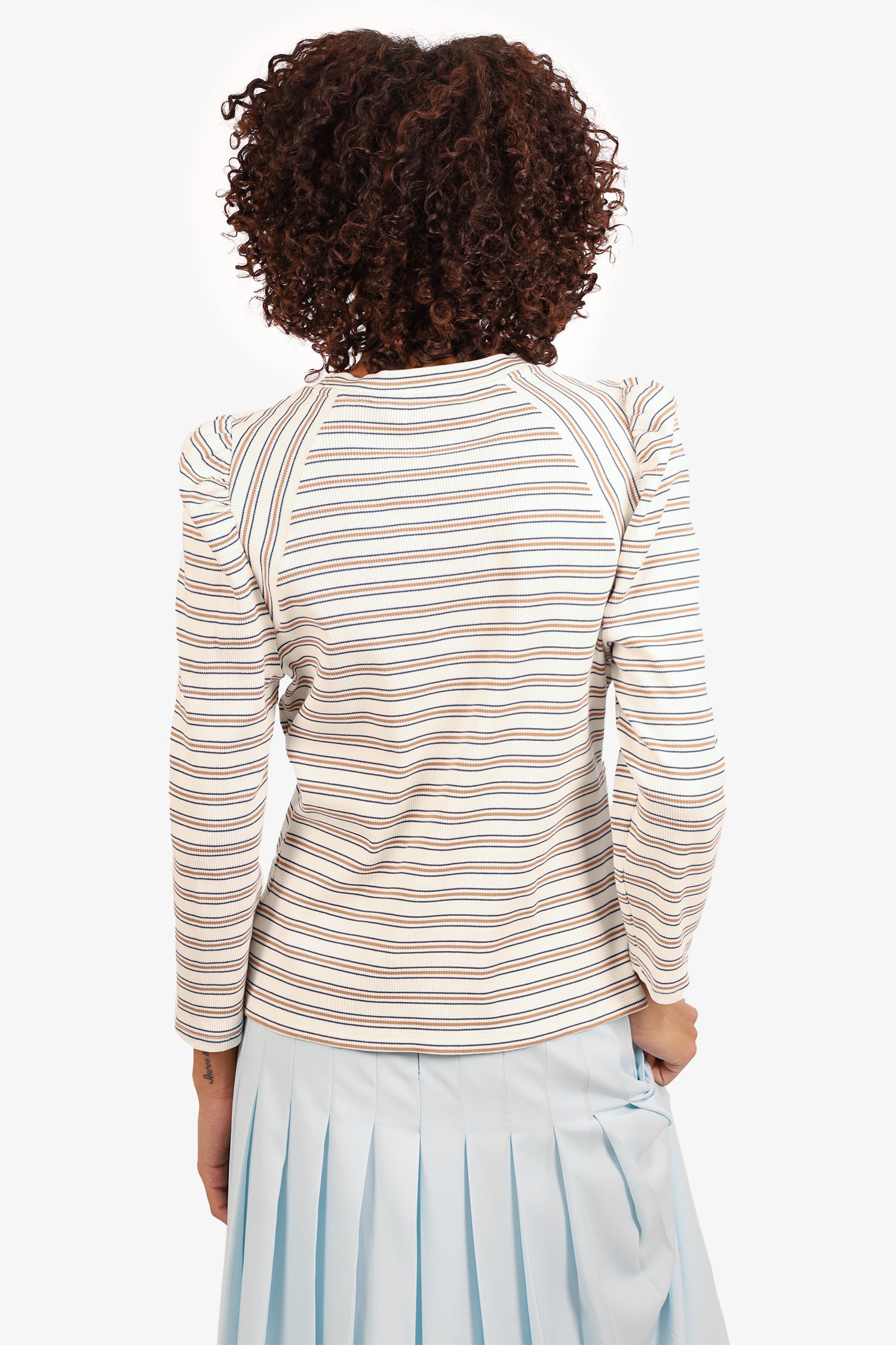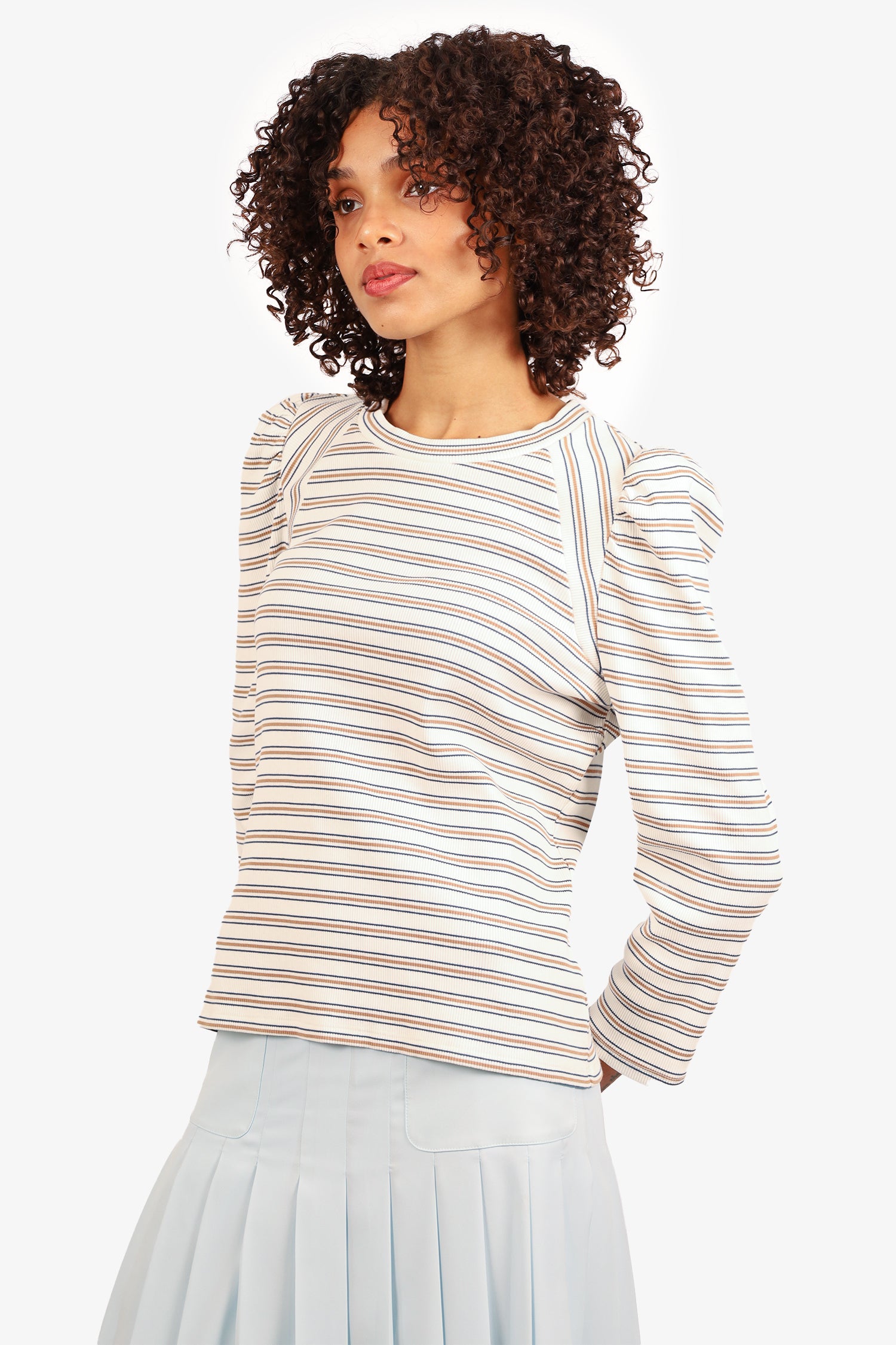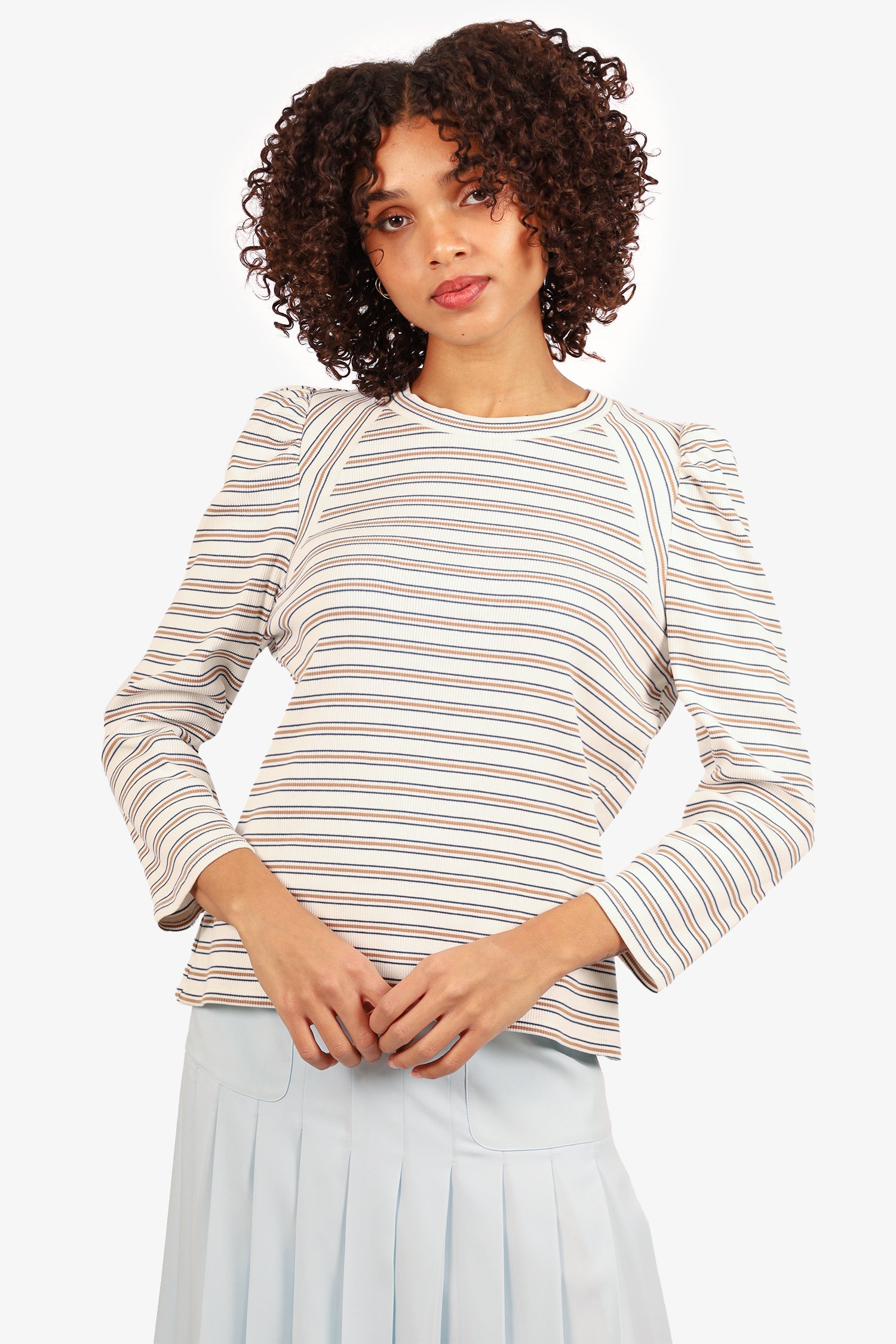 Refresh availabilityVeronica Beard White Delano Stripe Puff Shoulder Rib Top. Pull-on. Round-neckline. Ribbed exterior. Tonal stitching.