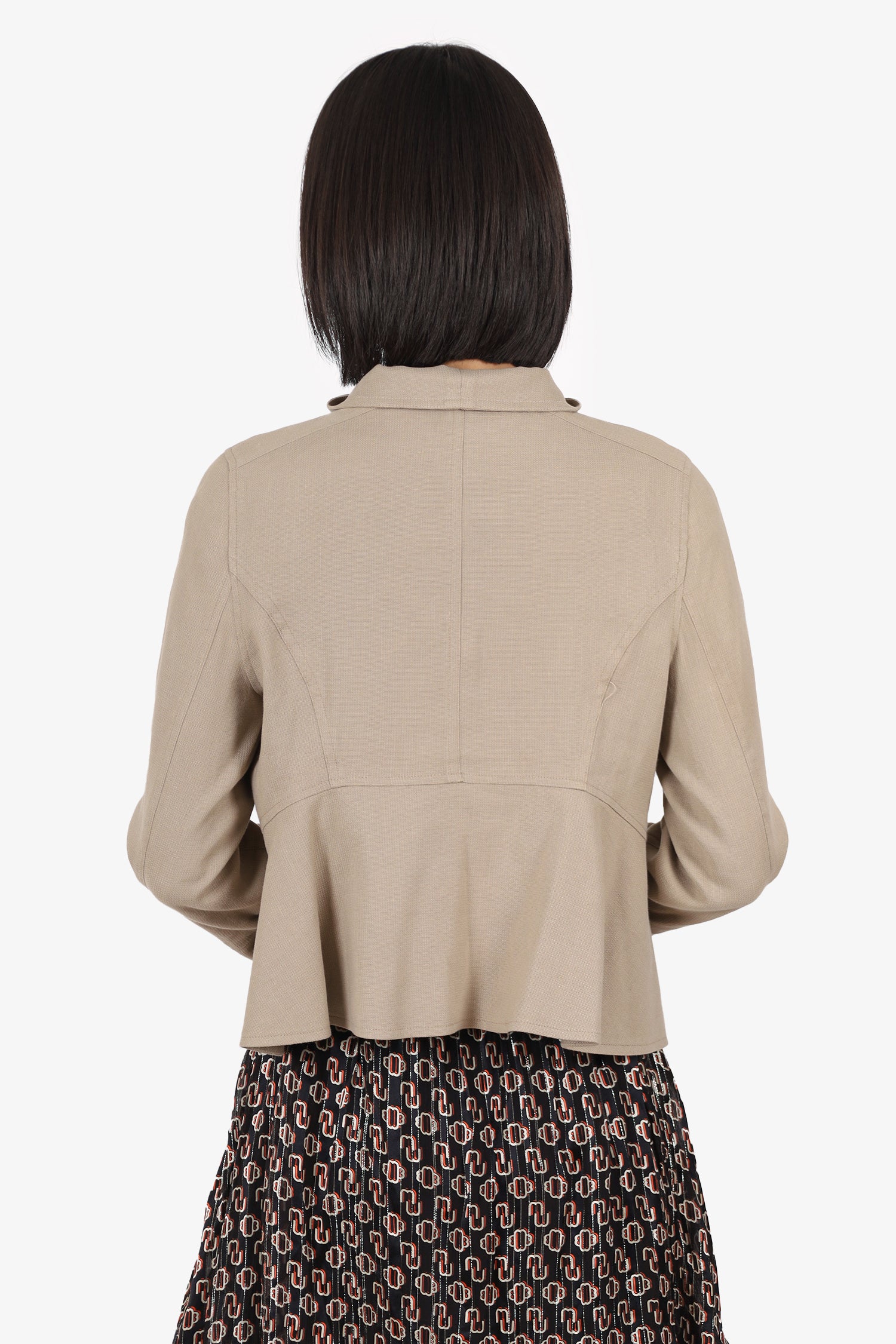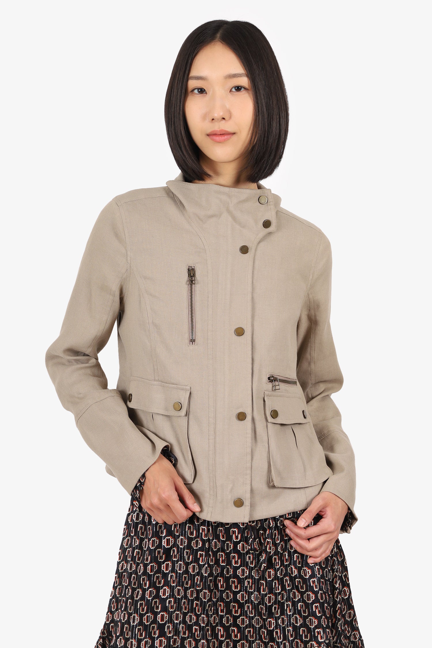 Refresh availabilityVeronica Beard Beige Linen Cargo Jacket. Pull-on. Round-neckline. Front button-up and snap-button closure. Sleeve cuffs with zip closure. 4 exterior pockets; 2 flap with snap-button closure and 2 zip. Bronze-tone hardware. Tonal stitching.