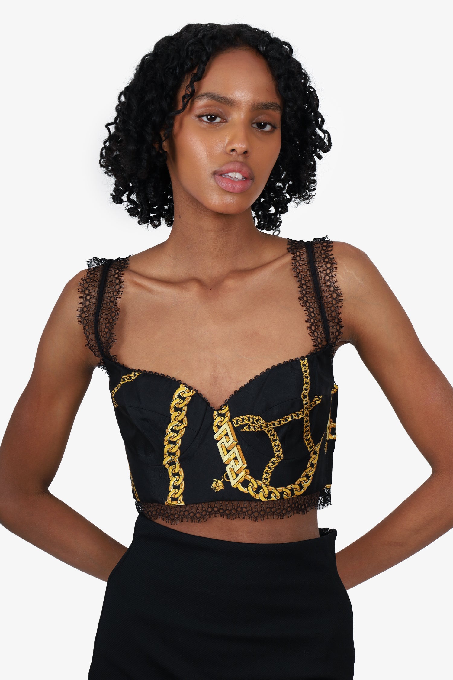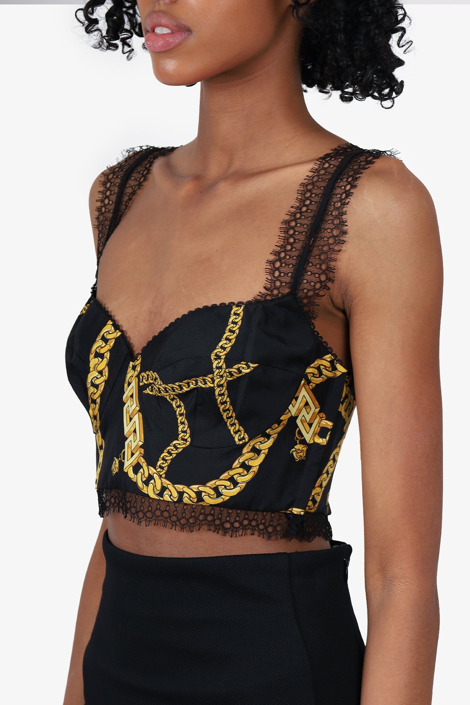 Versace Black/Gold Print Silk Bralette top. Side zip-up closure. Lace detailing on hem and straps. Tonal stitching.