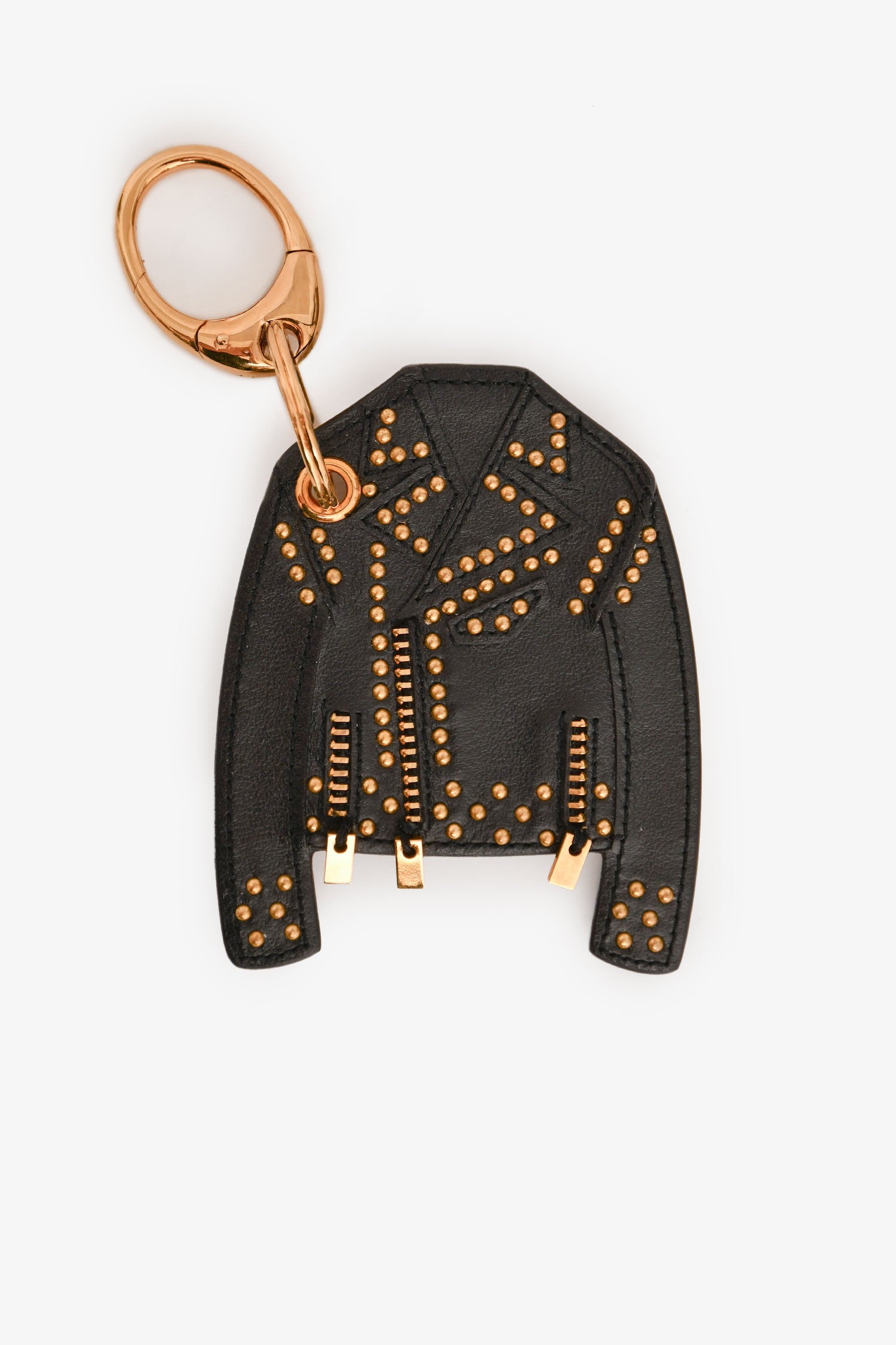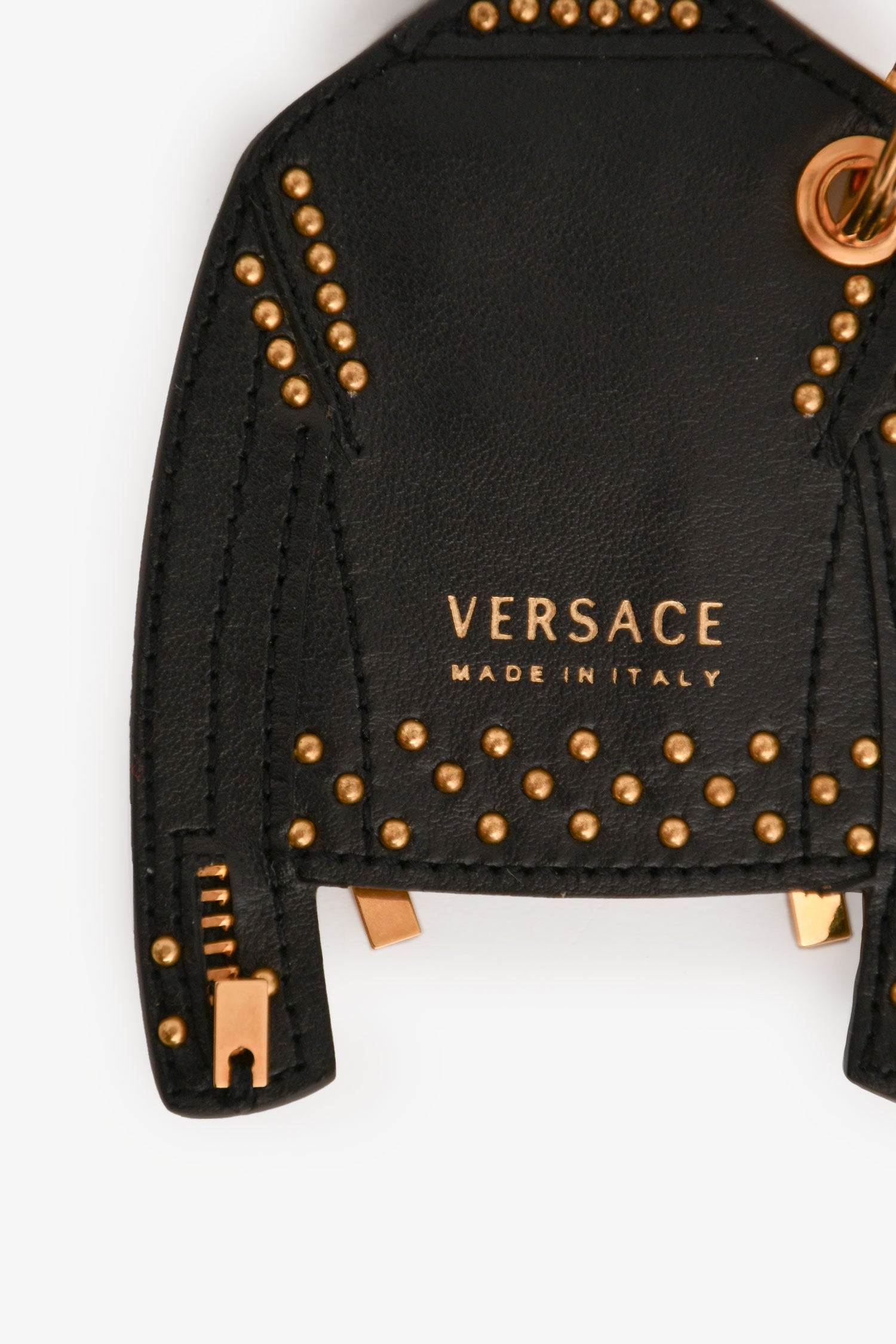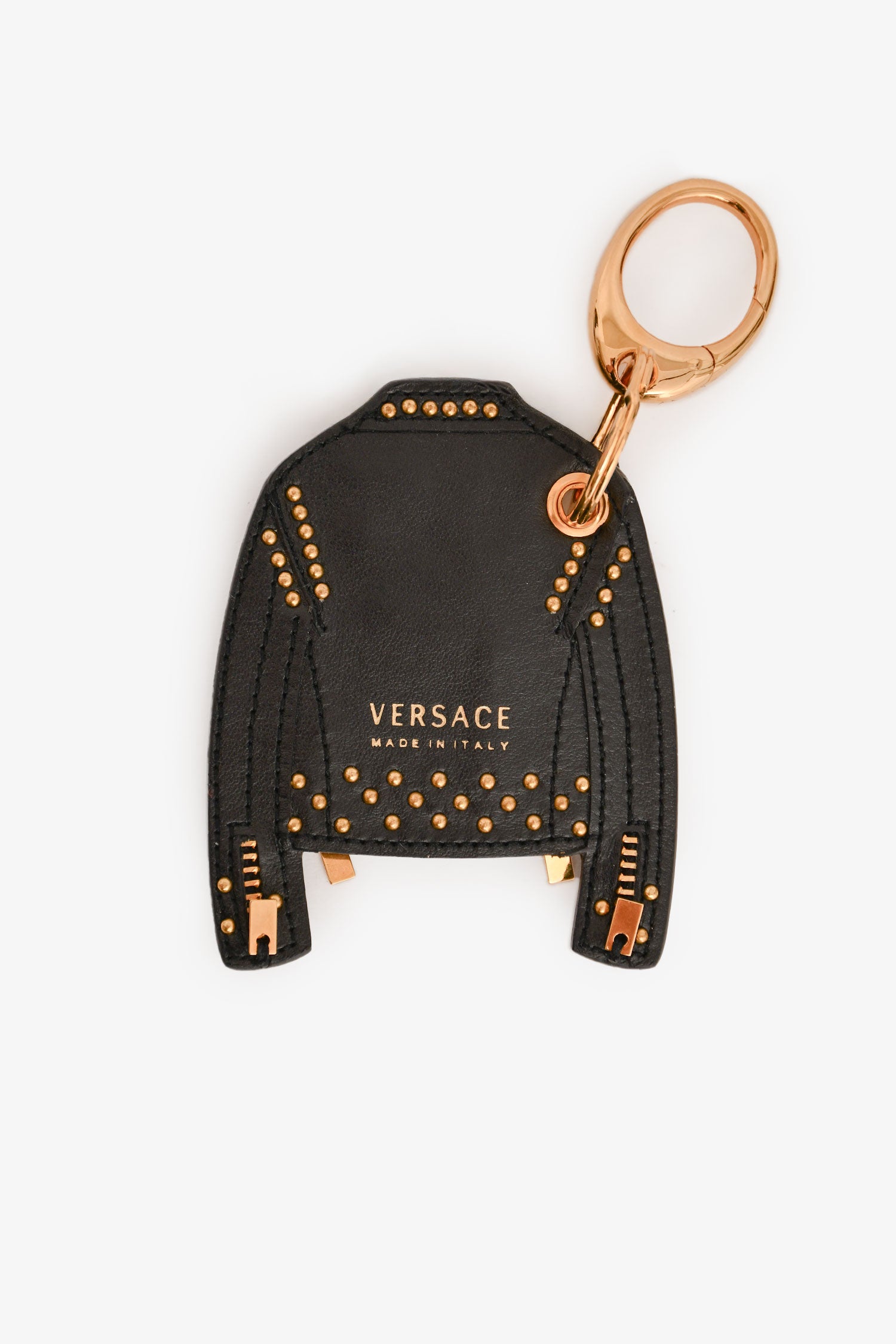 Refresh availabilityVersace Black/ Gold Studded Leather Jacket Keychain. Gold-tone stud embellishments. Zip and snap button accents. Lobster clasp. Tonal stitching.