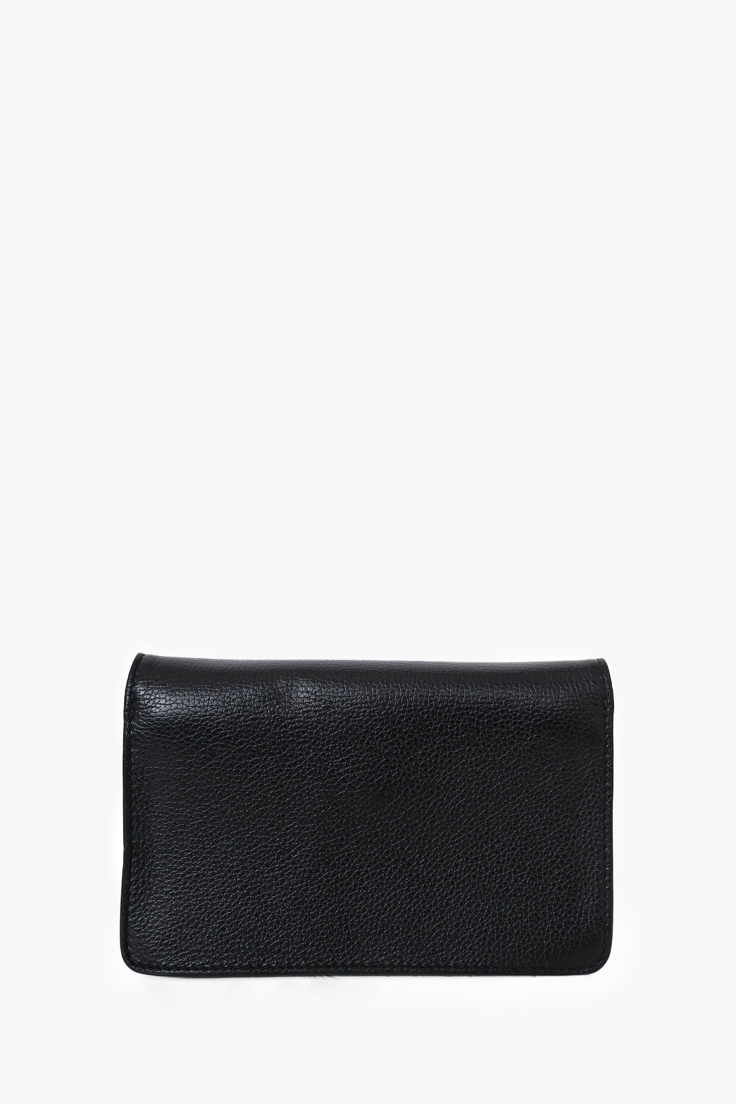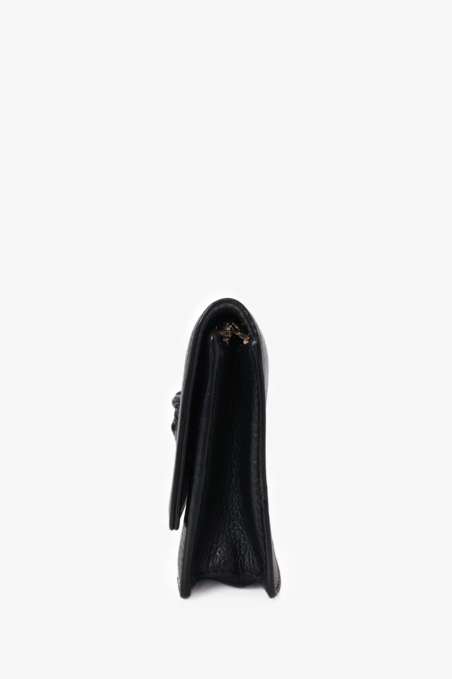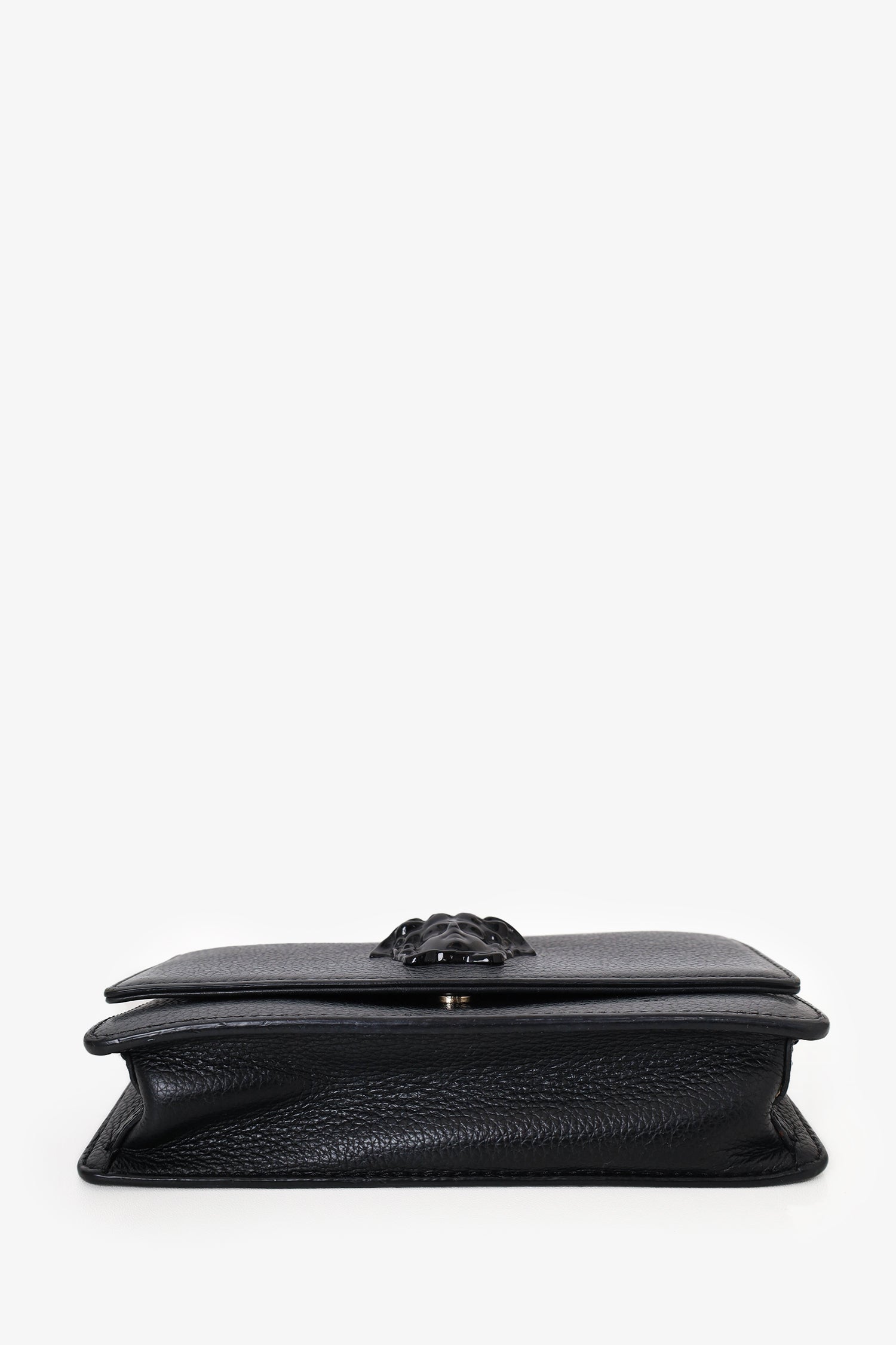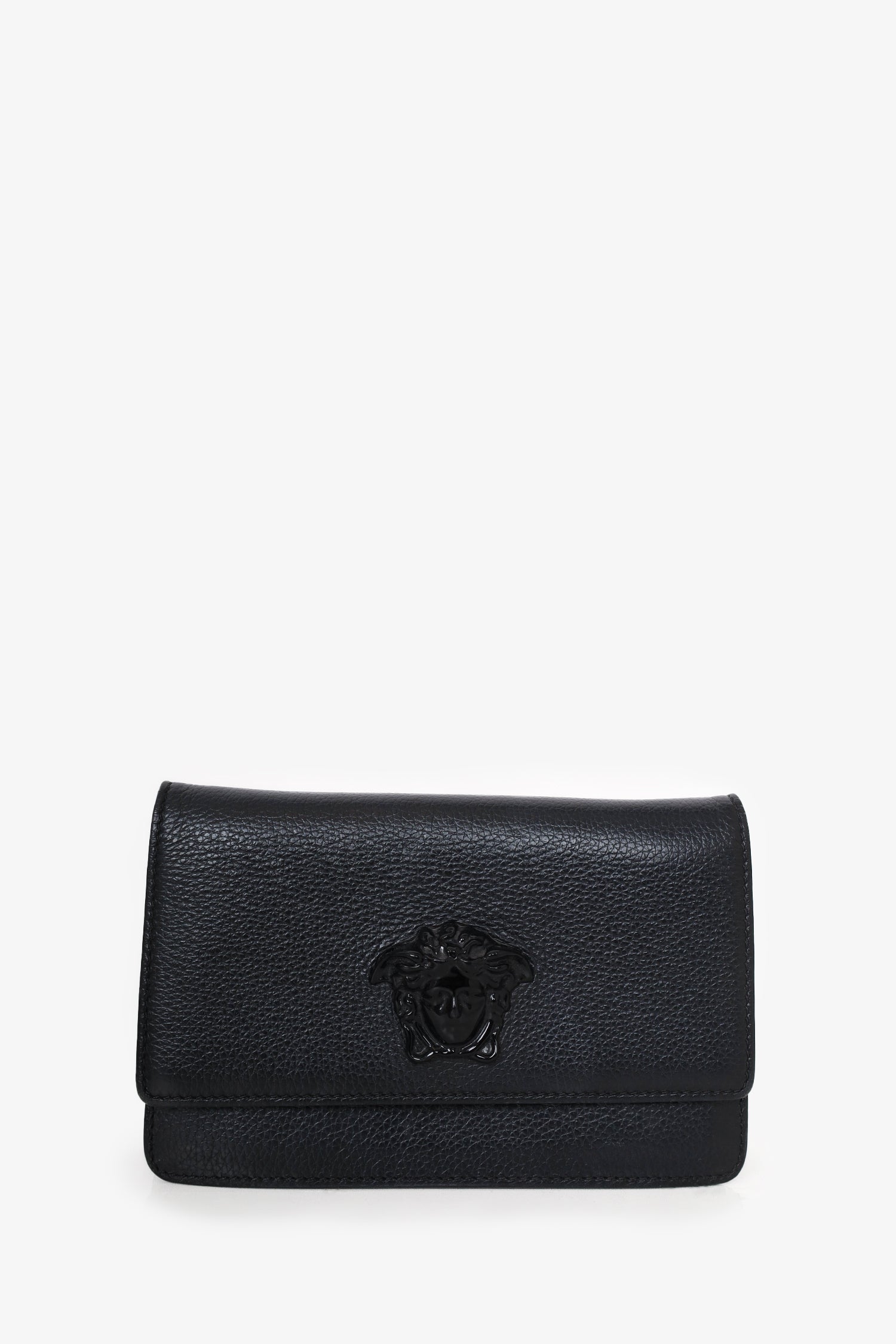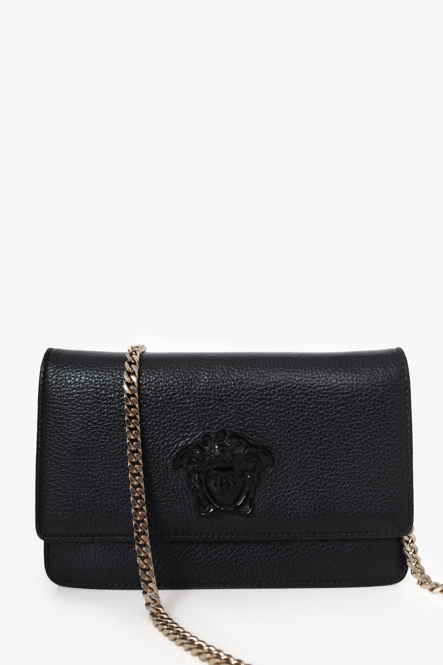 Refresh availabilityVersace Black Grained Calfskin Medusa Chain Bag. Button magnetic closure. 8 interior pockets; 1 wide slip pocket, 1 zip pocket, and 6 card slip pockets. Tonal stitching.