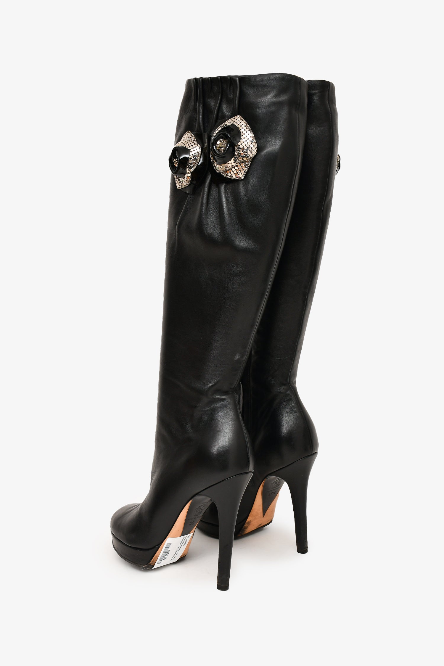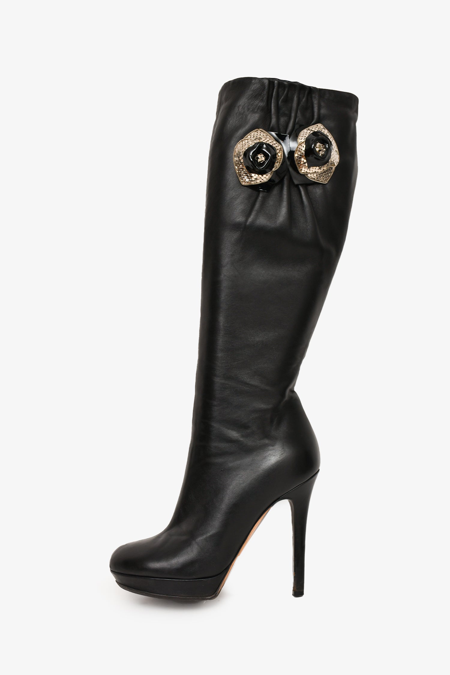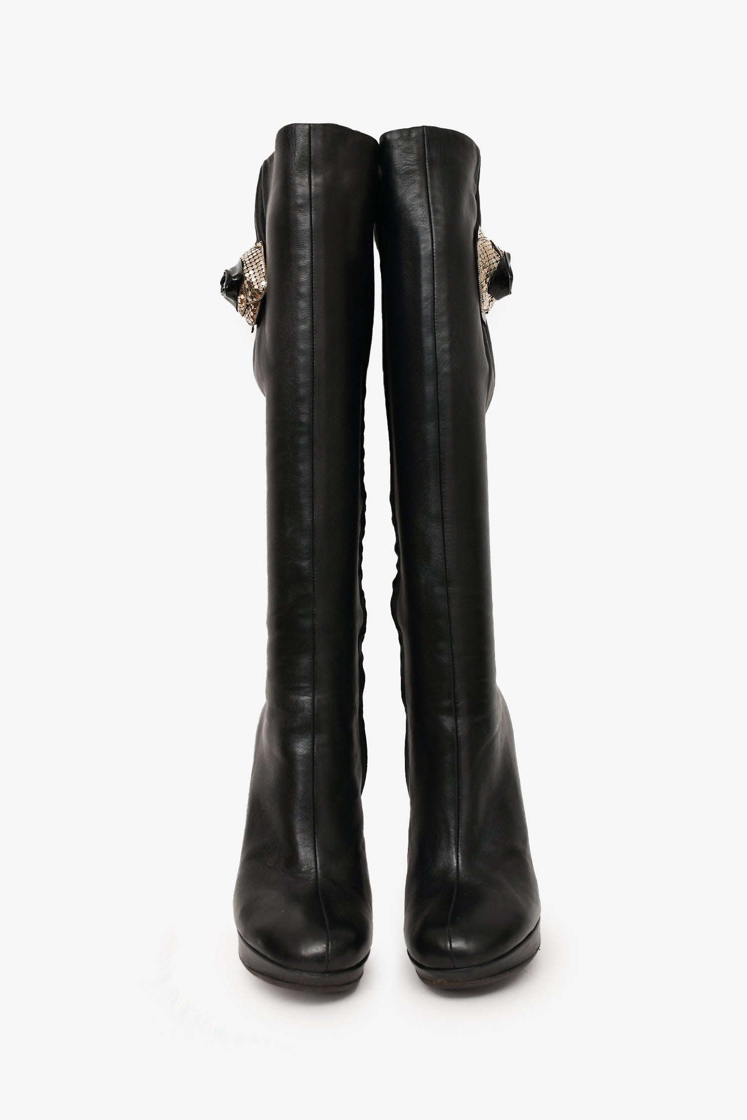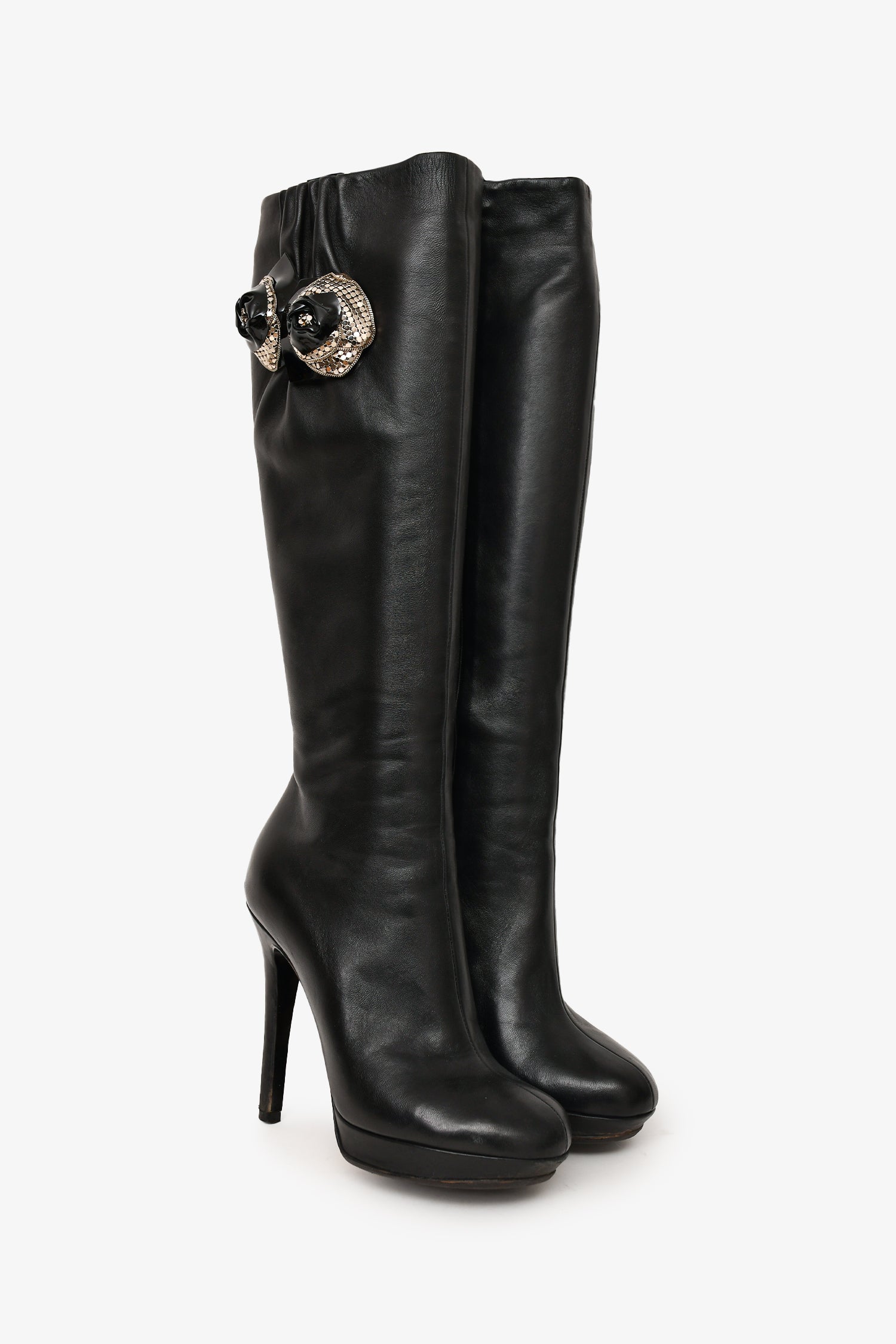 Refresh availabilityVersace Black Leather Floral Charm Embellished Knee High Boots. Silver-tone hardware. Side zipper closure. Round-toe. Slight platform. Tonal stitching.