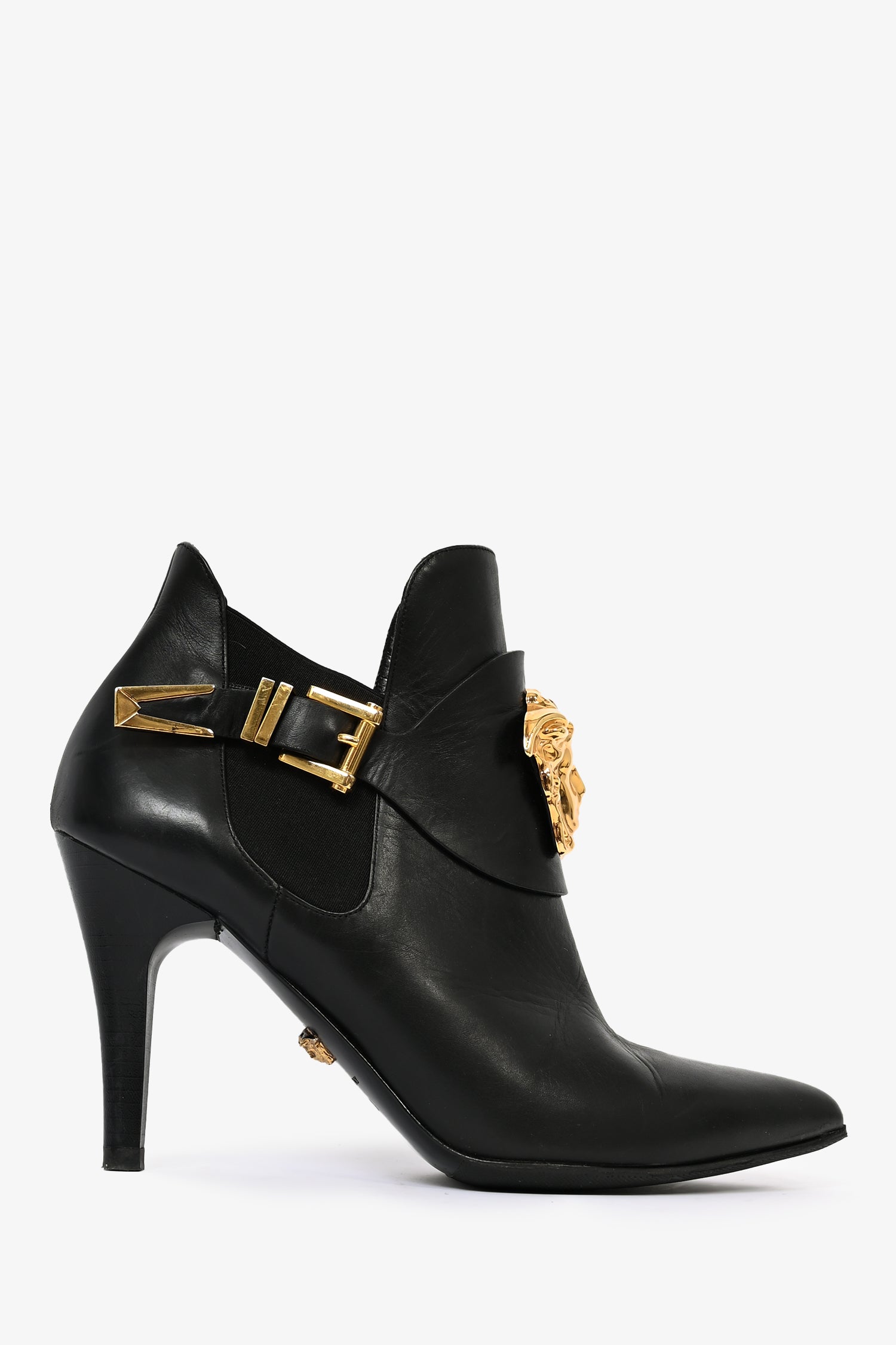 Refresh availabilityVersace Black Leather/Gold Medusa Heeled Booties. Pointed toe. Pull-on. Elasticized trims on the sides.