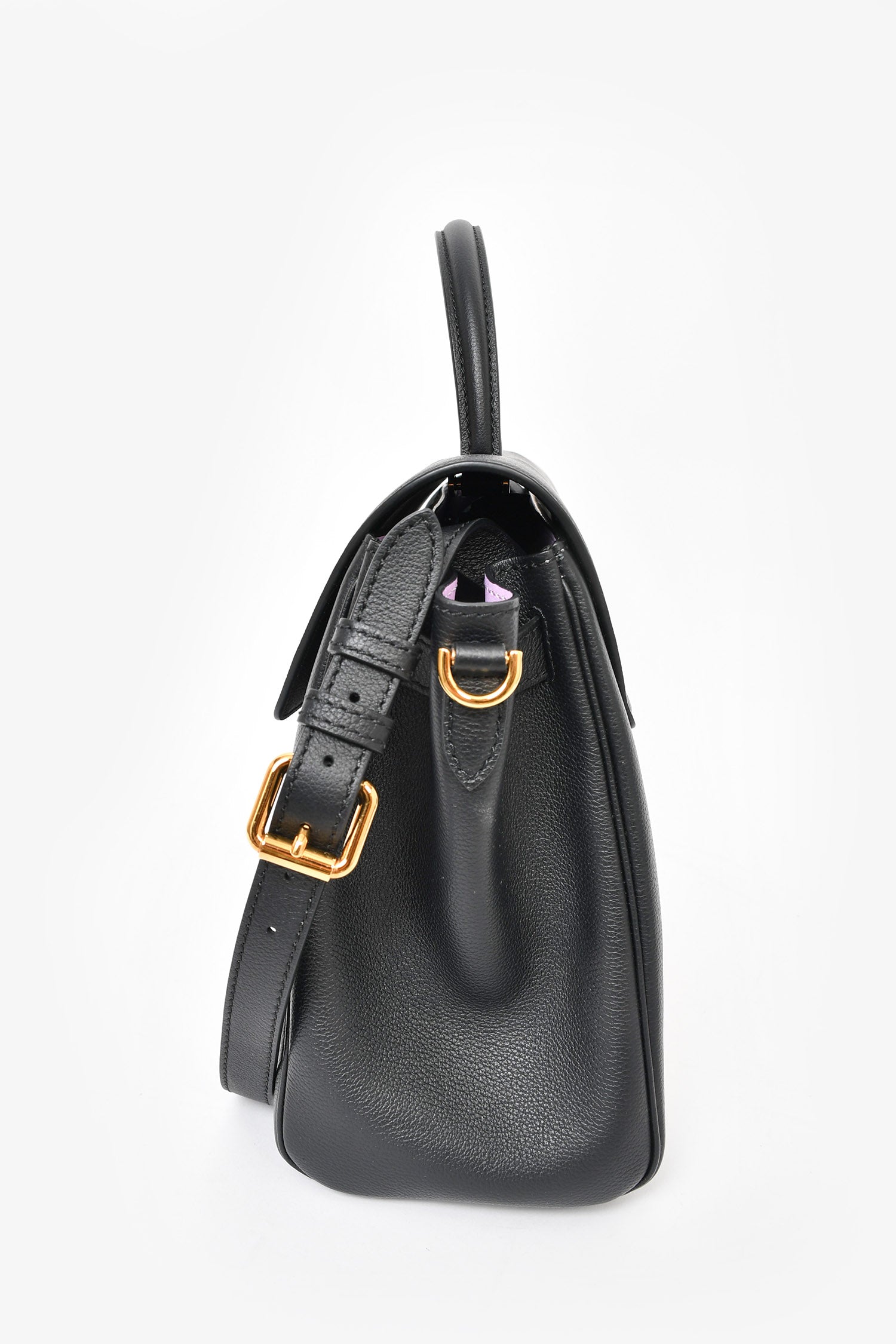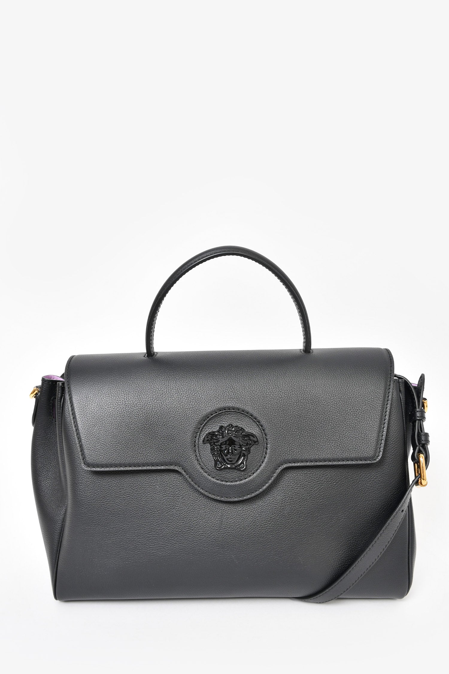 Refresh availabilityVersace Black Leather Large 'Medusa' Top Handle Bag with Strap. Front fold-over flap with magnetic closure. open interior. 2 slip wall pockets. 1 wall zip interior pocket. Removable and adjustable strap. Gold-toned hardware. Tonal stitching.