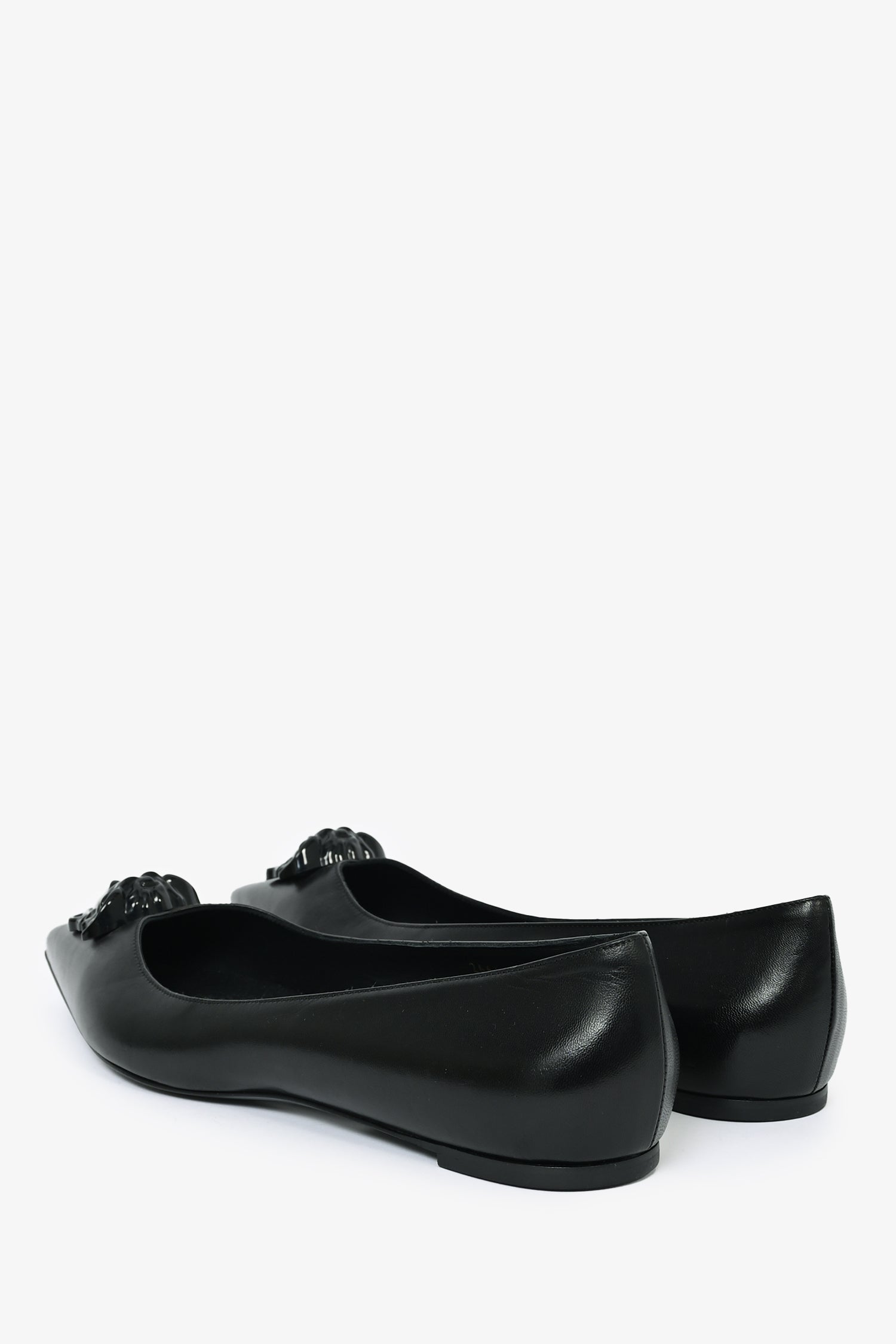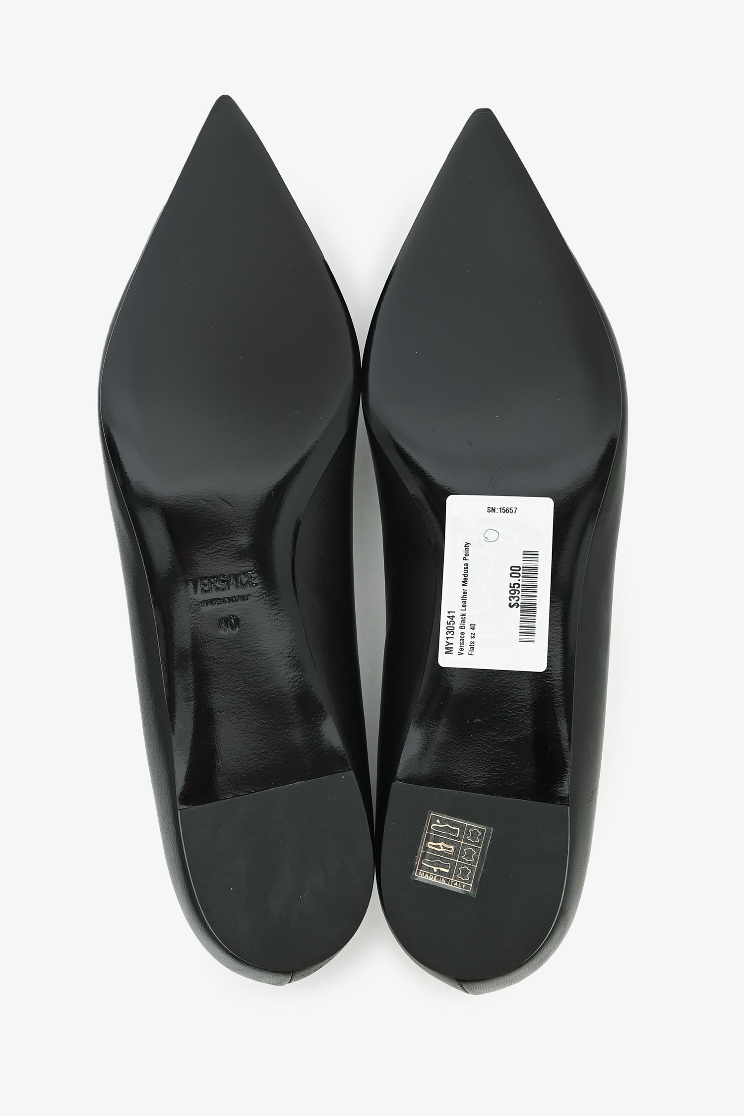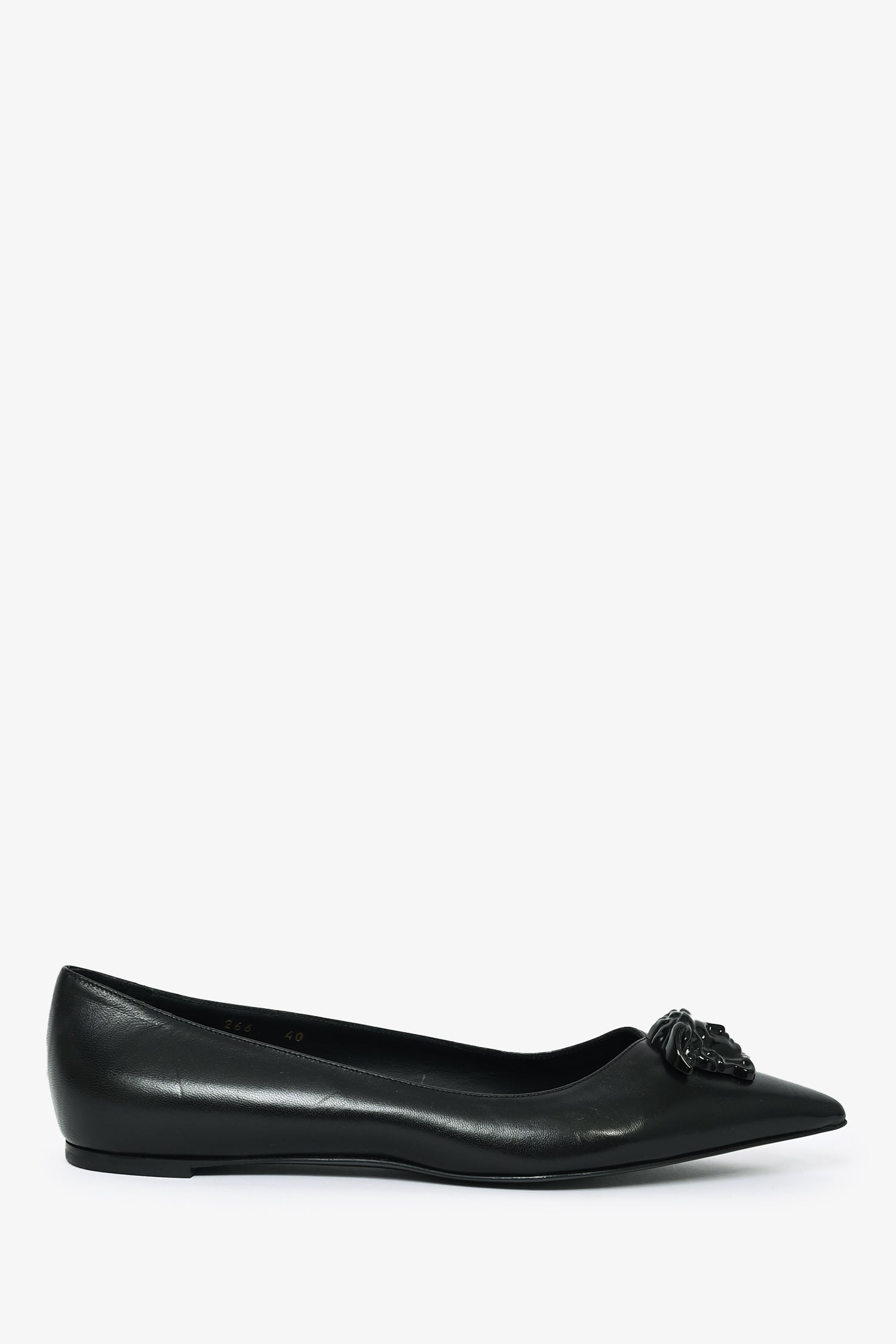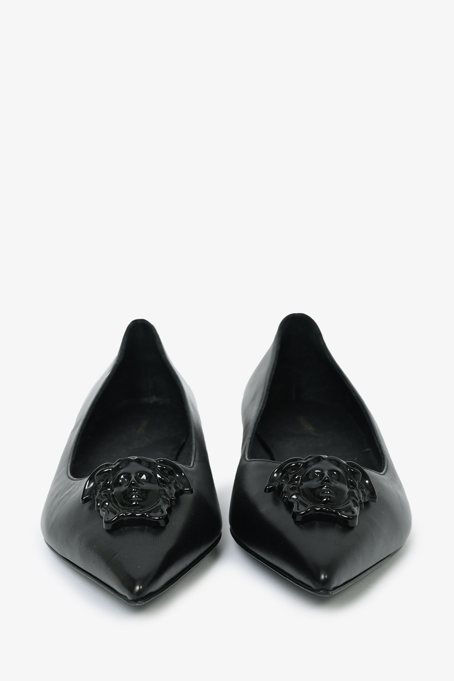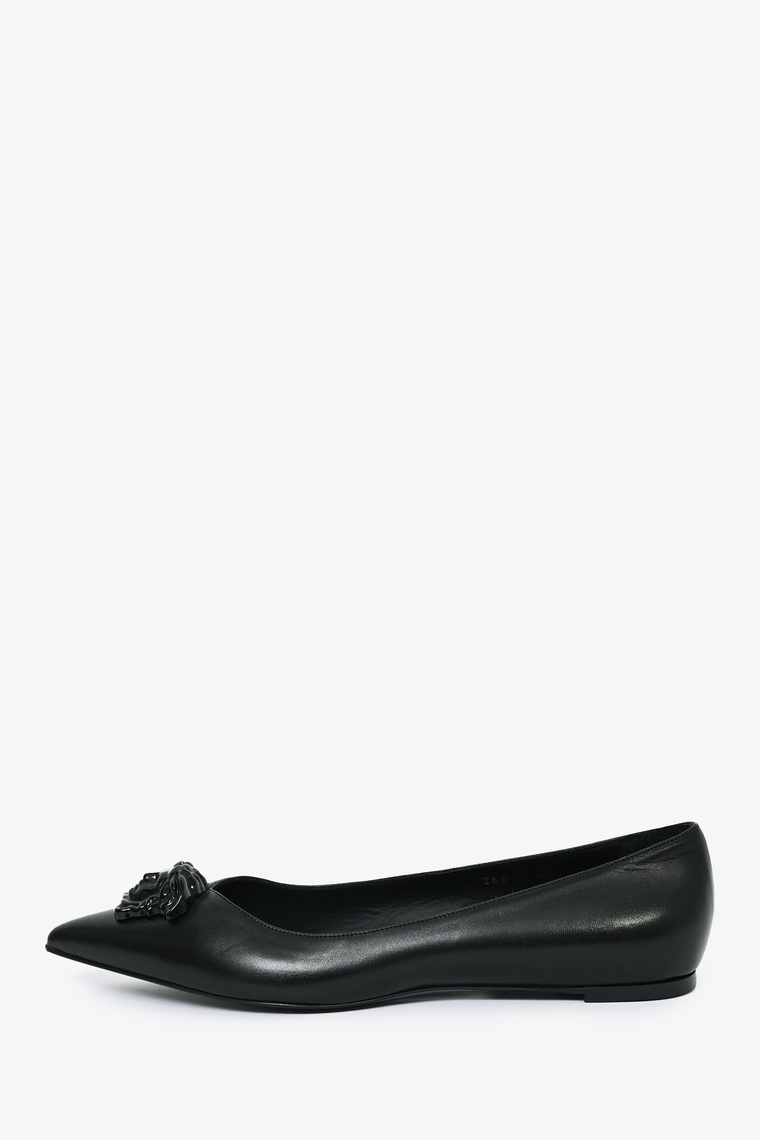 Refresh availabilityVersace Black Leather Medusa Pointy Flats. Pointy closed tow. Black hardware on the face. Tonal stitching.