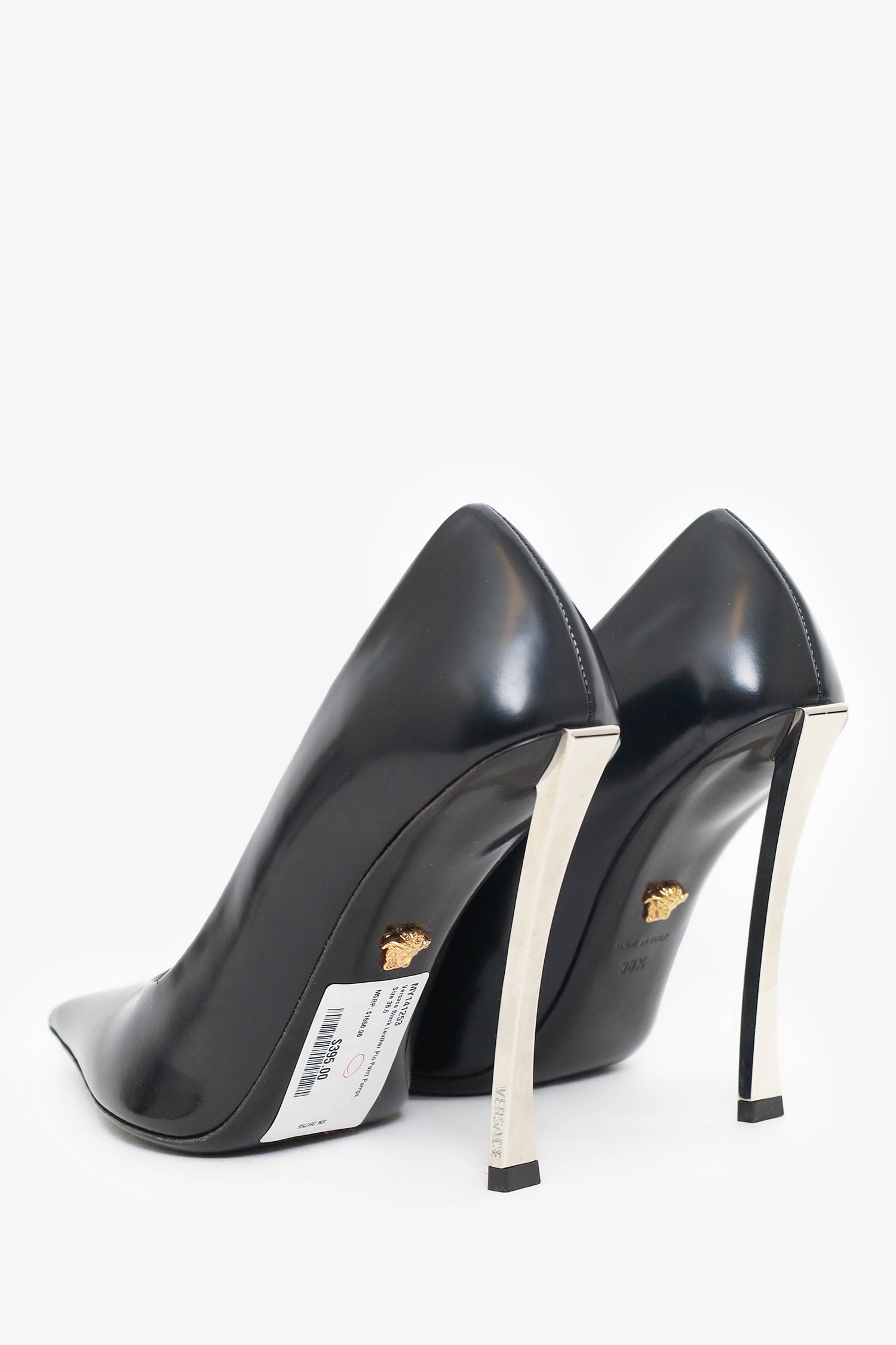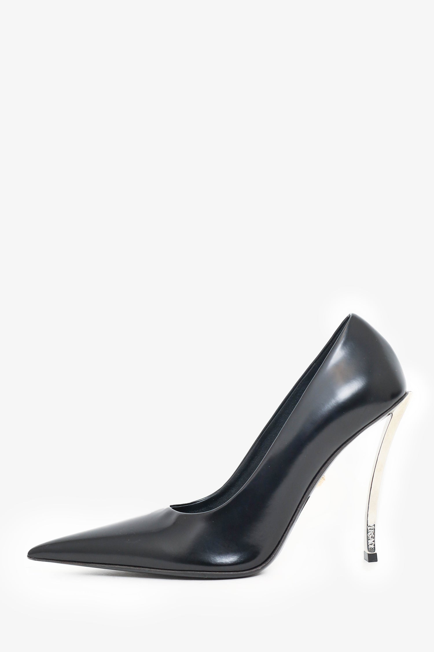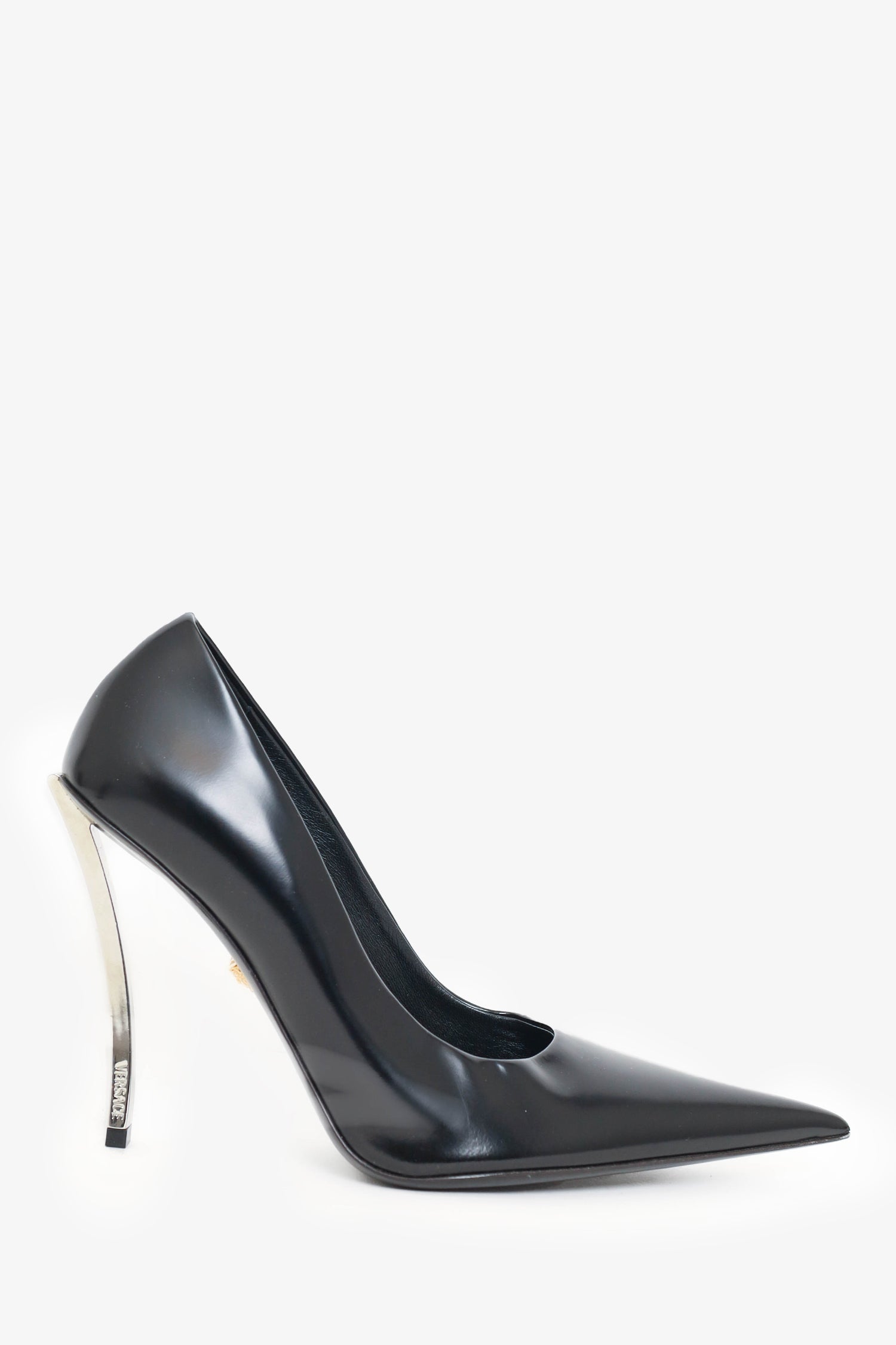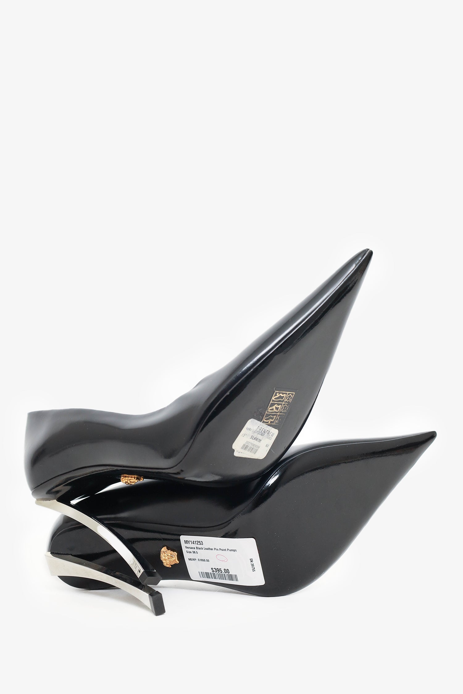 Refresh availabilityVersace Black Leather Pin Point Pumps. Slip-on. Pointed toe. Silver tone hardware. Tonal stitching.