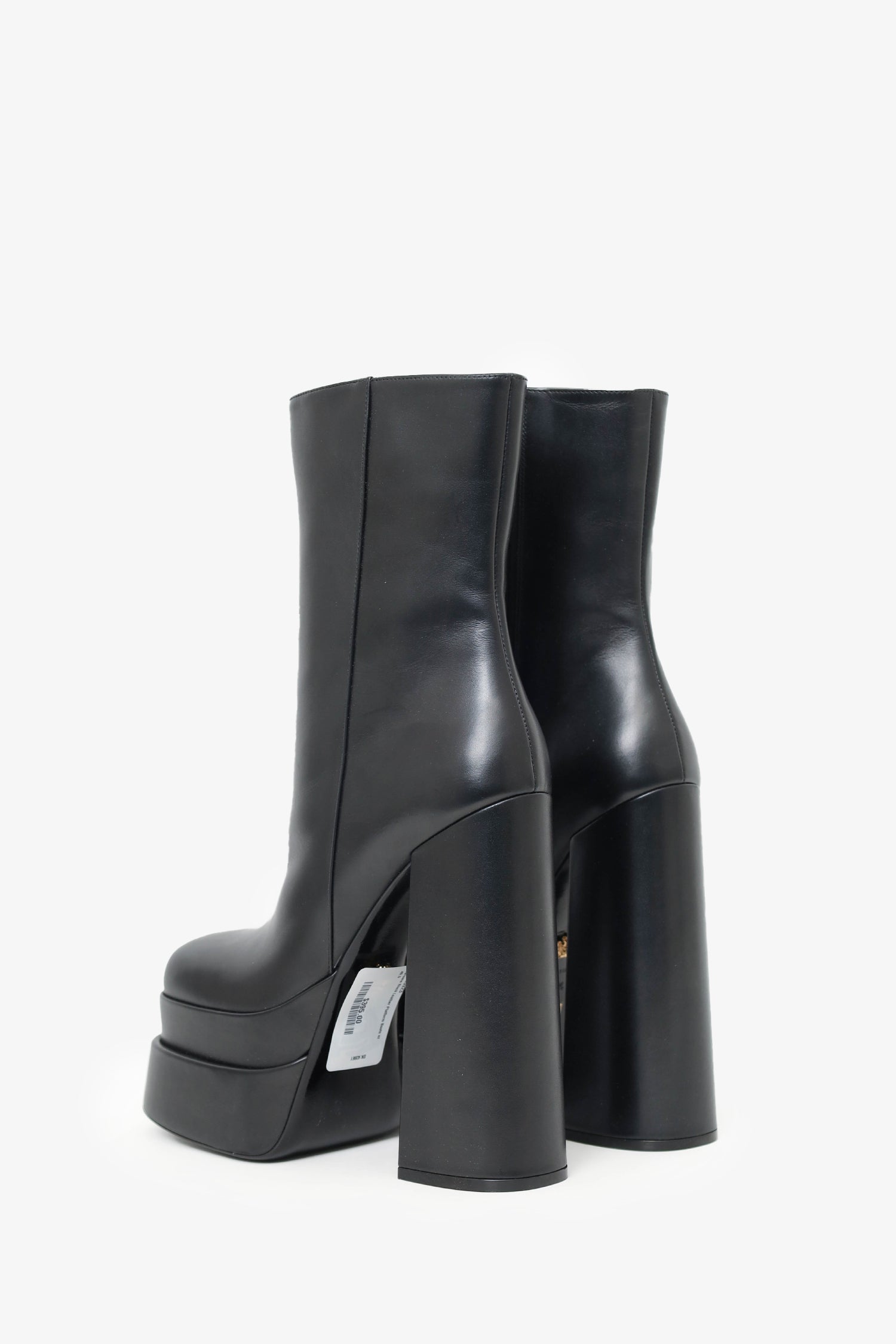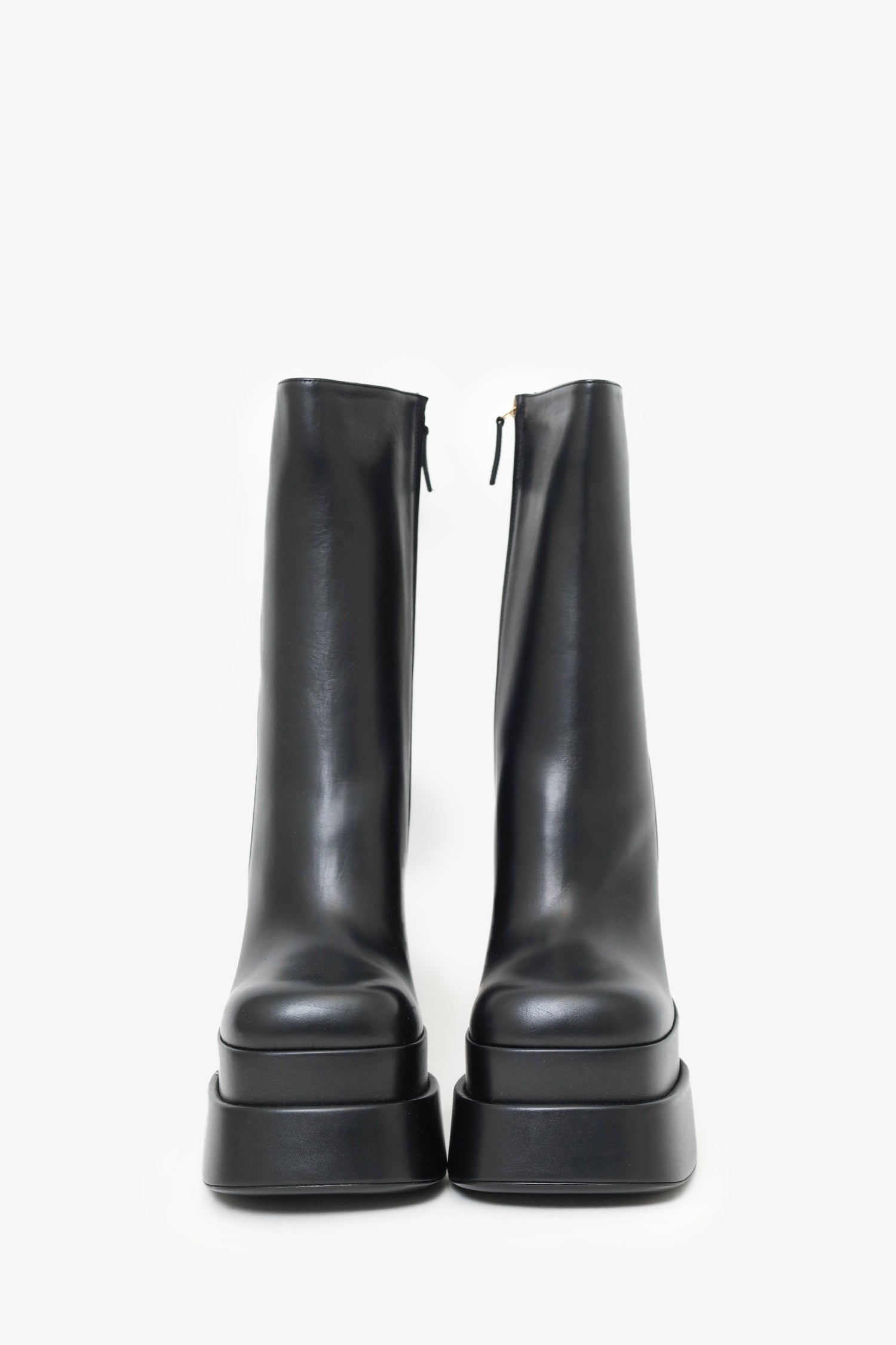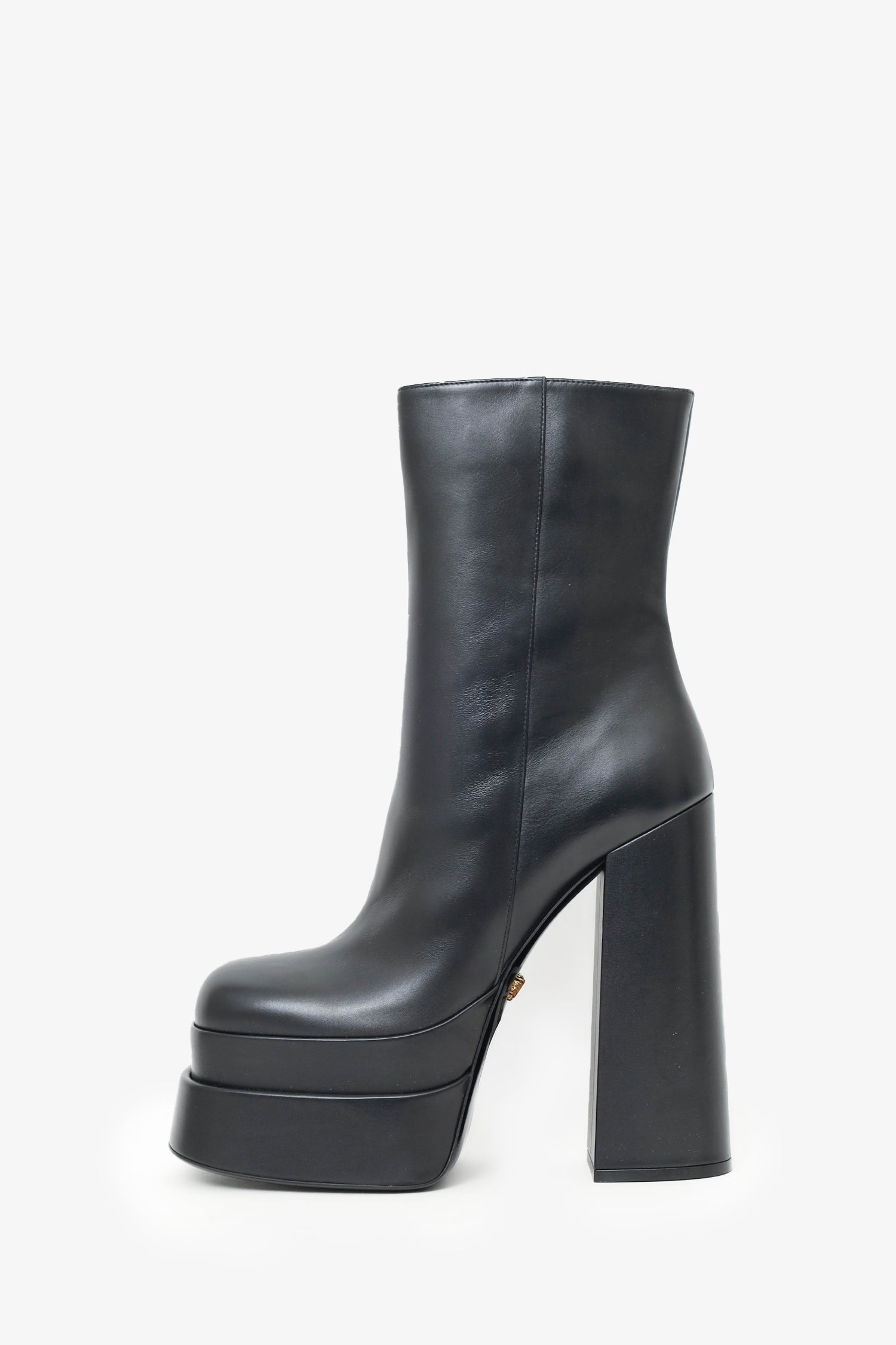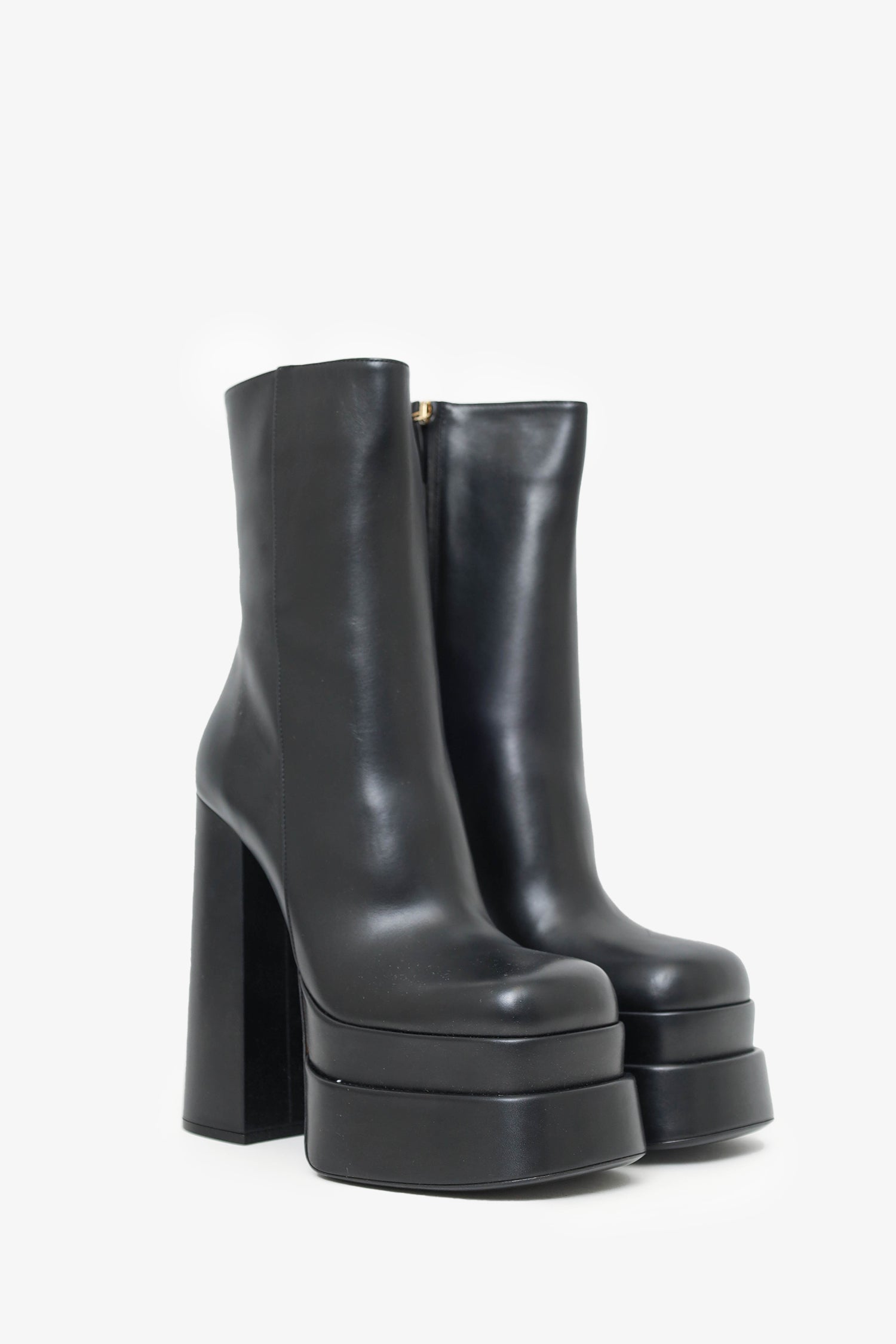 Refresh availabilityVersace Black Leather Platform Boots. Side zip closure. Round square toe. Block heel. Gold-tone hardware. Tonal stitching