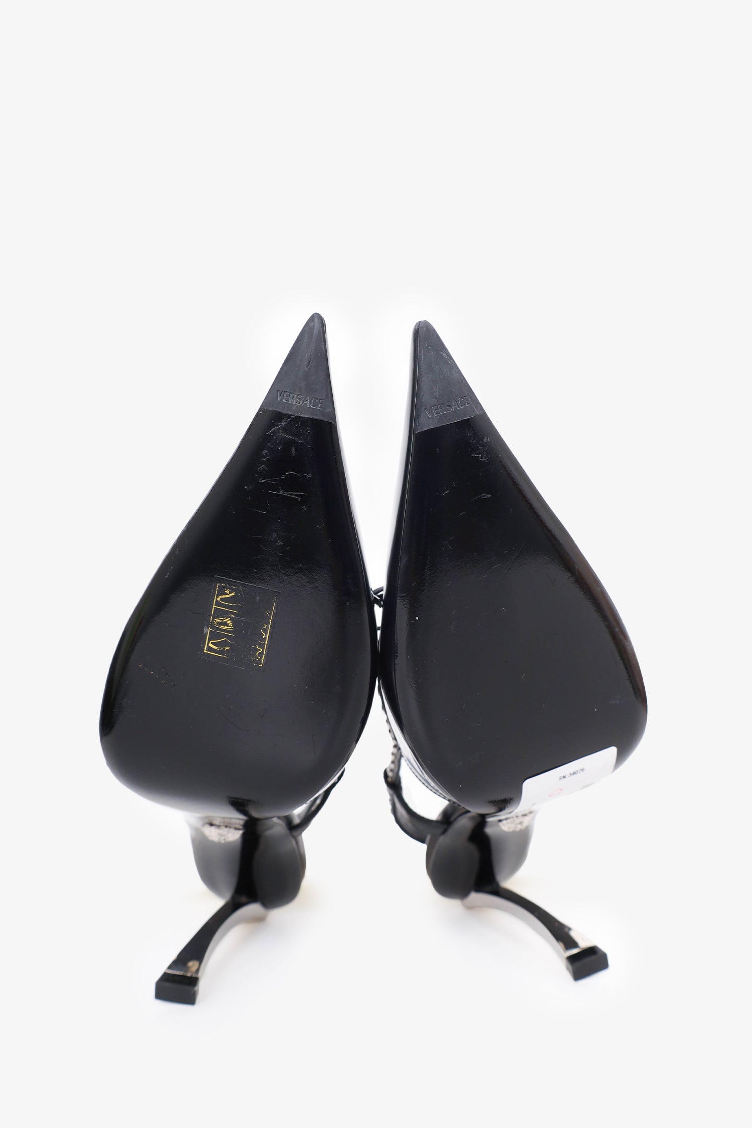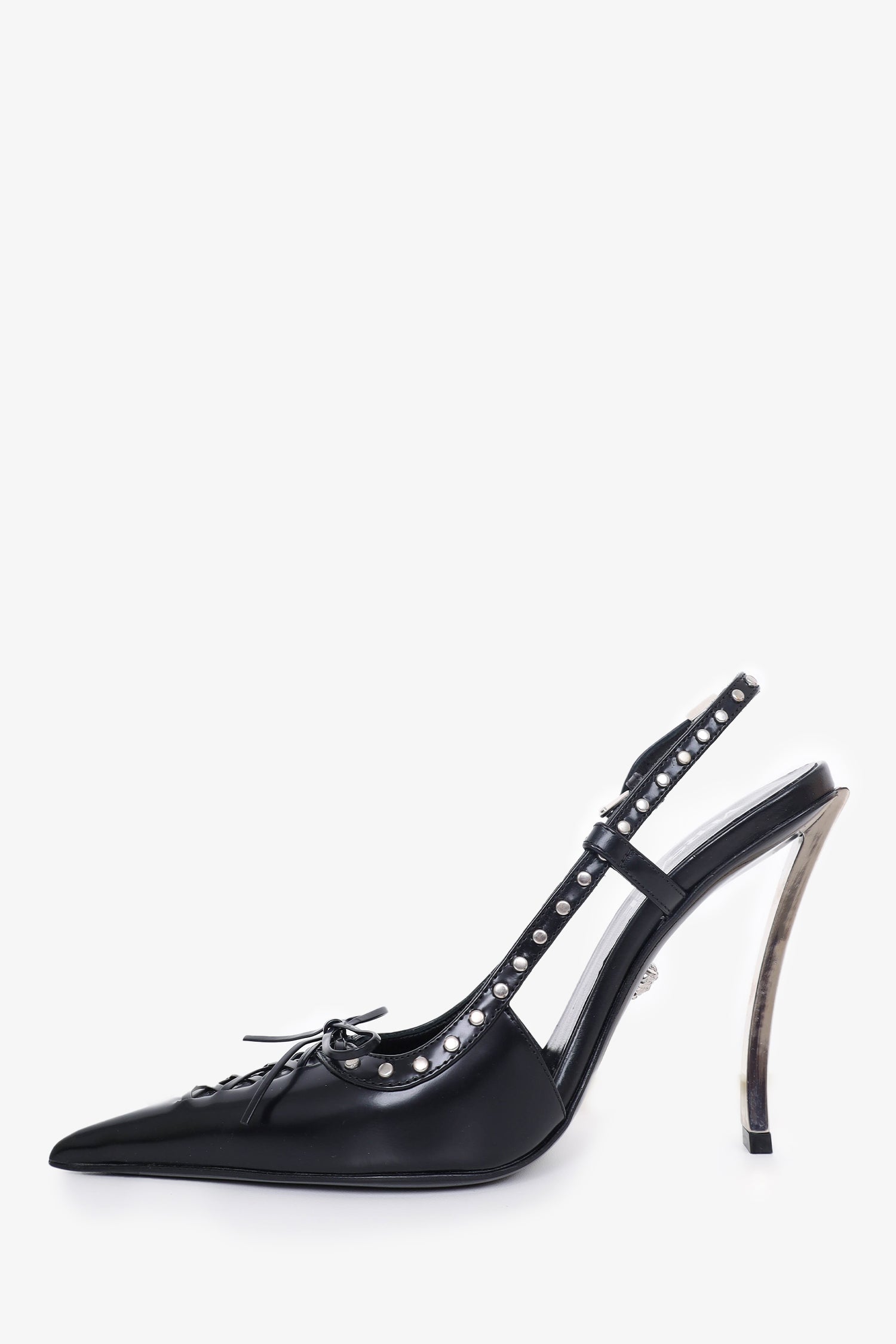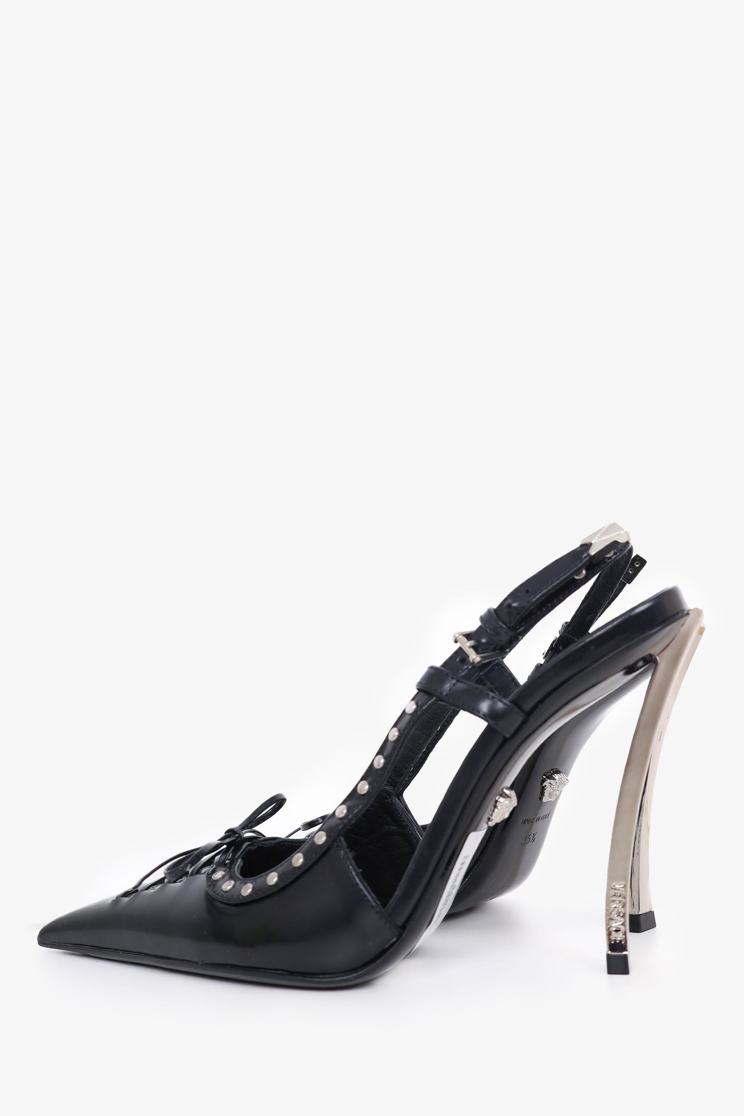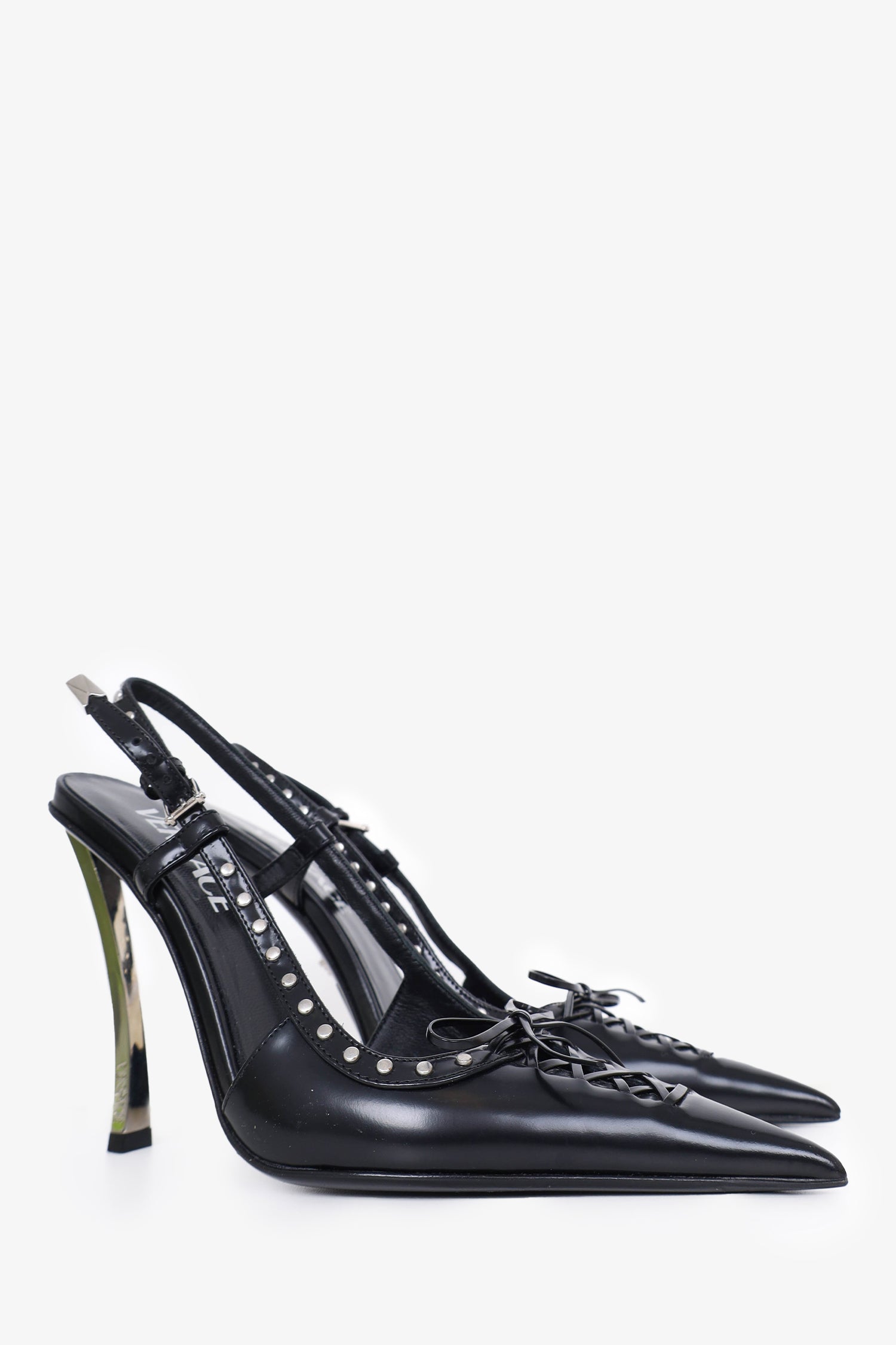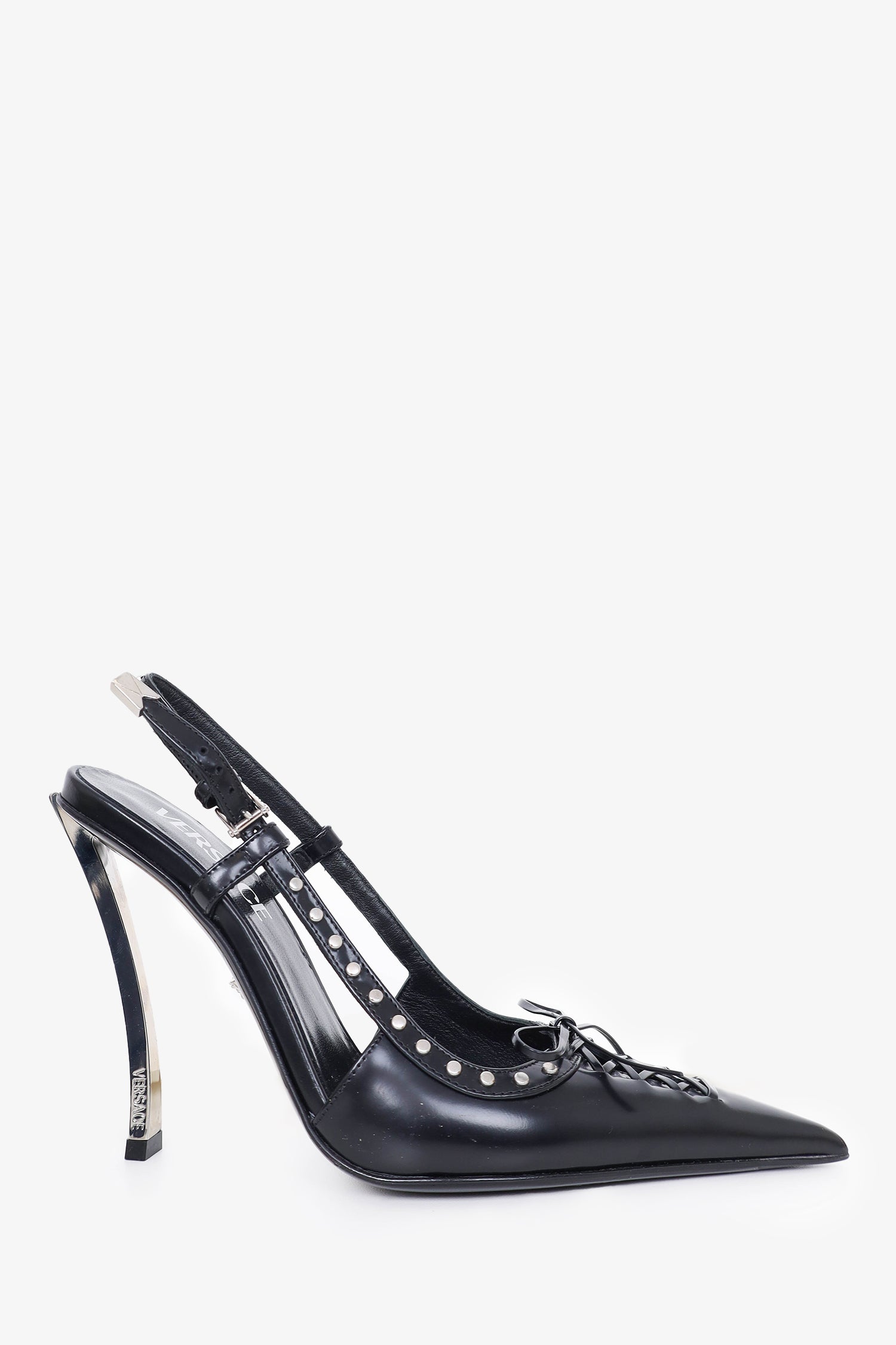 Refresh availabilityVersace Black Leather Pointed Lace Slingback Heels. Slip-on. Ankle buckle closure. Pointed toe. Silver tone hardware. Tonal stitching.