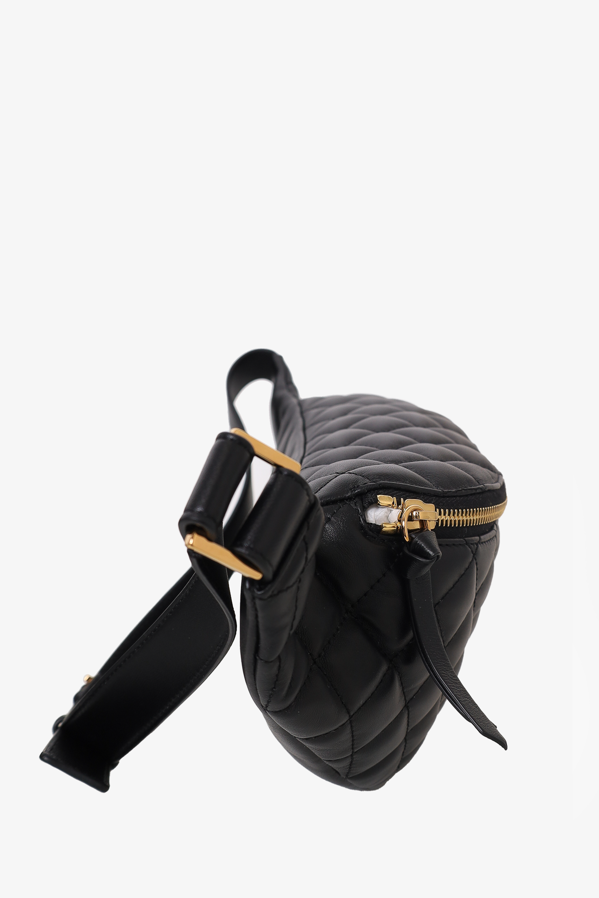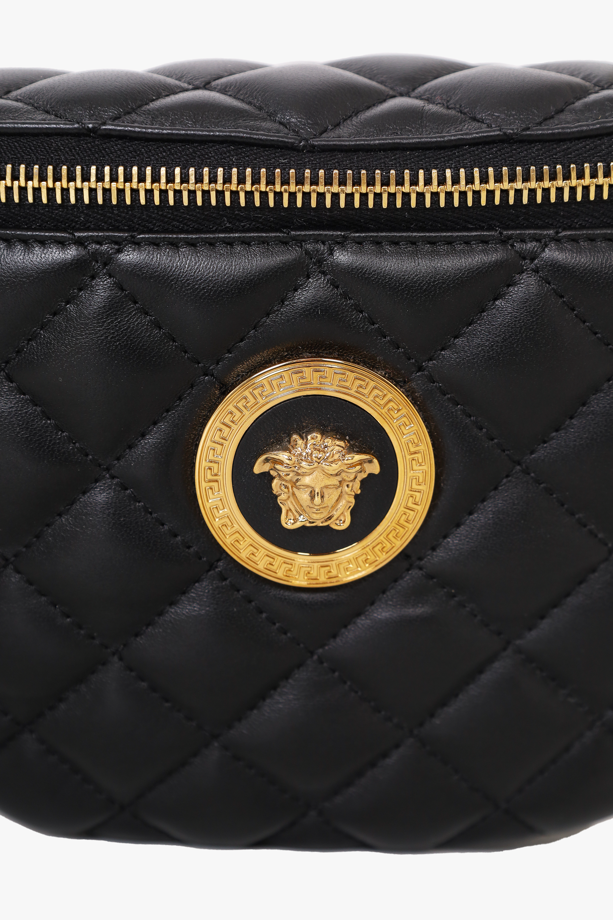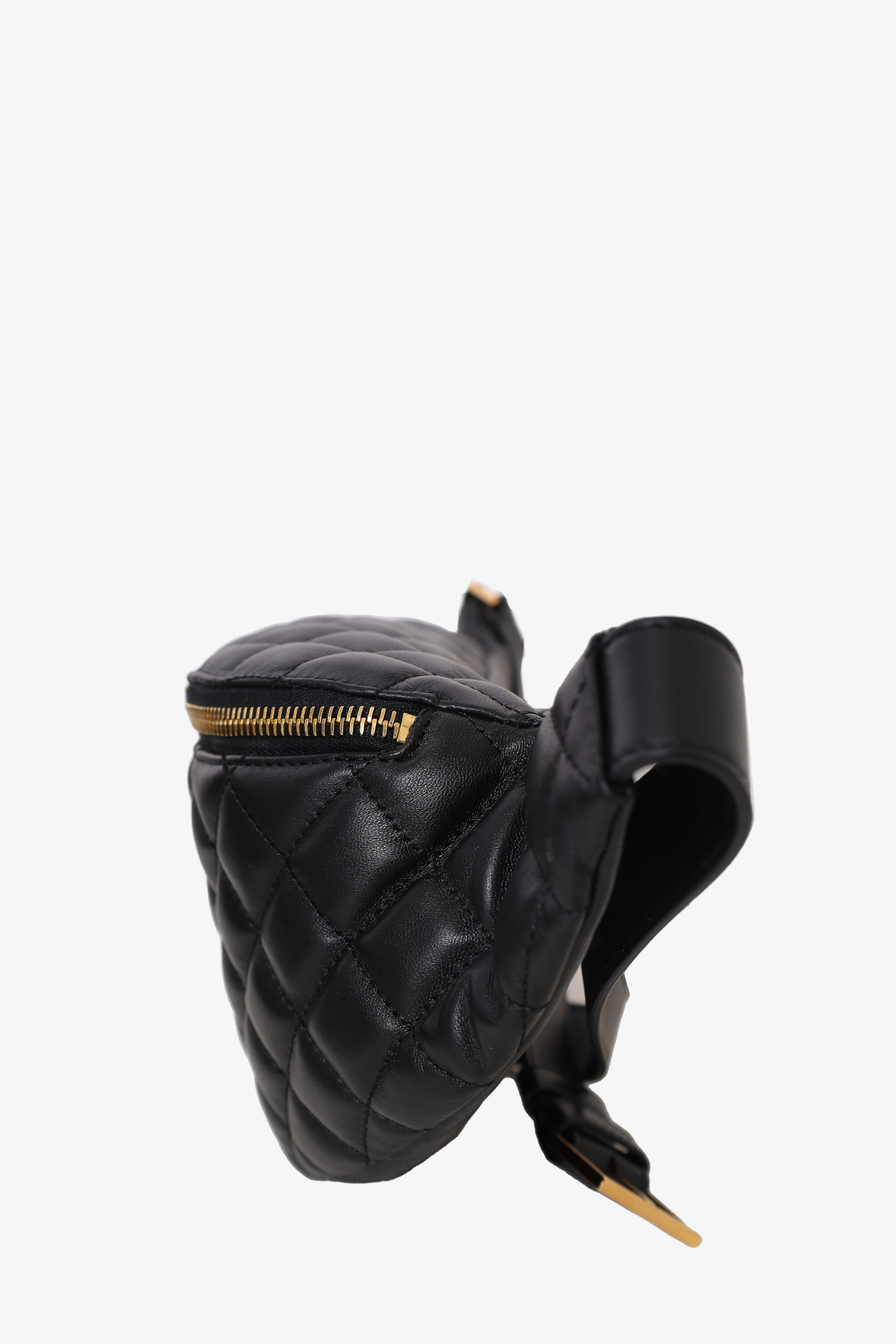 Versace Black Leather Quilted Medusa Belt Bag. Top zipper closure. Adjustable strap with buckle closure. Gold-toned hardware. Tonal stitching.
