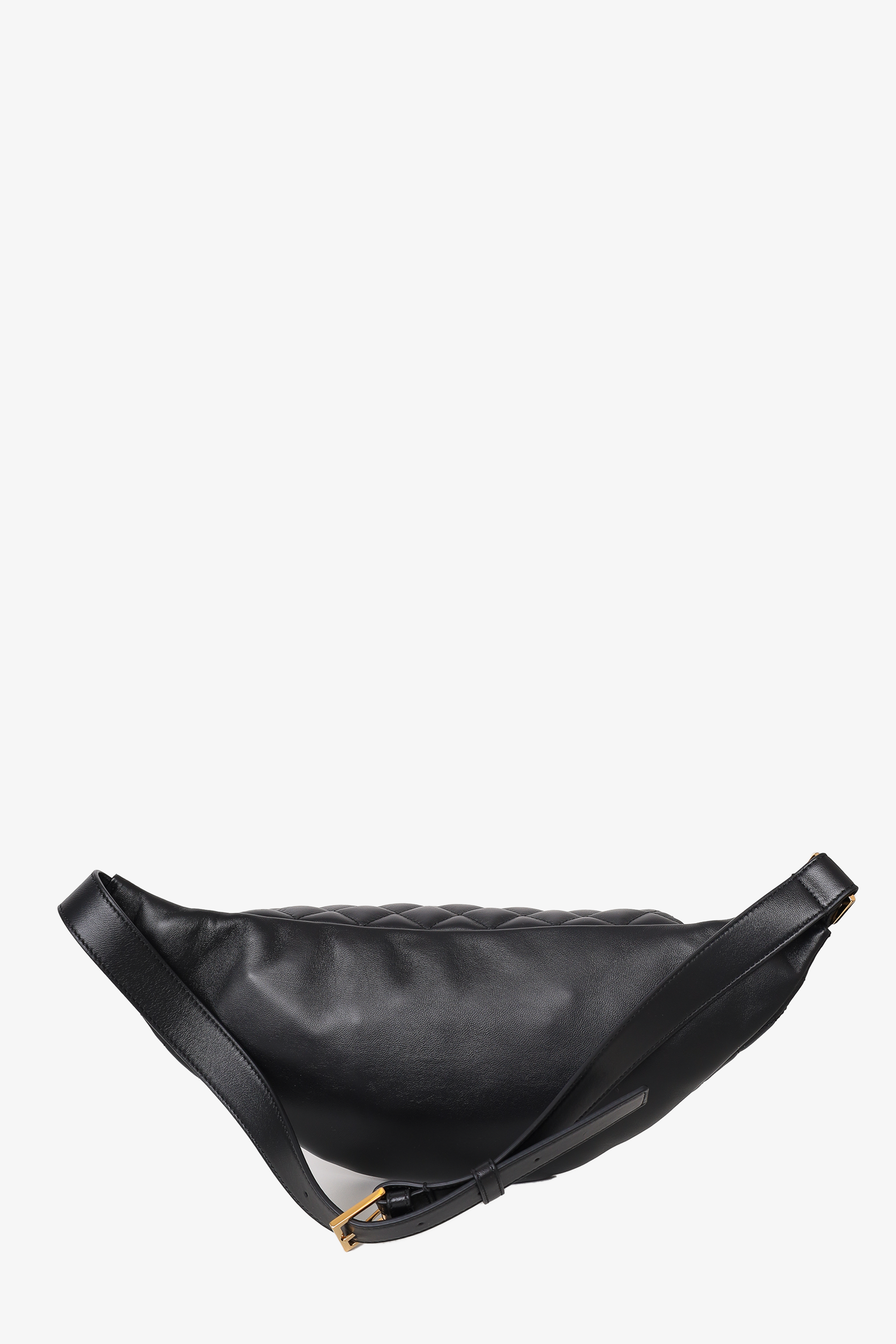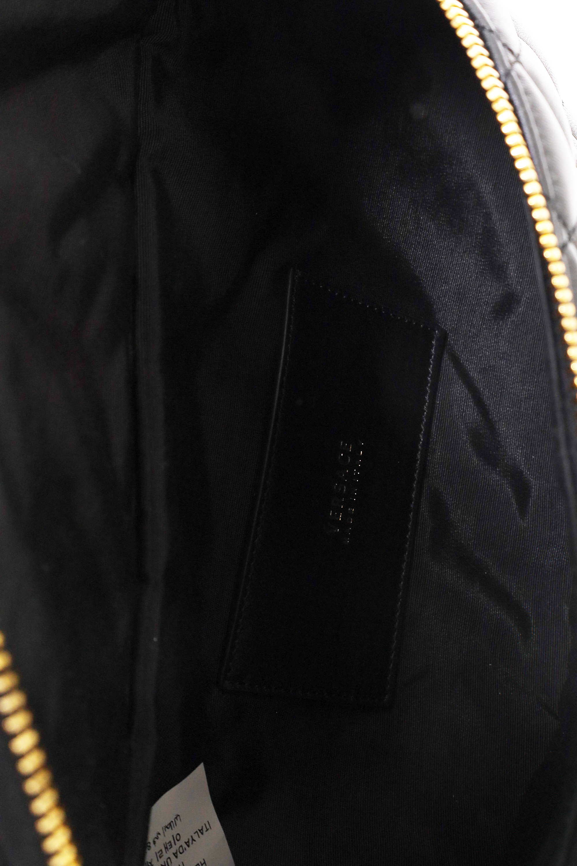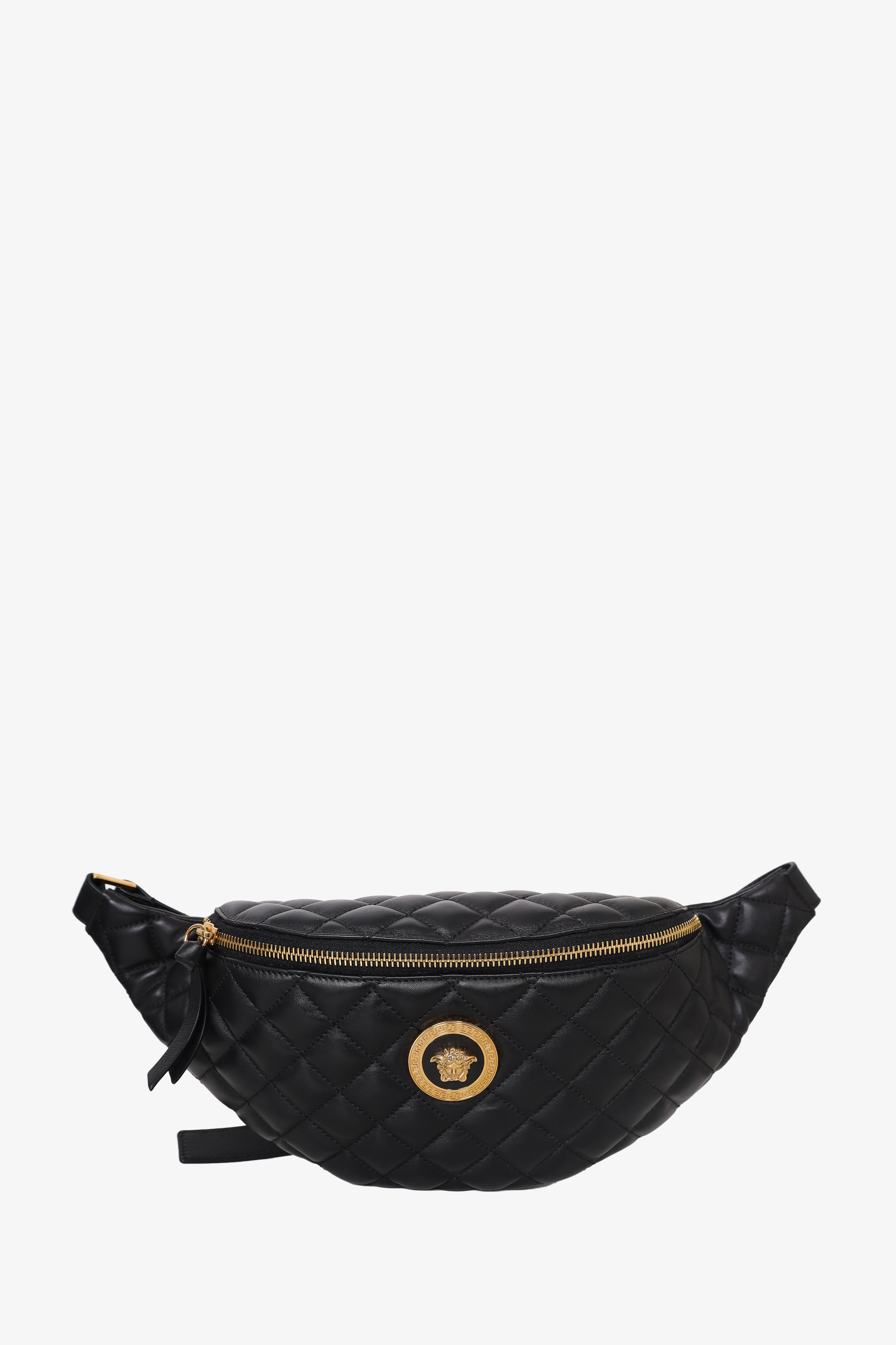 Versace Black Leather Quilted Medusa Belt Bag. Top zipper closure. Adjustable strap with buckle closure. Gold-toned hardware. Tonal stitching.