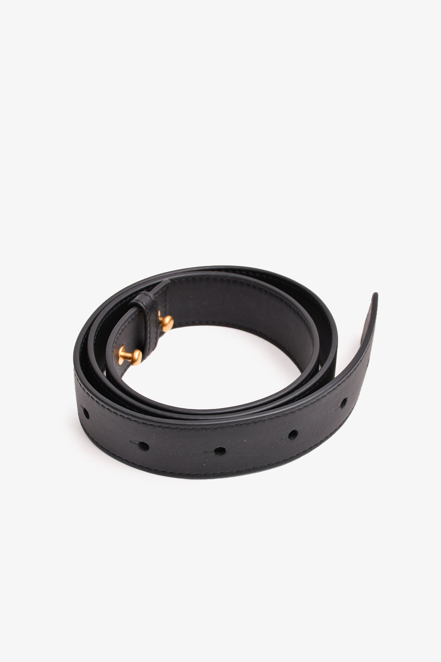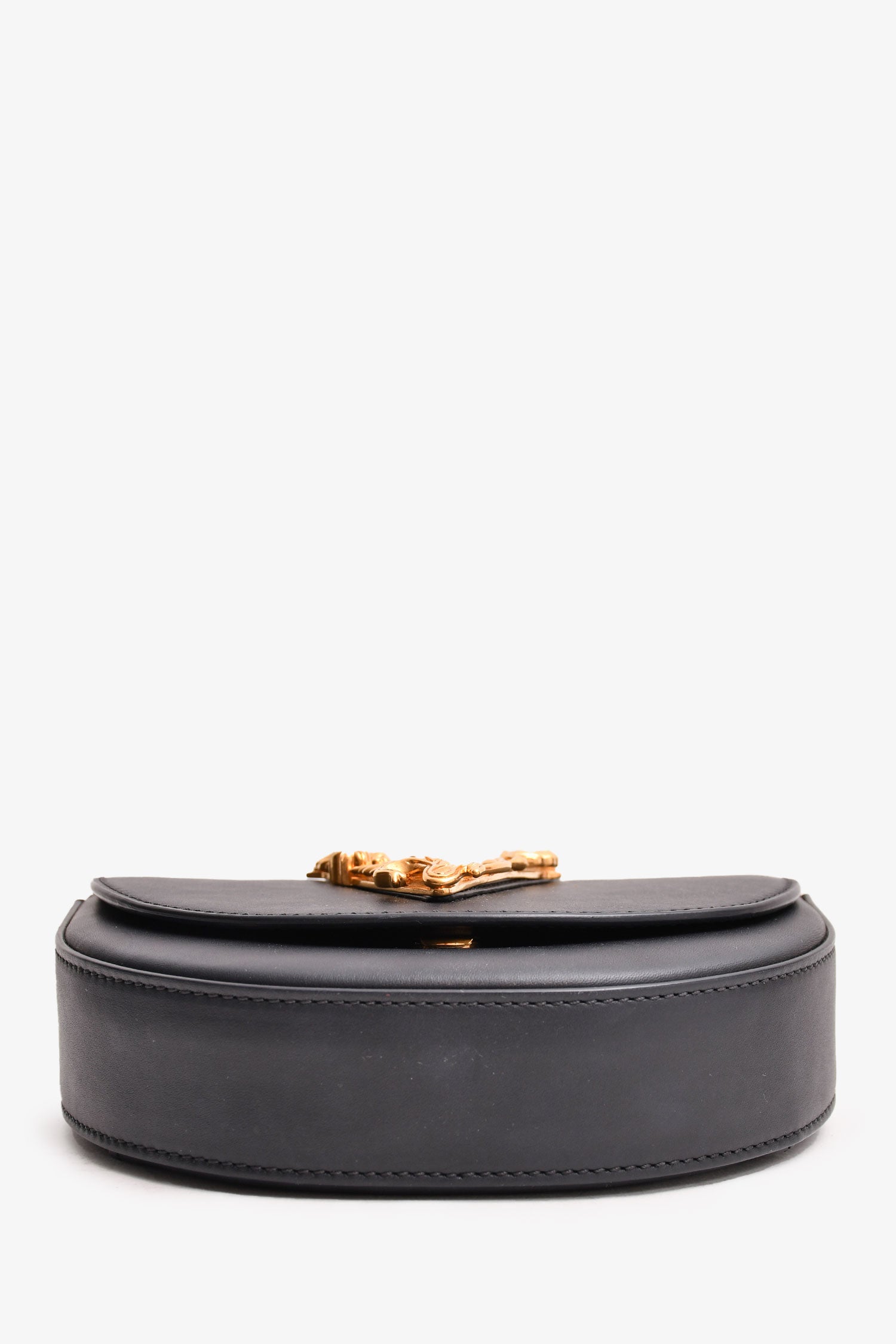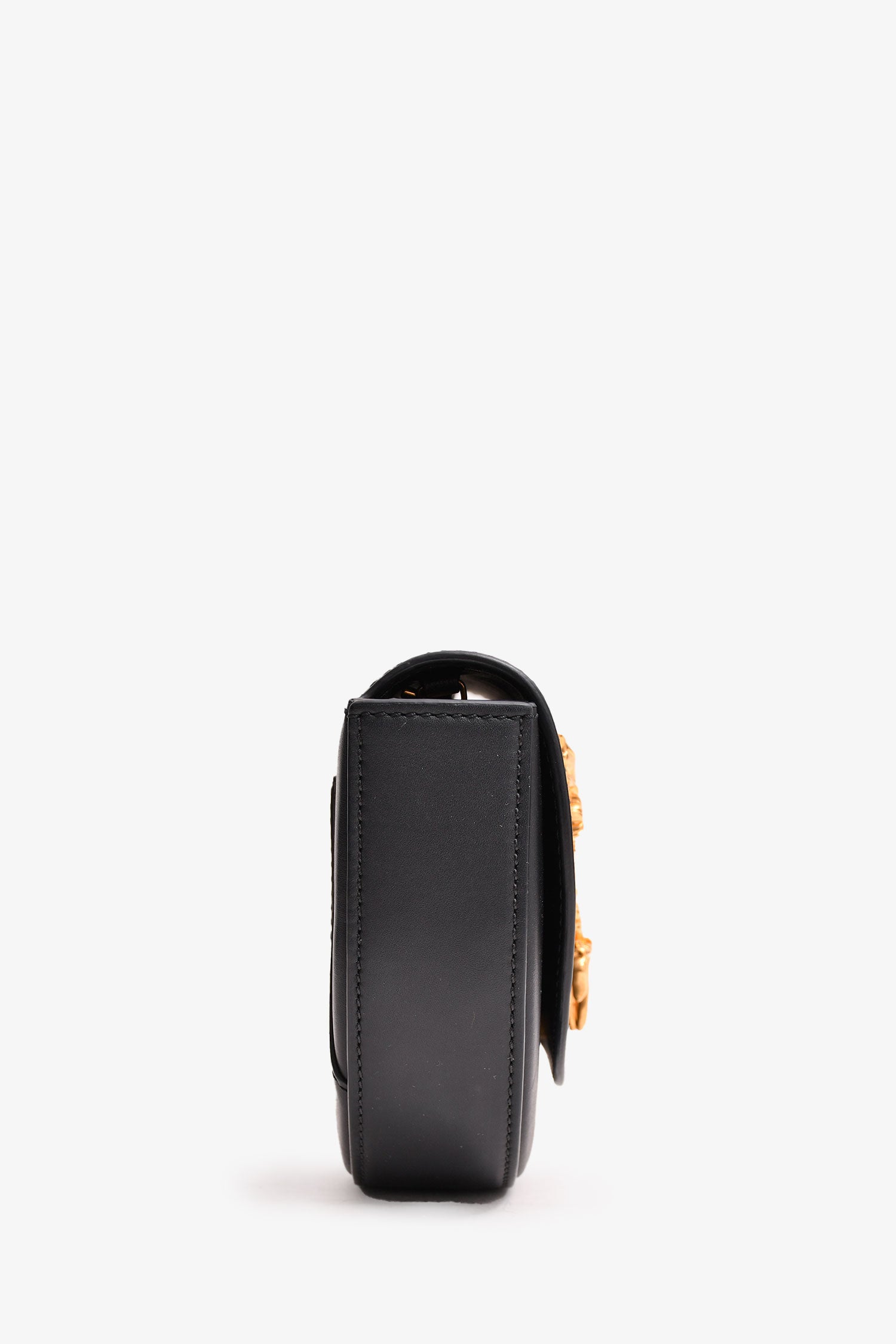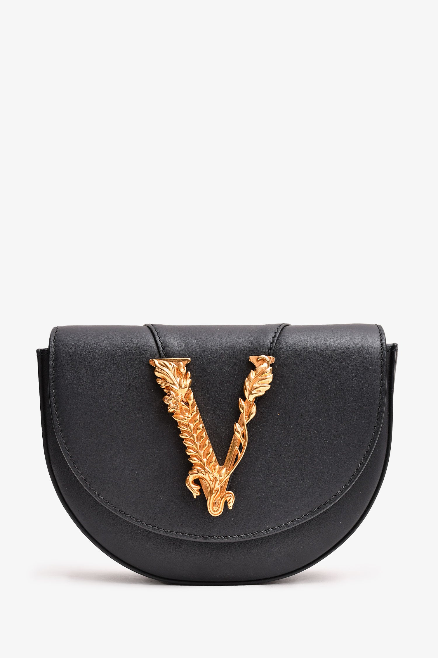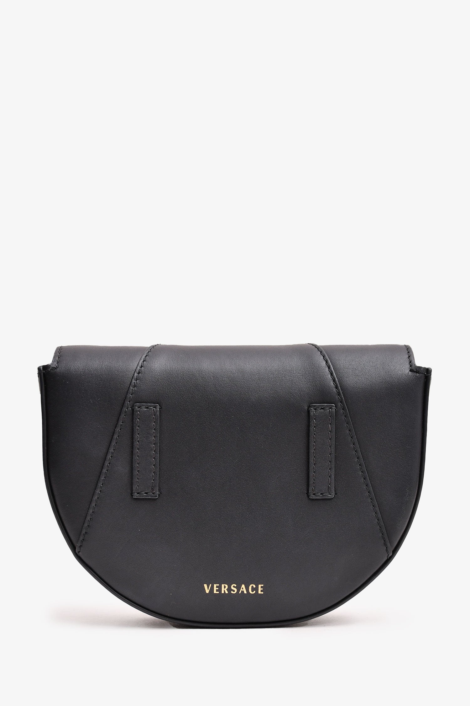Refresh availabilityVersace Black Leather 'Virtus' Convertible Crossbody/Belt Bag. Front flap with snap closure. Interior slip pocket. Gold-toned hardware. Tonal stitching.