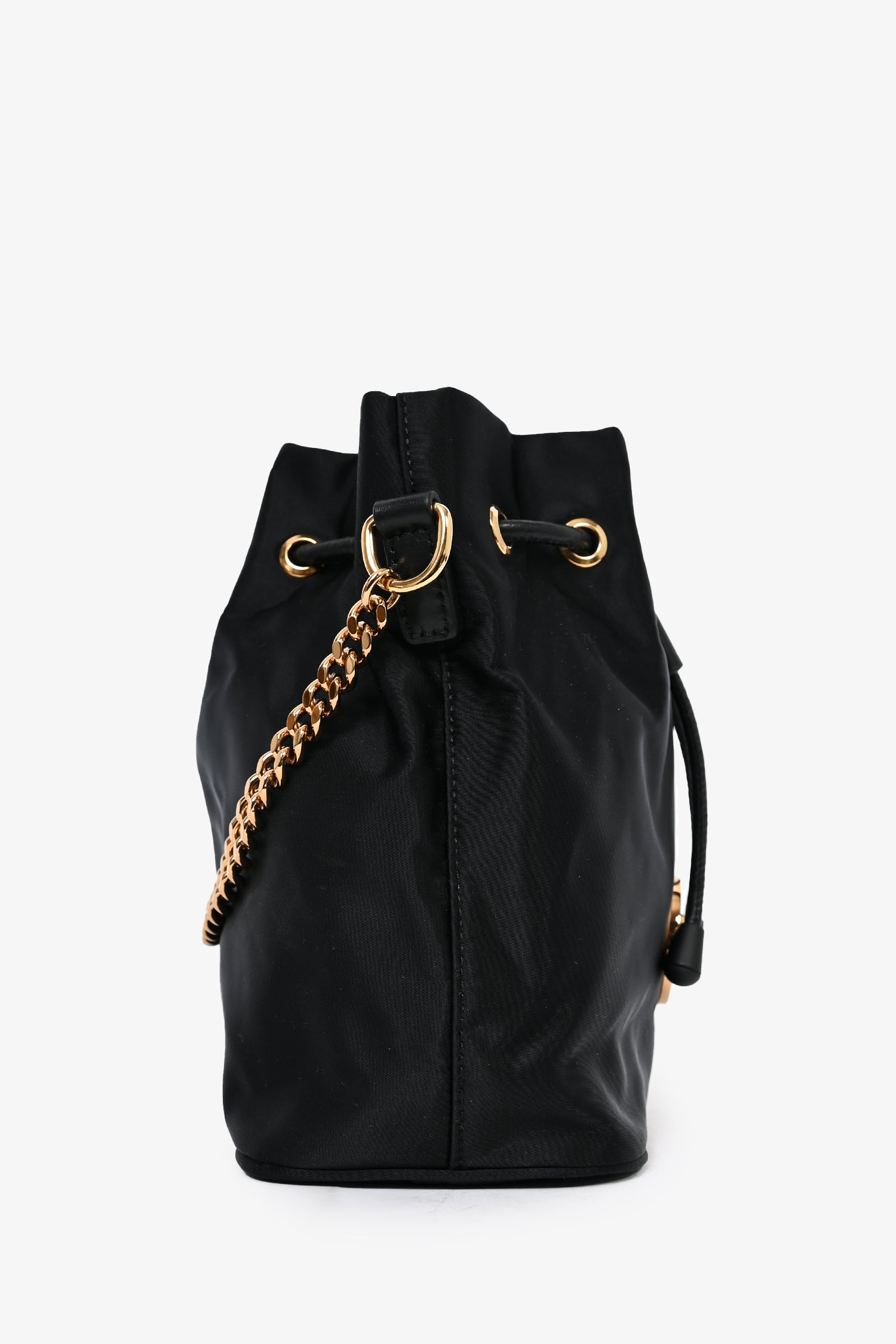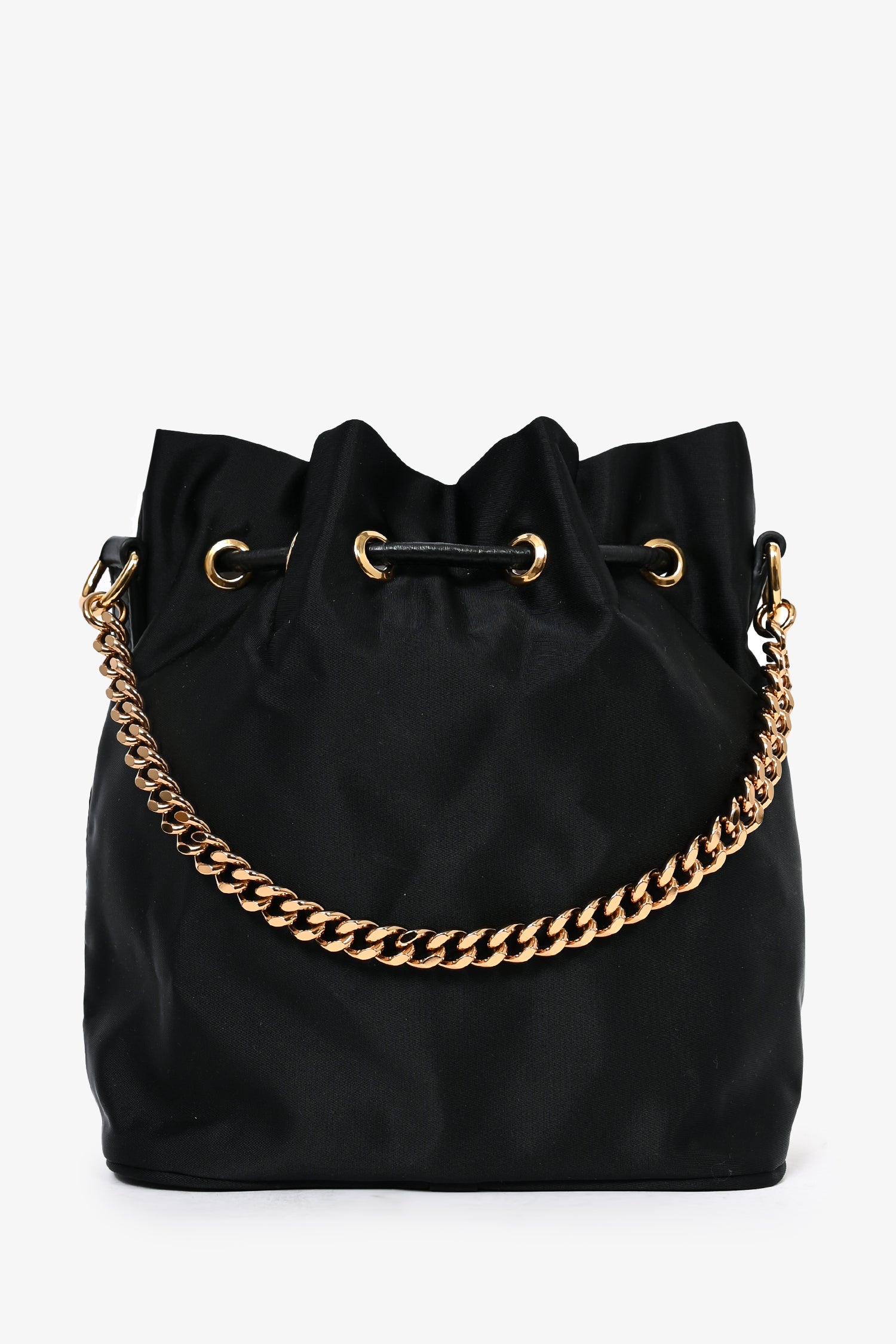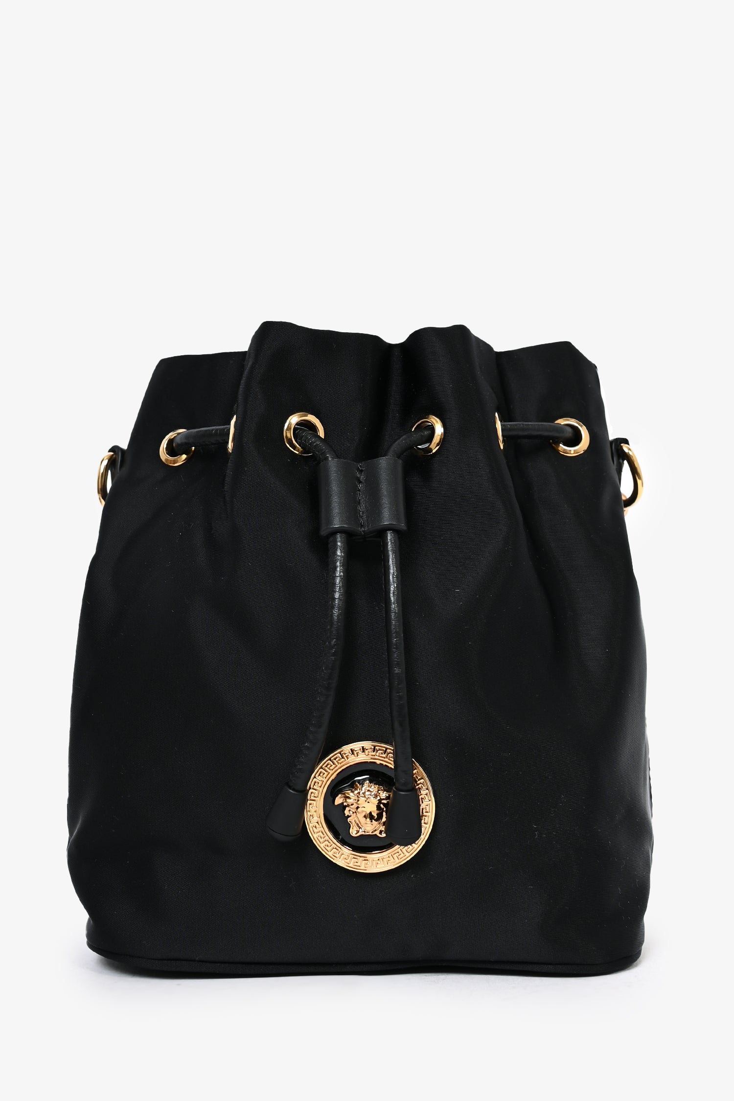 Refresh availabilityVersace Black Nylon Bucket Bag with Chain + Nylon Strap. Front drawstring closure. Detachable straps. Front logo hardware emblem. Gold-tone hardware. Tonal stitching.