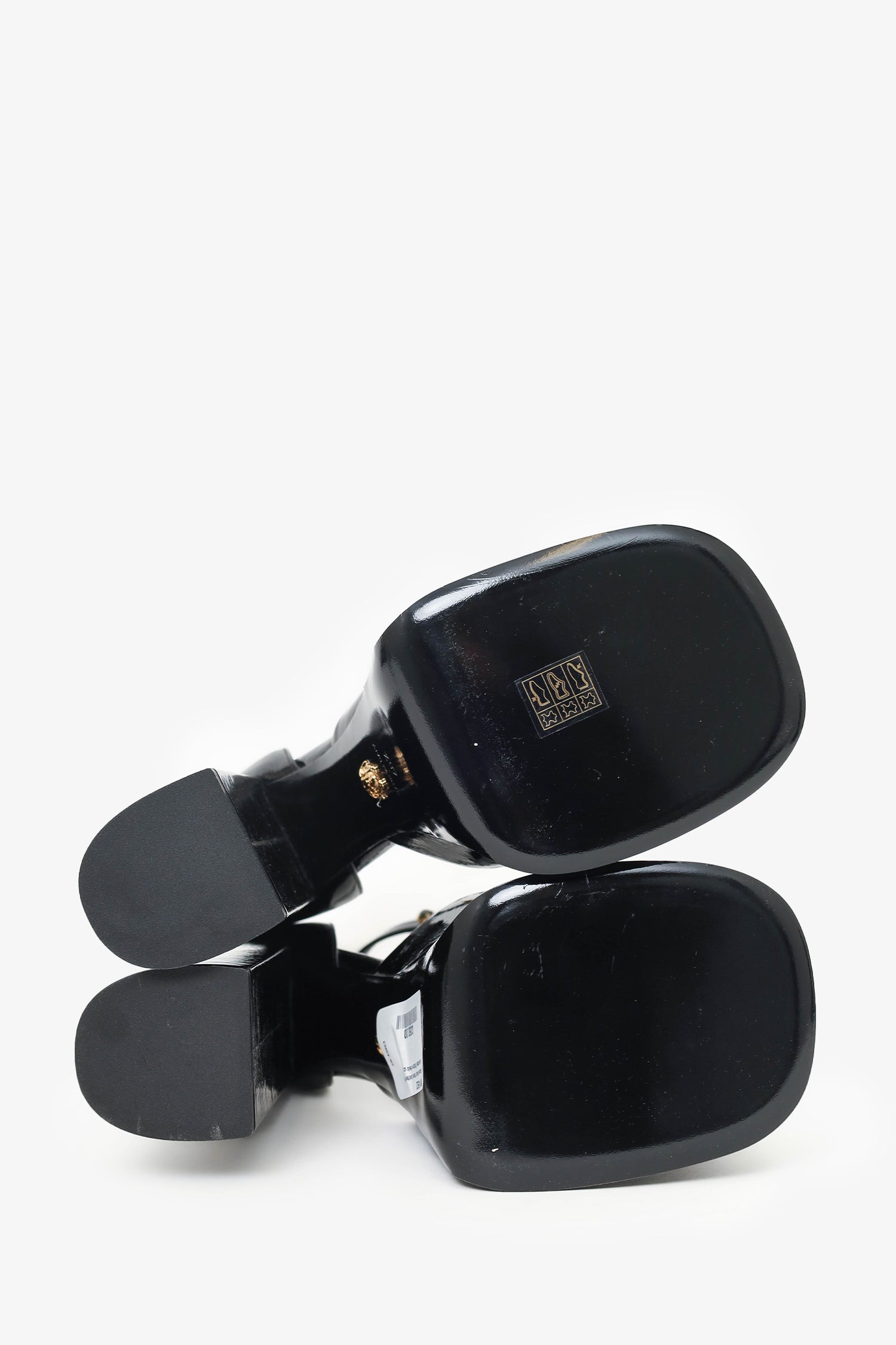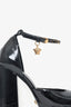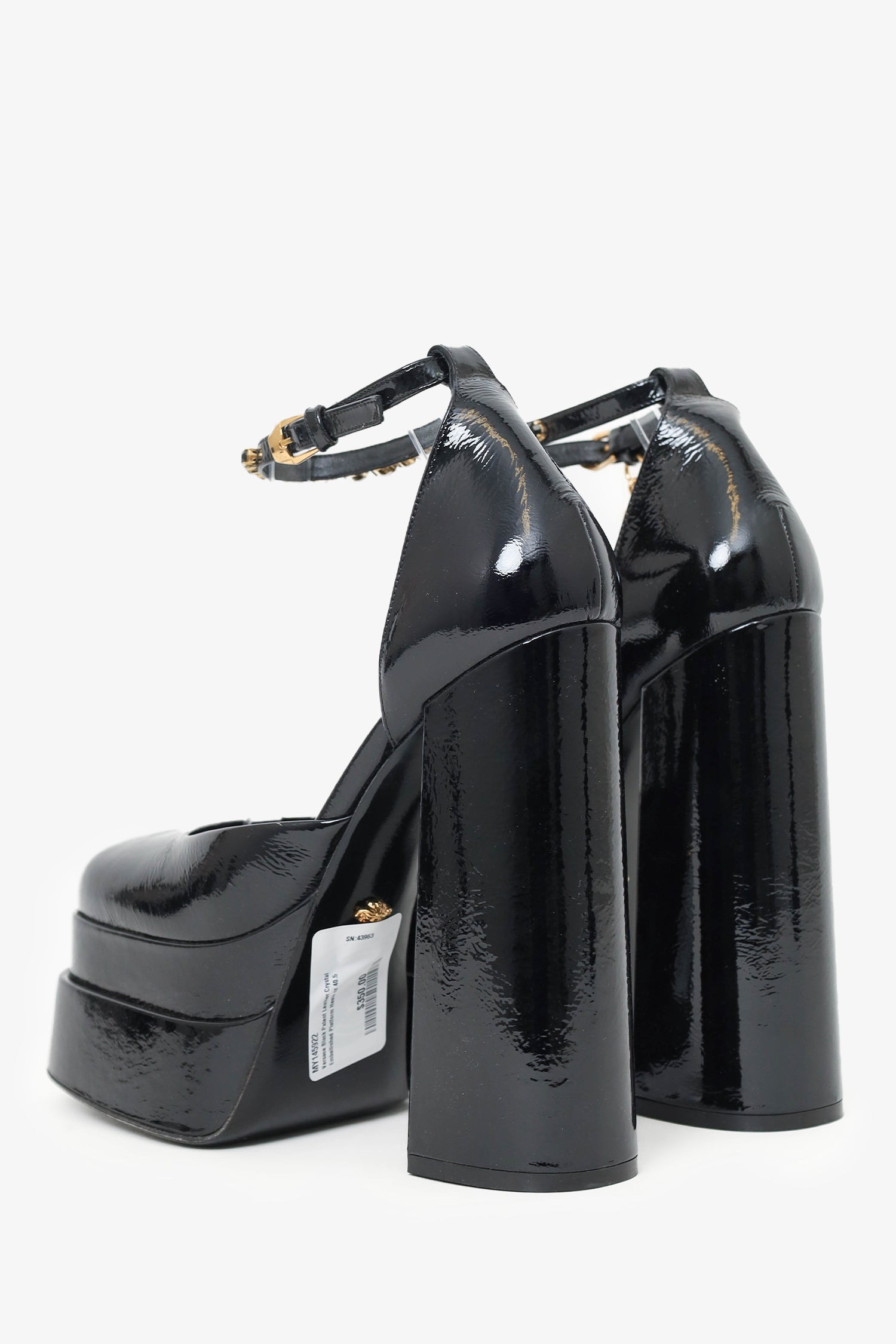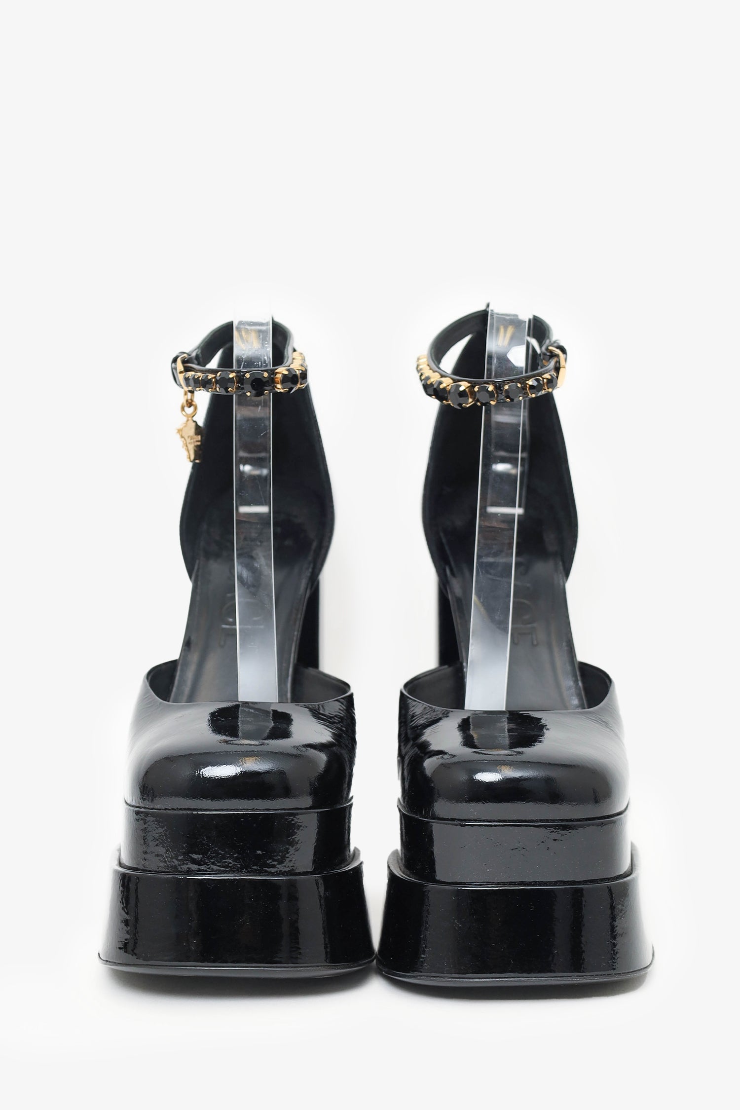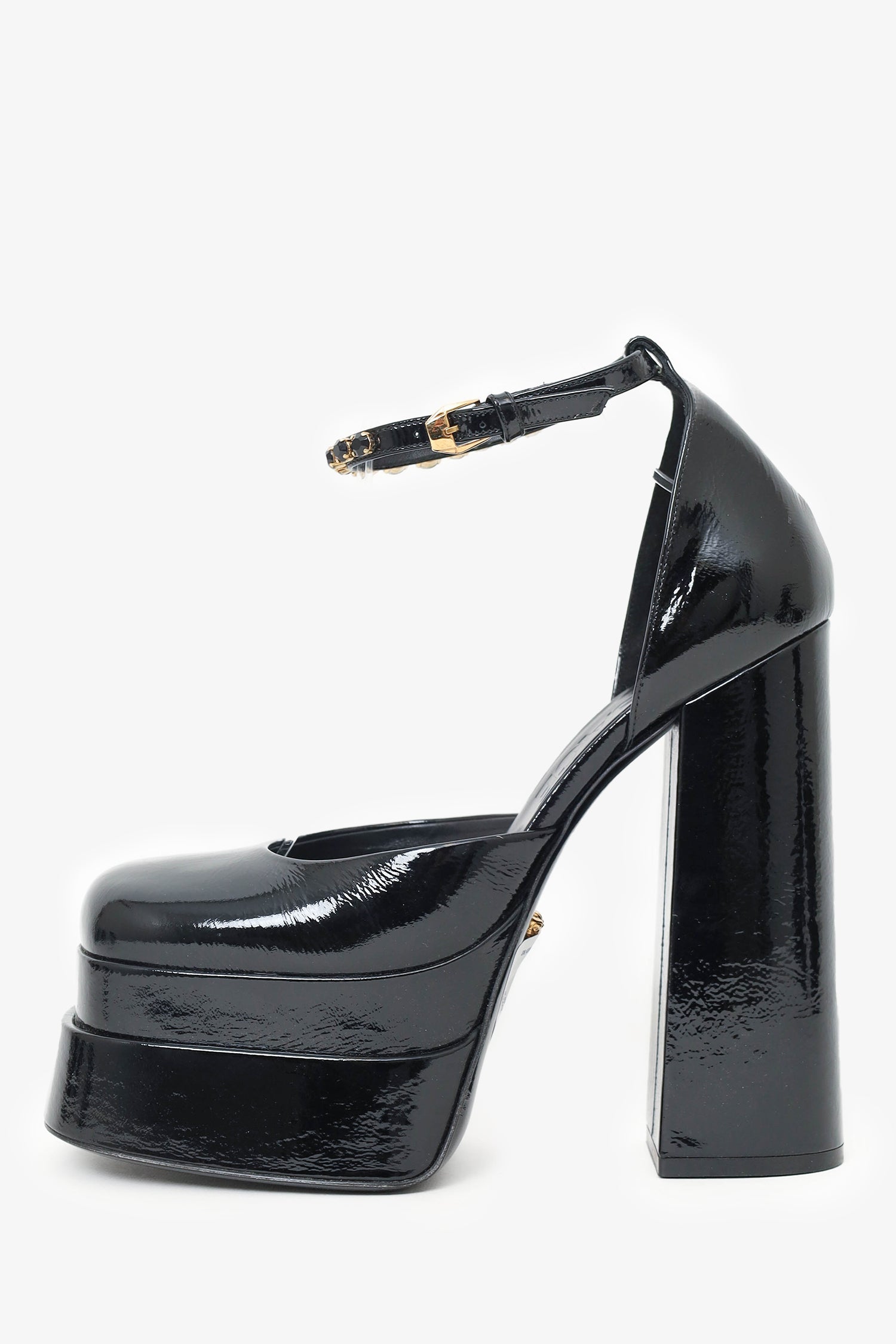 Refresh availabilityVersace Black Patent Leather Crystal Embellished Platform Heels. Rounded square toe. Gold-tone hardware. Ankle buckle closure. Tonal stitching.
