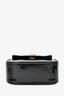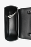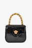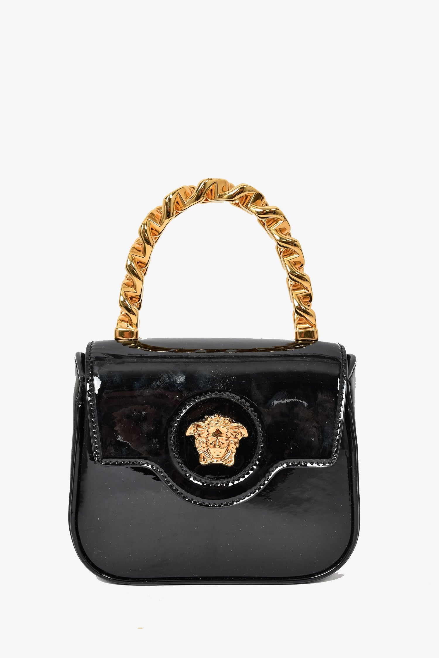 Versace Black Patent Medusa Mini Top Handle. Front foldover flap with magnetic button closure. Three interior card slots. Gold-tone hardware. Tonal stitching.