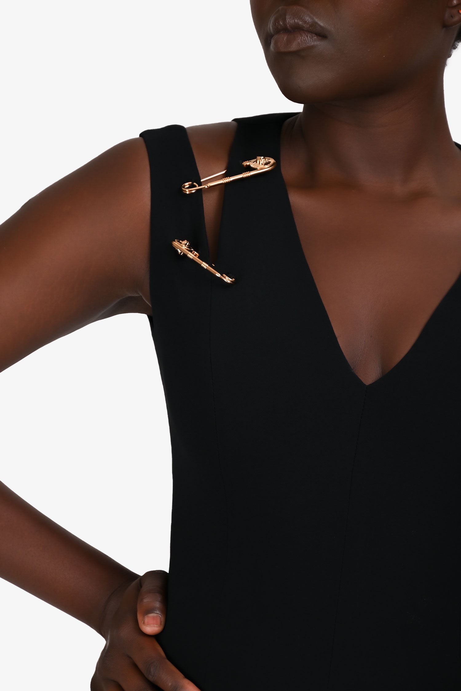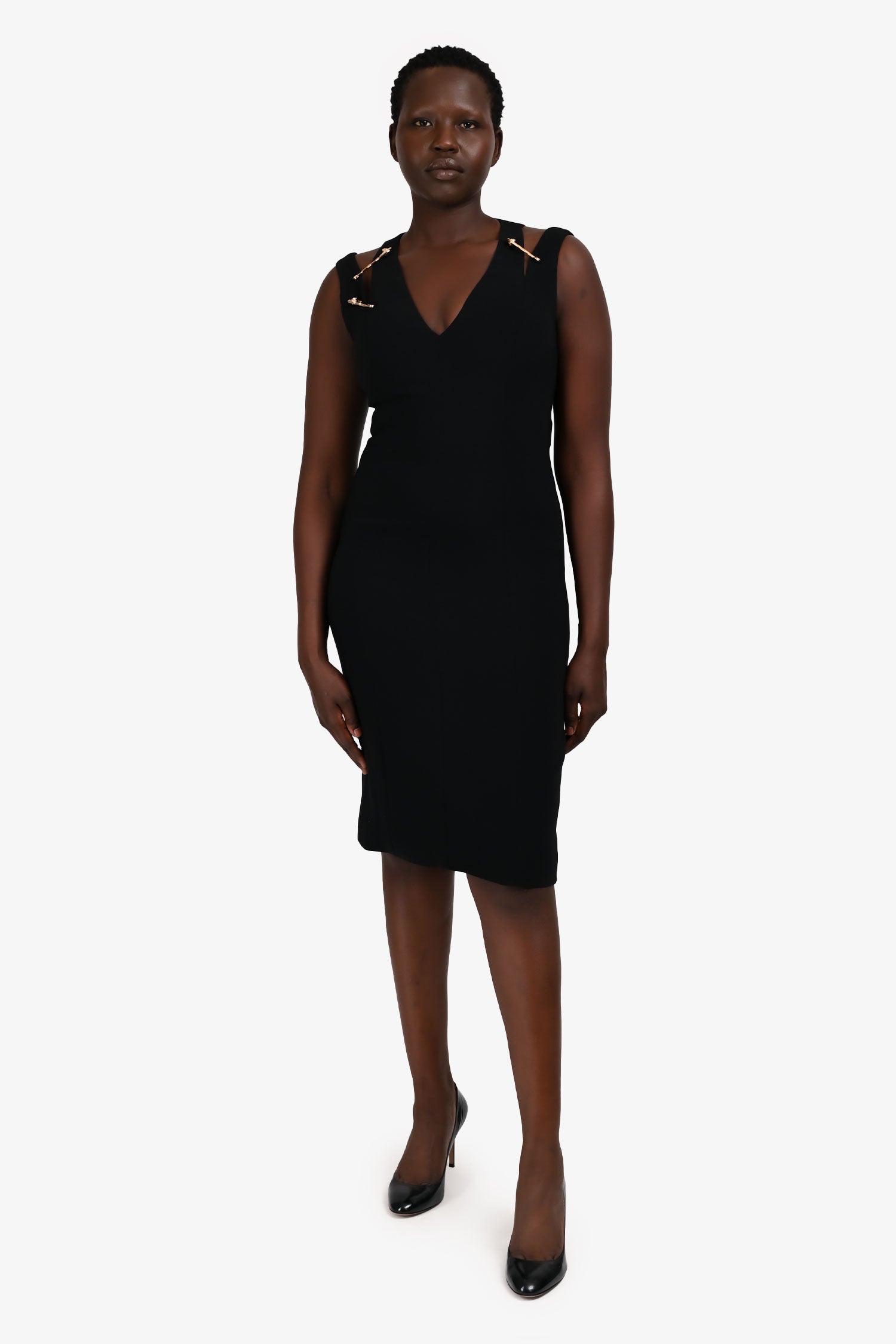 Refresh availabilityVersace Black Sleeveless Safety Pin Midi Dress. Slip-on. V-neck. Rear zip and hook closure. Tonal stitching.