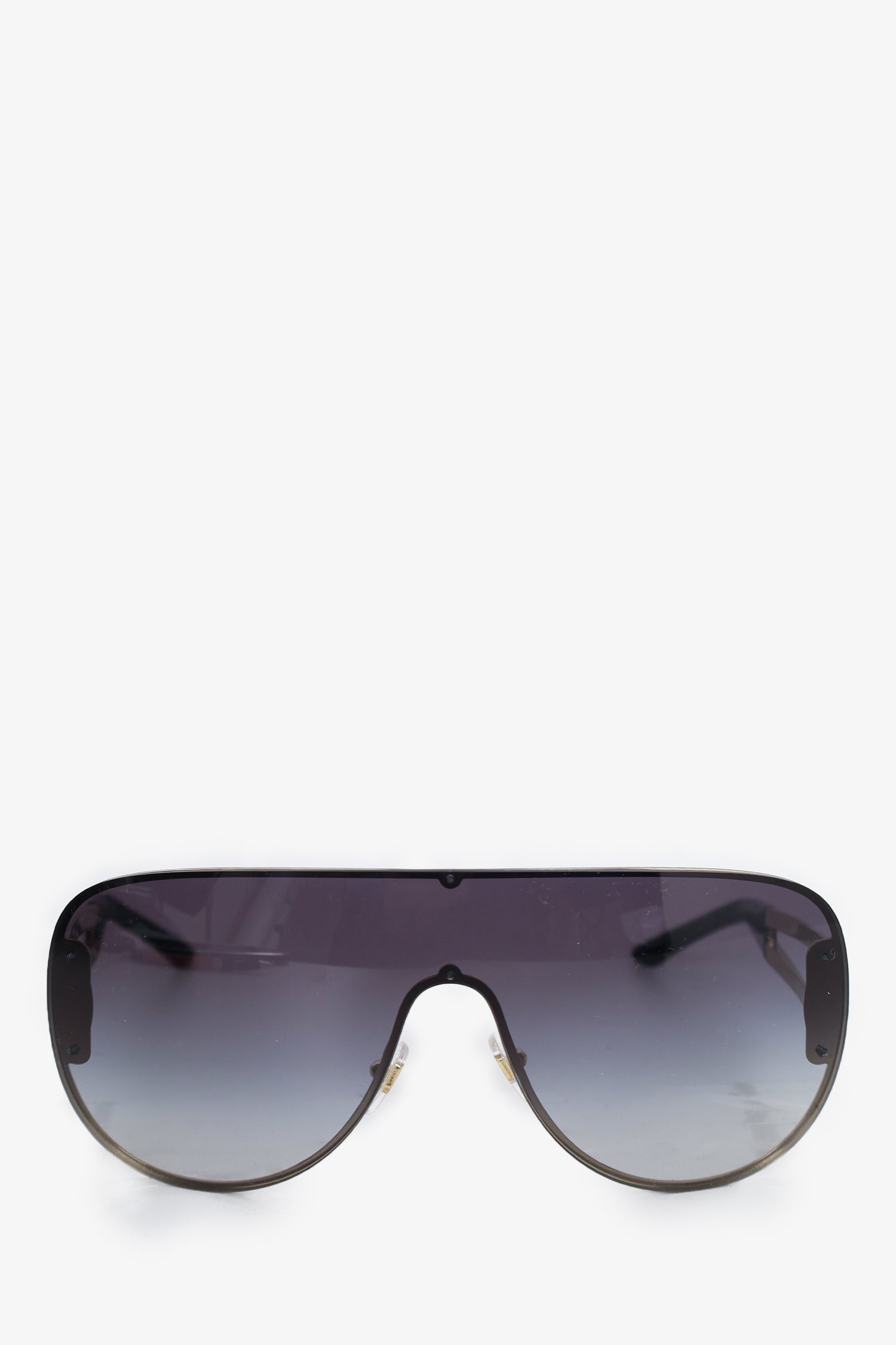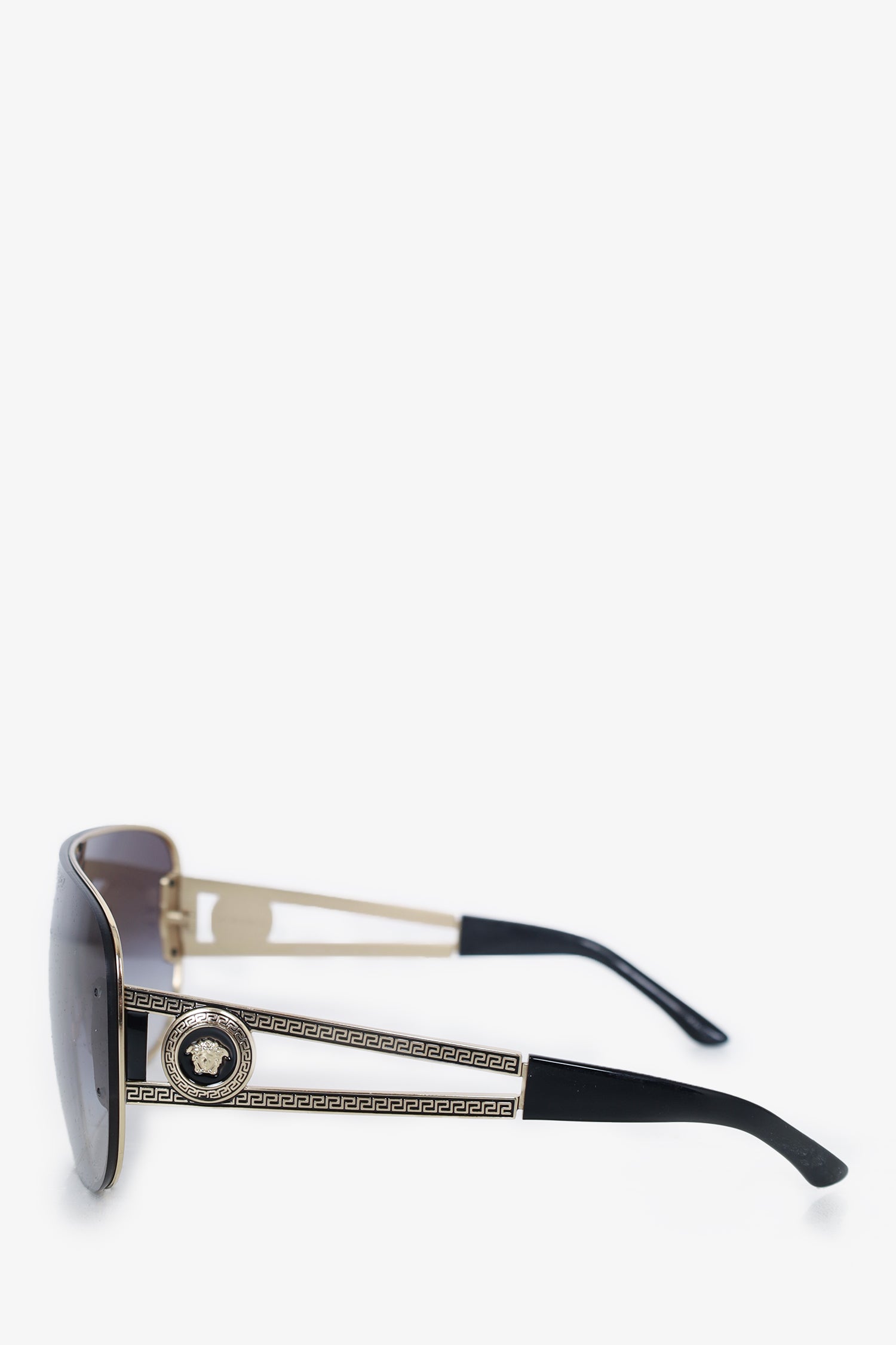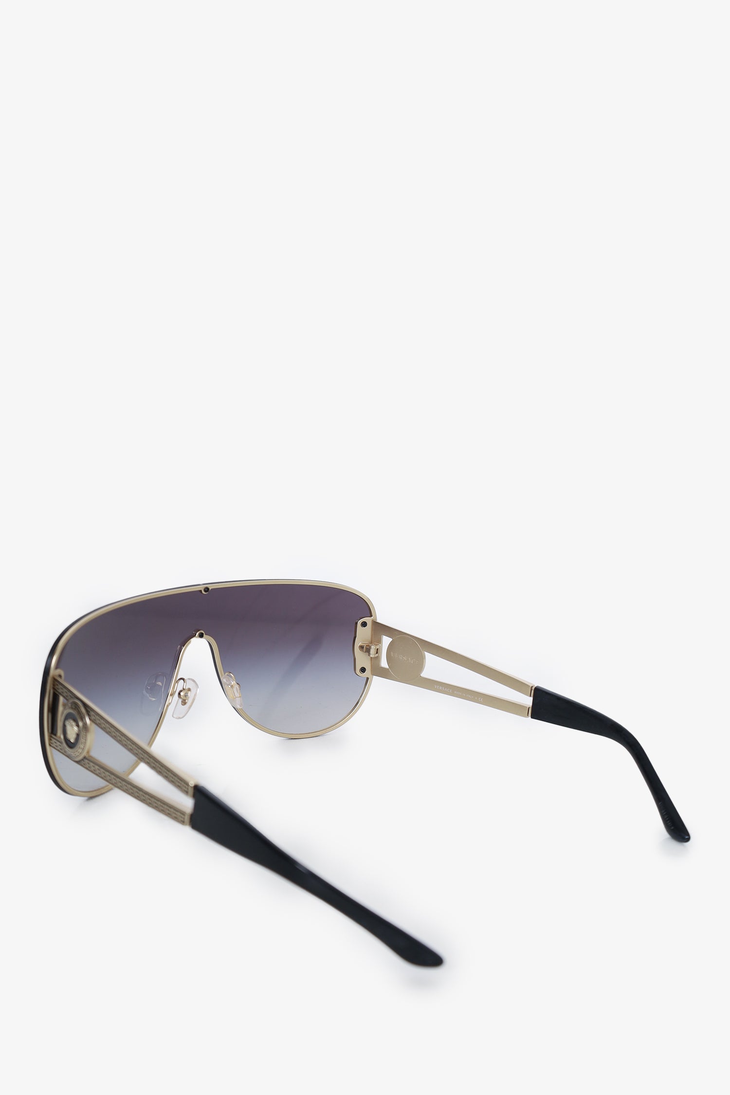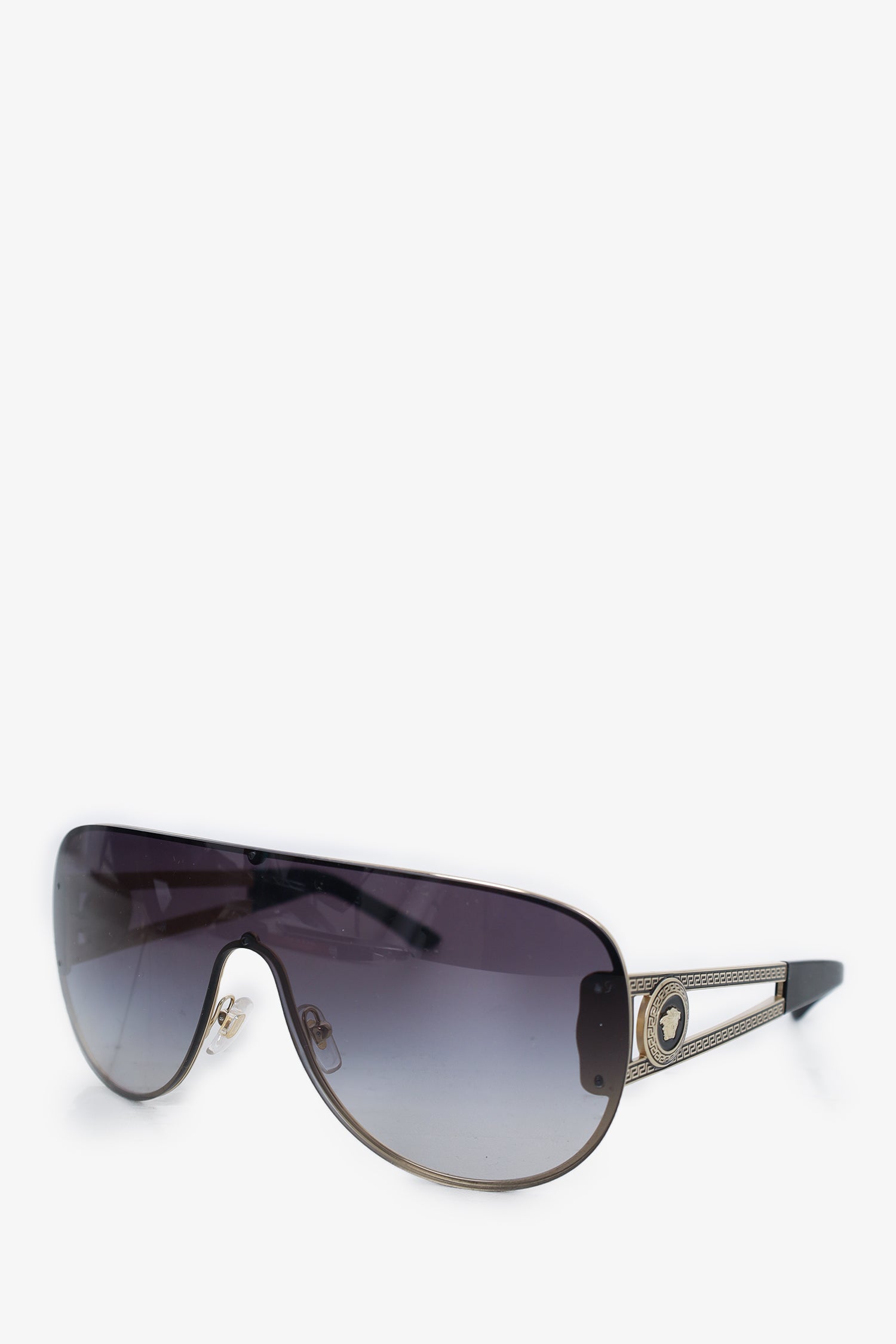 Refresh availabilityVersace Black Tinted Wide Sunglasses with Silver Medusa. Adjustable nose pads. Gold tone hardware.