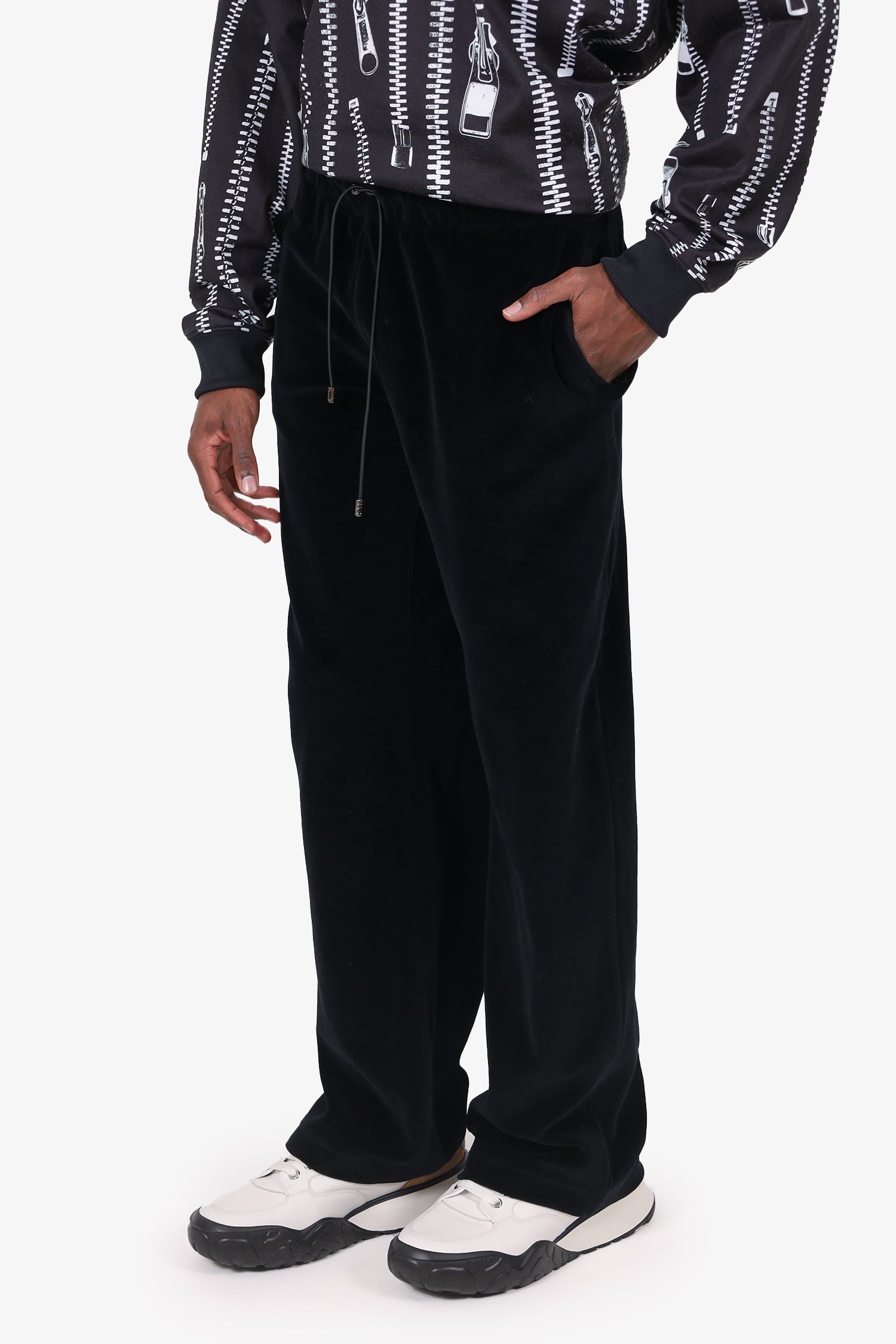 Refresh availabilityVersace Black Velour Pants. Pull-on. Elasticated waistband with drawstring closure. 2 exterior side slip pockets. Palladium-tone hardware. Tonal stitching.