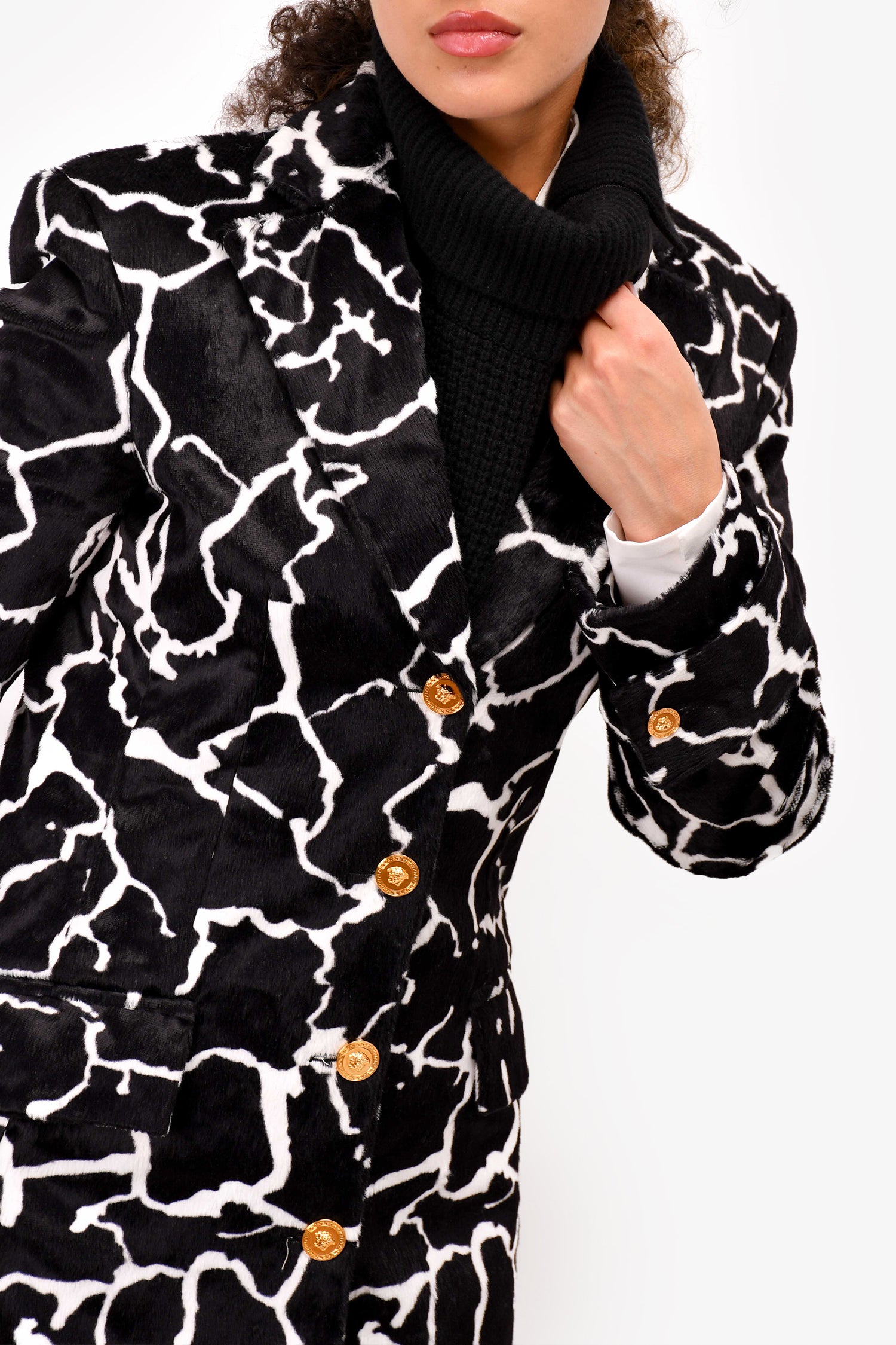 Refresh availabilityVersace Black/White Cow Print Long Coat. Gold-tone hardware. Tonal stitching. Lined interior. 2 front pockets.