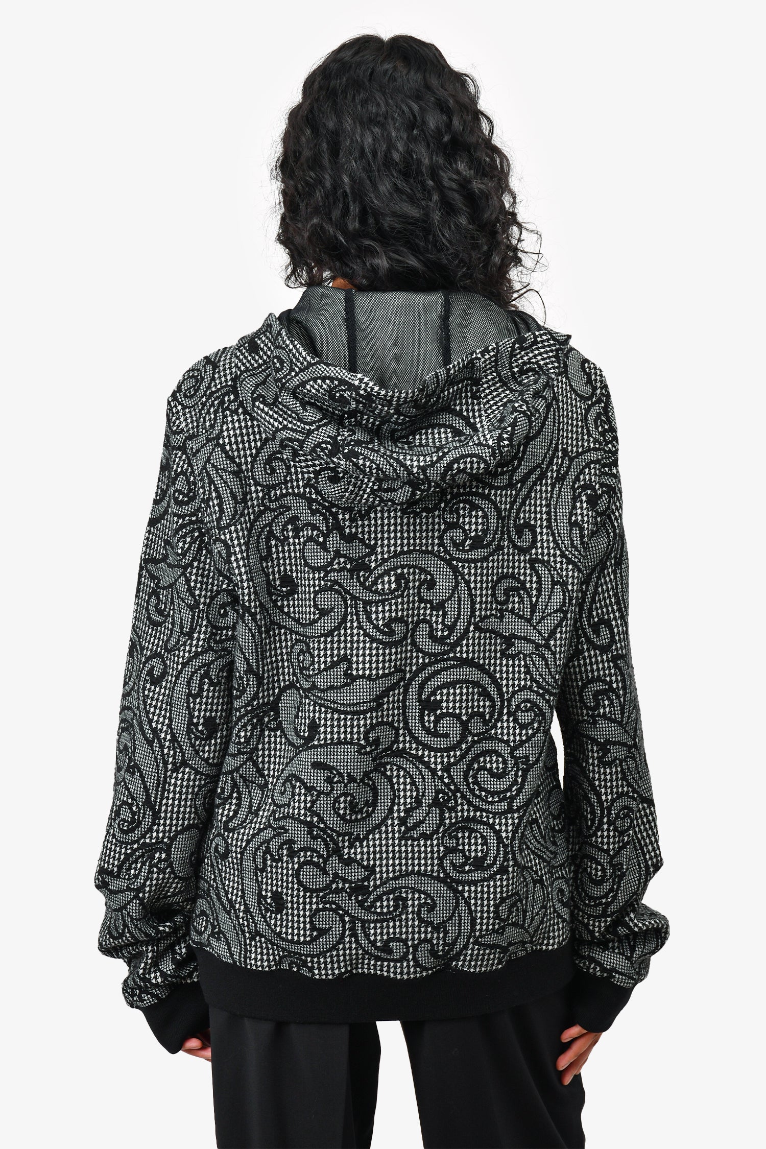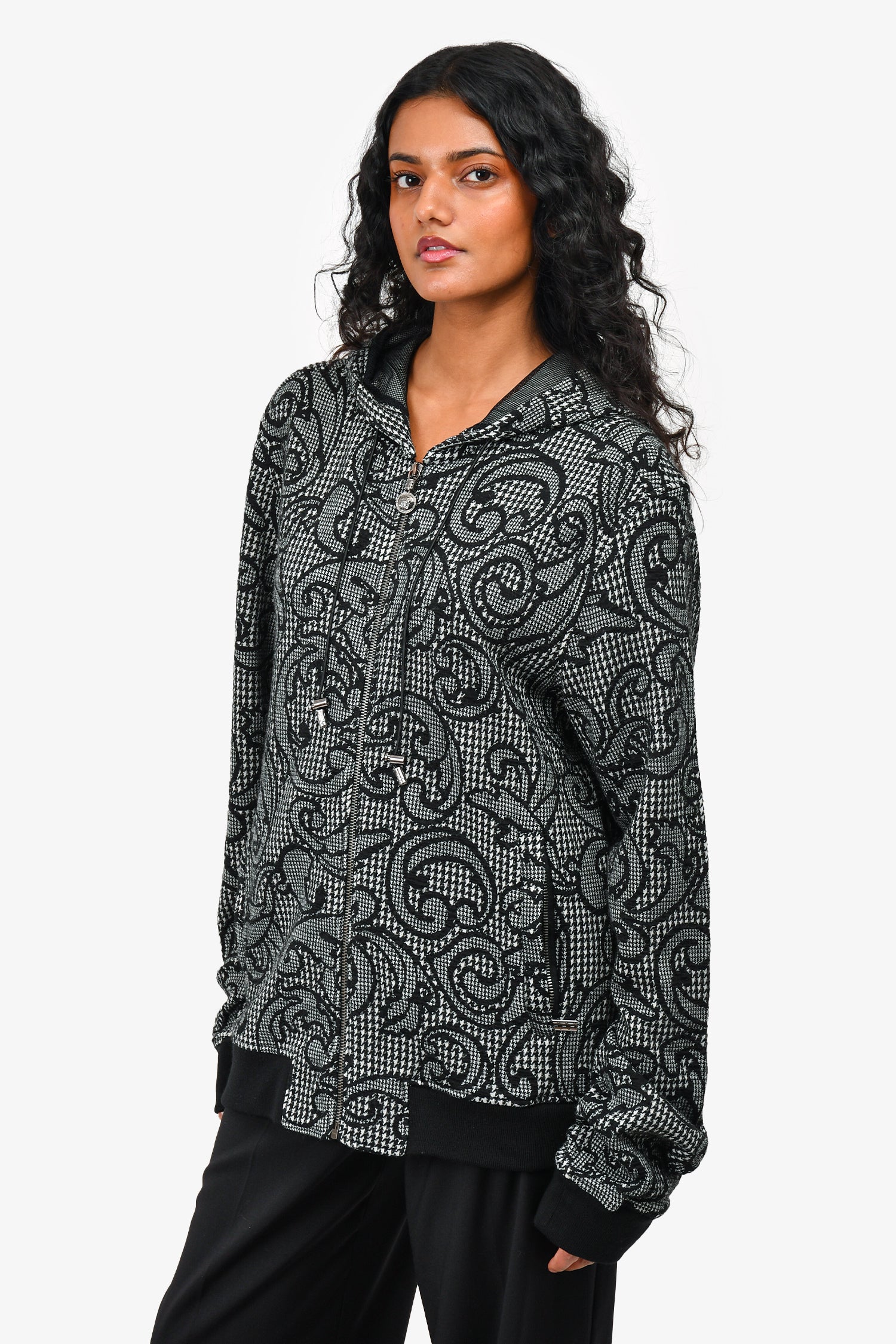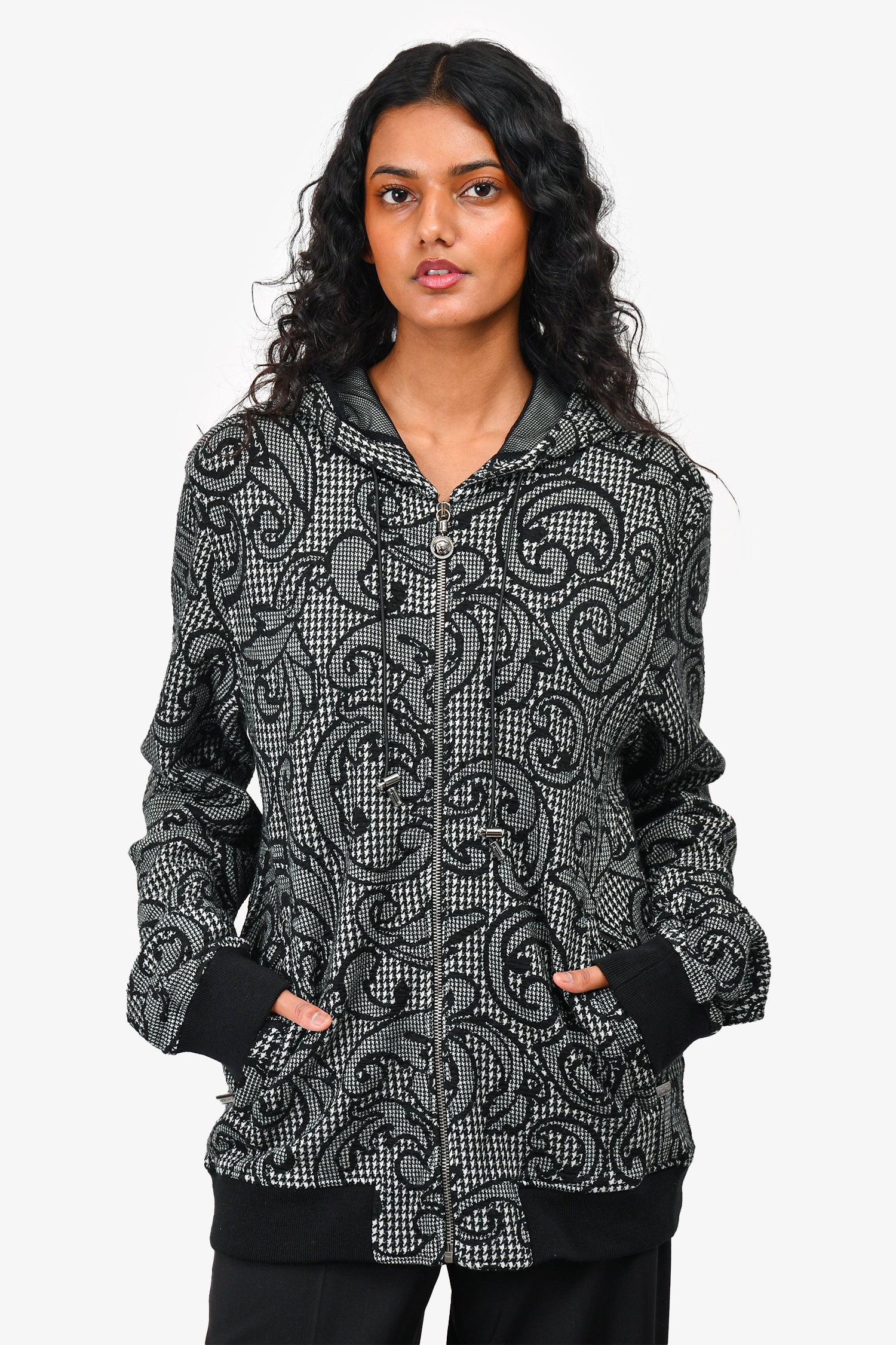 Refresh availabilityVersace Black/White Patterned Zip Up Hooded Jacket. 2 front slip pockets. Tonal stitching. Zipper closure. Gunmetal-tone hardware. Mesh lined.