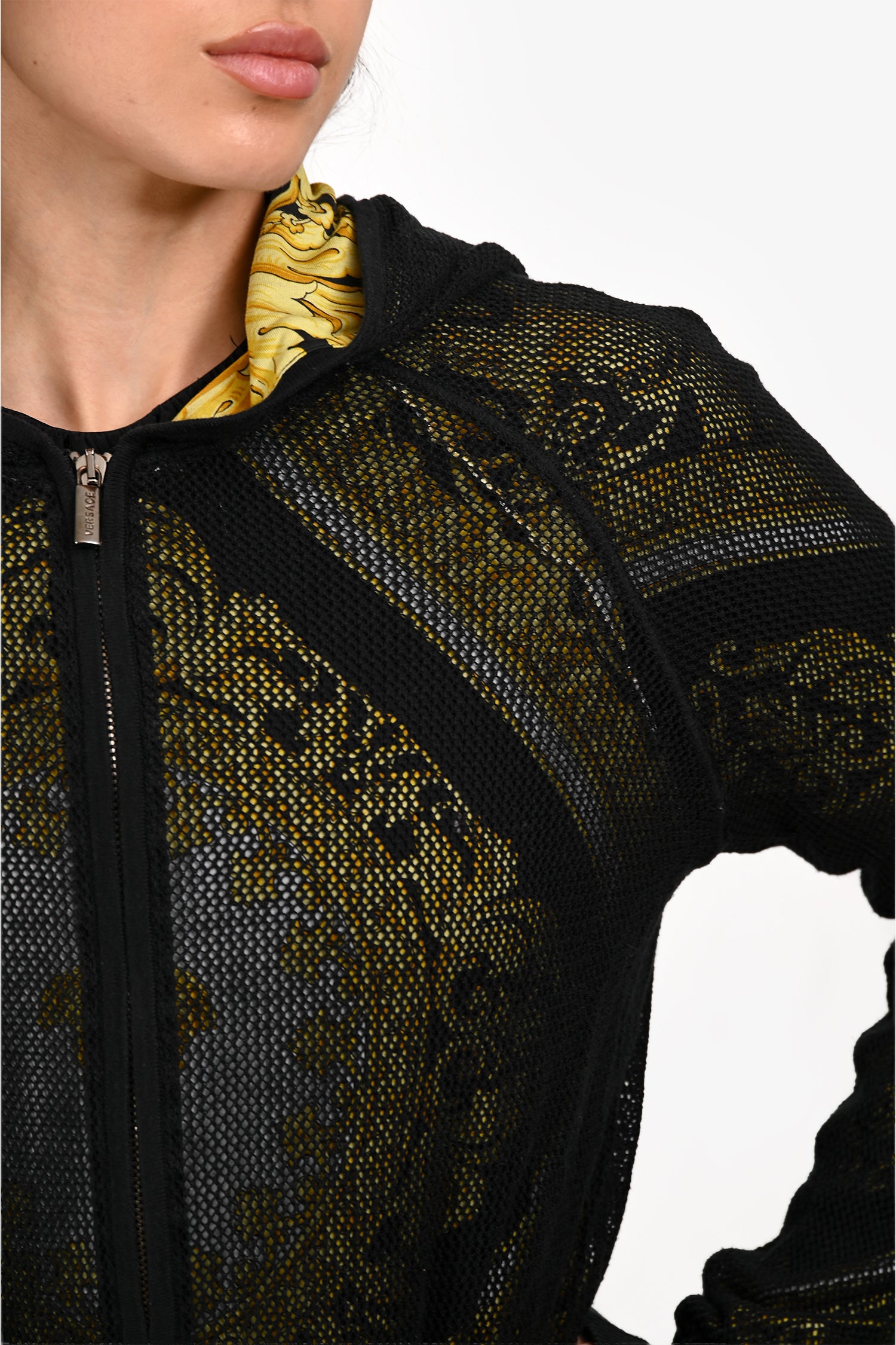 Refresh availabilityVersace Black/Yellow Mesh Baroque Zip Up Hoodie. Ribbed cuffs and hem. Silver-tone hardware. Tonal stitching.