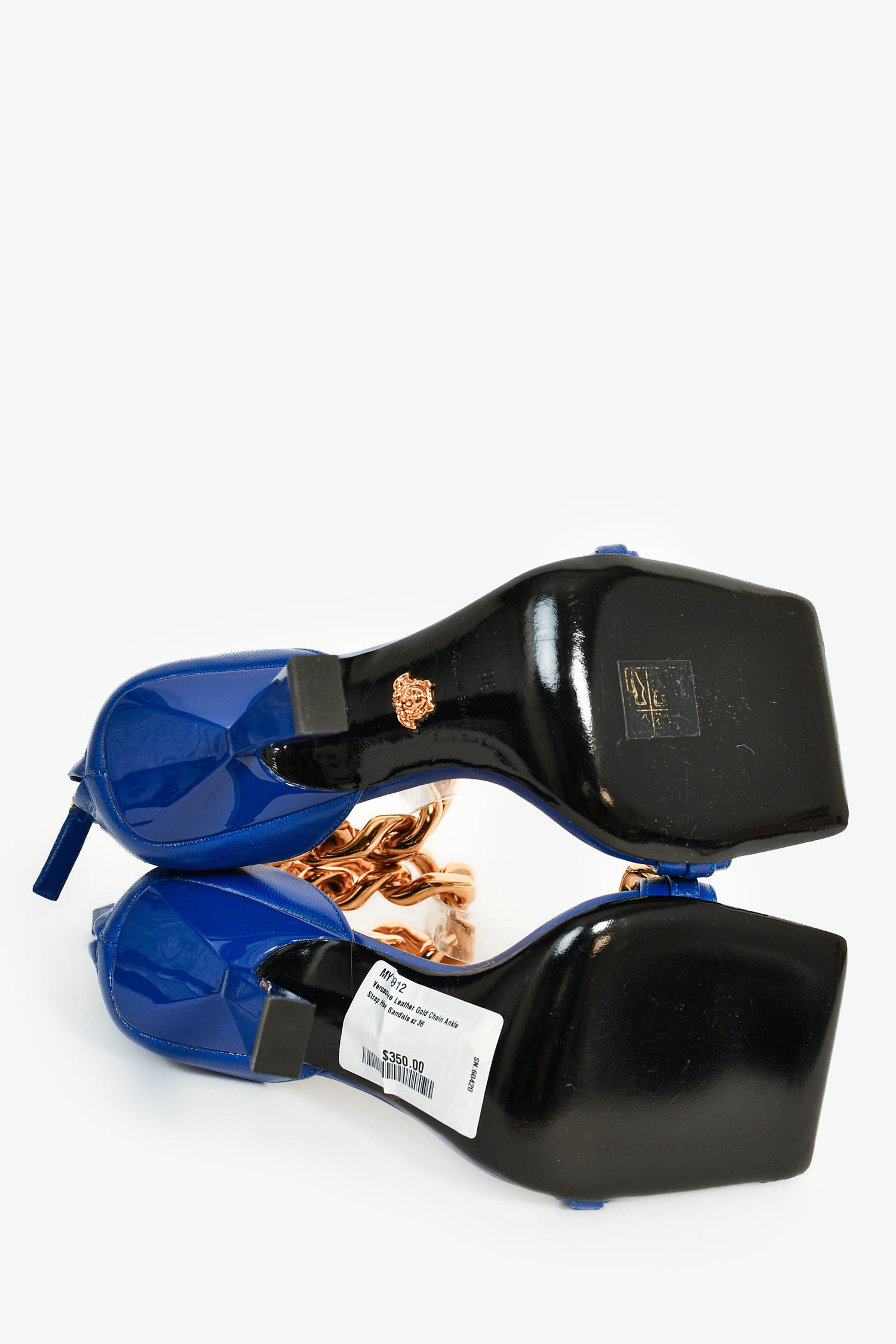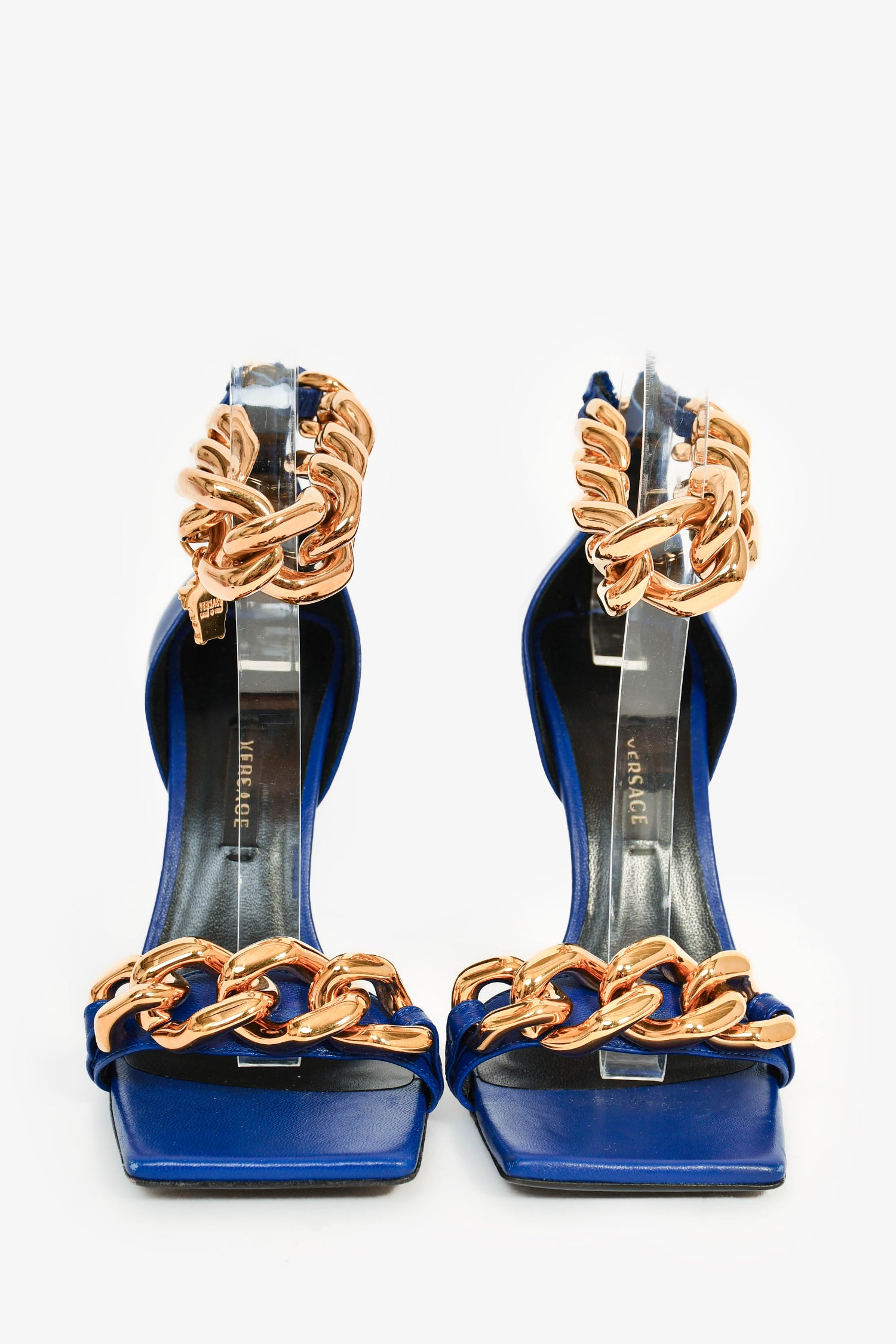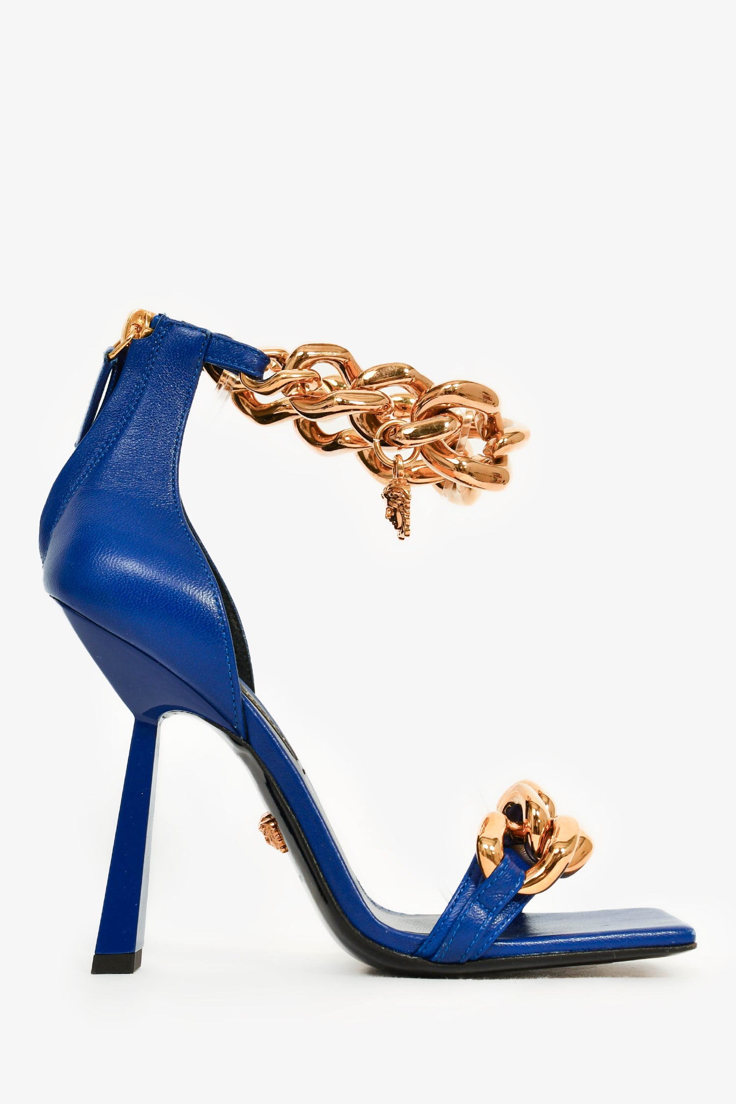 Refresh availabilityVersace Blue Leather Gold Chain Ankle Strap Heeled Sandals. Open toe. Slip-on. Elasticized ankle chain strap. Gold-tone hardware. Tonal stitching.