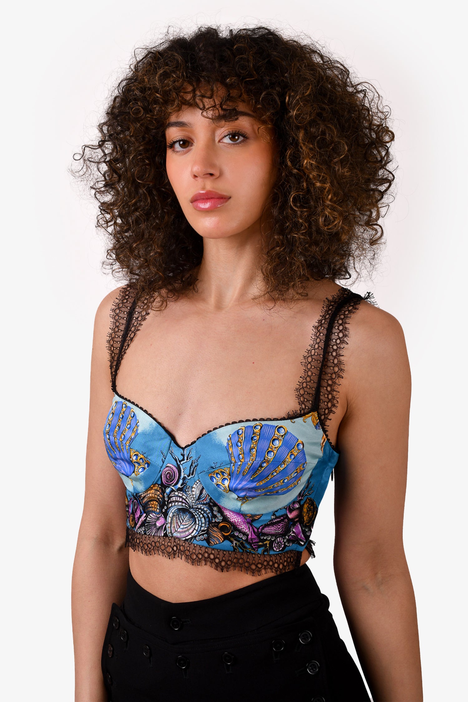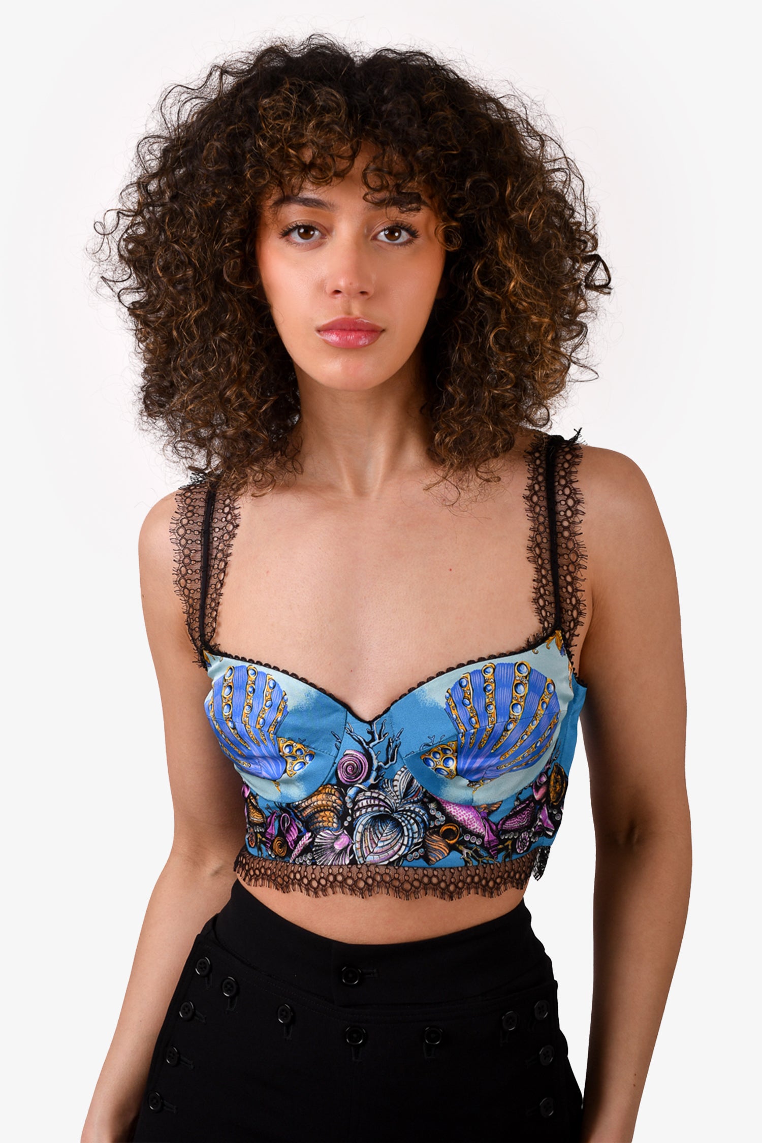 Refresh availabilityVersace Blue Silk Lace Seashell Bralette Top Size 36. Side zip closure. Tonal stitching.