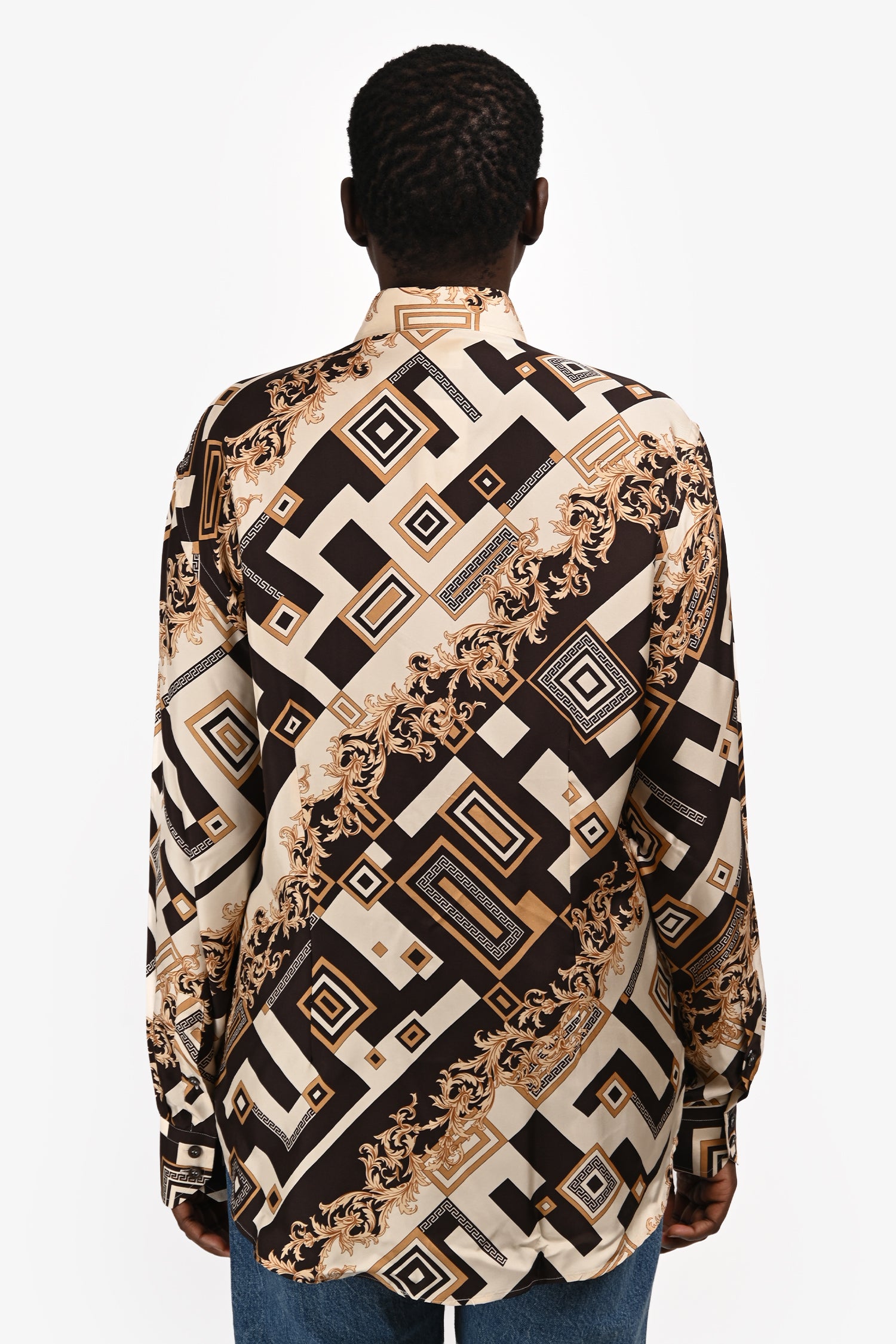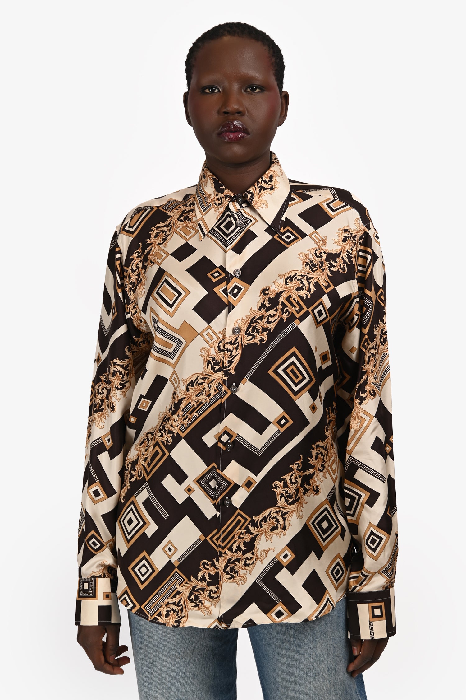 Refresh availabilityVersace Brown/Black Patterned Silk Button Up Blouse. Pull-on. Front button-up closure. Pointed collar. Cuffs with button-up closures. Tonal stitching.